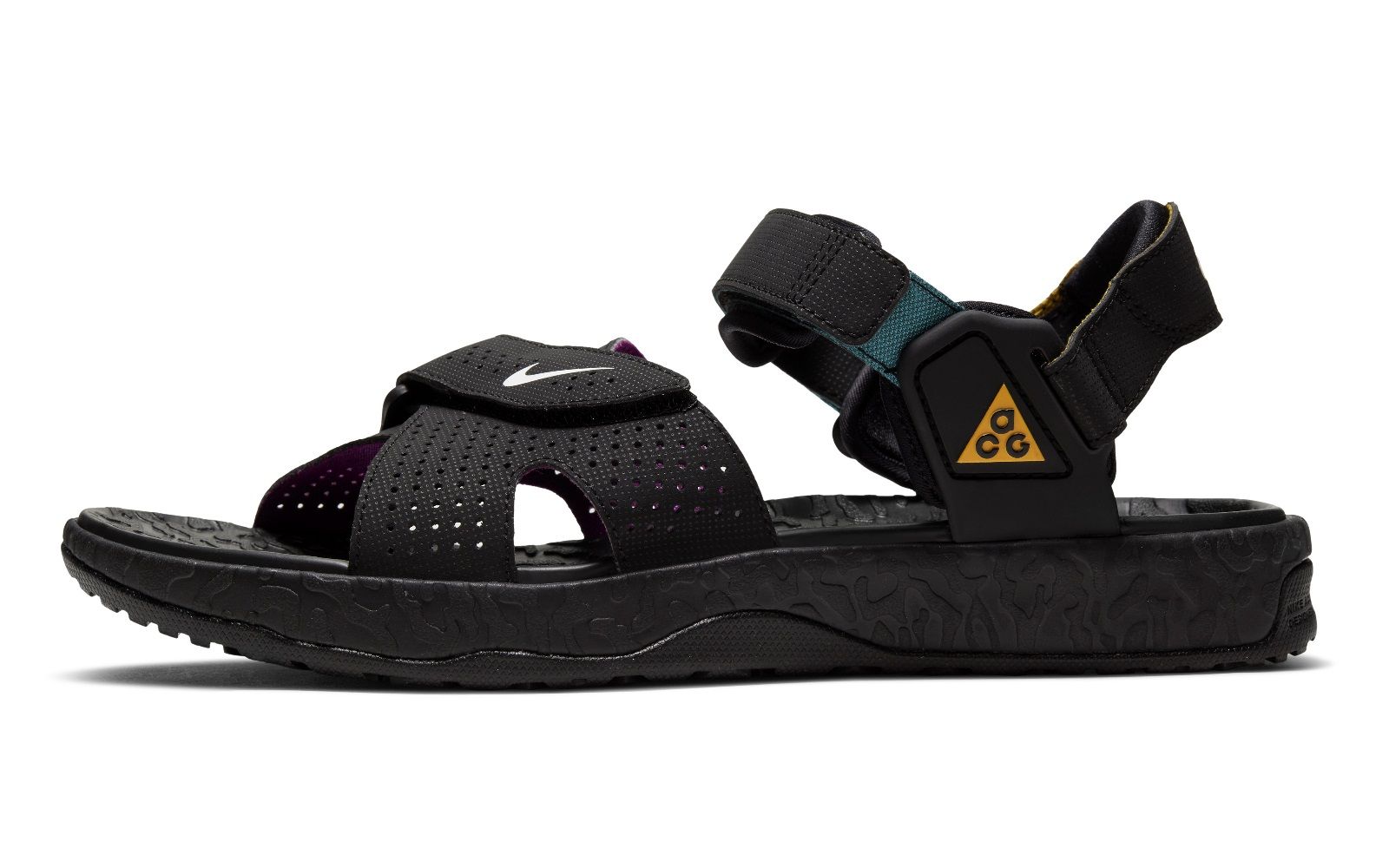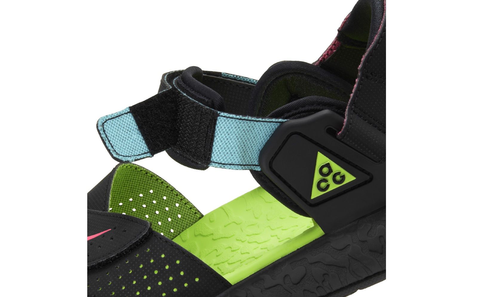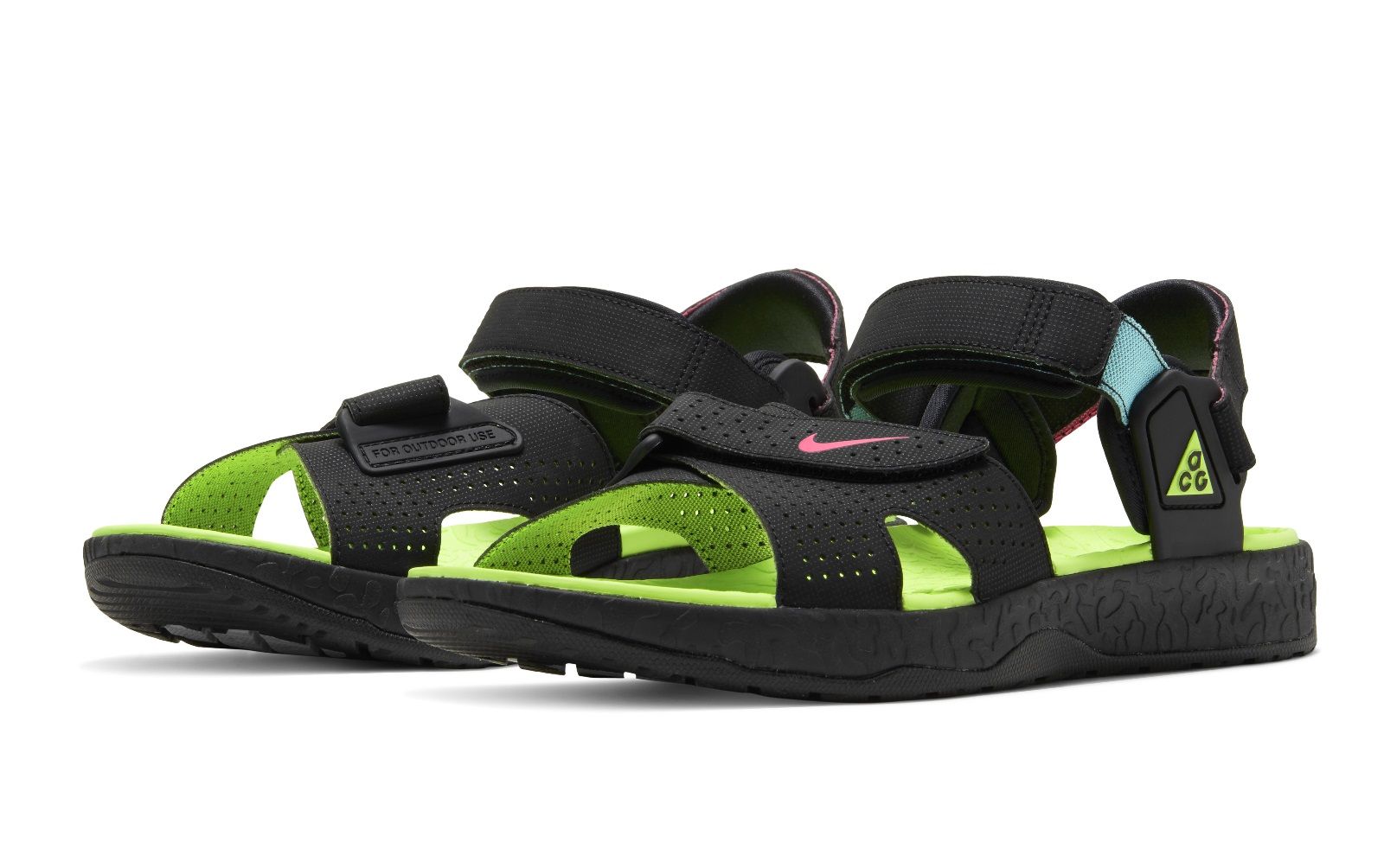 Anche la palette riprende i b tipici della linea ACG anni ’90. I sandali saranno realizzati in nero triplo, blu su nero, verde lime su nero con accenti rosa e in versione retrò con una base nera e dettagli in turchese, viola, giallo e bianco.