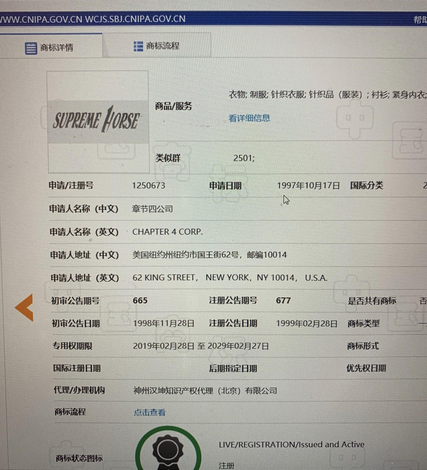 Nonostante la difficoltà nell'acceso ai dati dell'amministrazione cinese, la redazione di nss magazine è riuscita ad avere la prova che Chapter4 è il proprietario del marchio "Supreme Horse" brand registrato nel 1997, quando Supreme era ancora una realtà underground di New York e la società Chapter4 non era stata neanche fondata. Come si legge nei registri pubblici, "Supreme Horse" è stato infatti registrato dall'azienda Shenzhen Guanlan Songyuan Hefen Clothing Factory con sede a Shenzen.