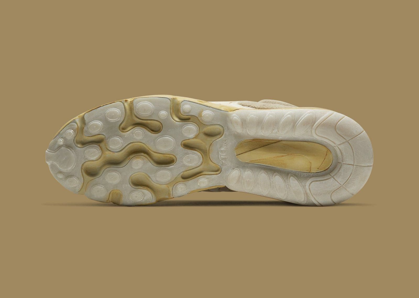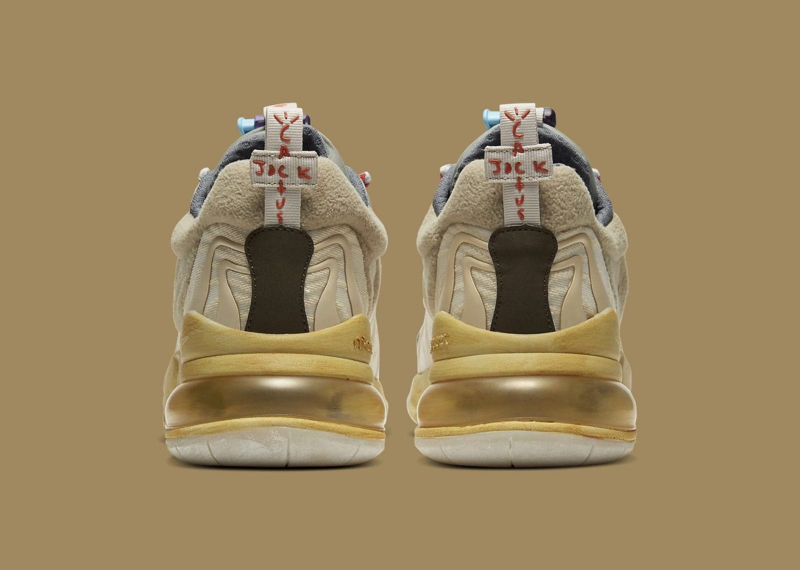 La tomaia è caratterizzata dall'uso di diversi materiali, tra i quali il fleece nella zona caviglia che dona un tocco di comfort. In oltre, l'upper vanta di un pattern ondulato che si estende fino nell'intersuola. Completano il design un mini Swoosh, un sistema di allacciatura lace locks e il logo Cactus Jack nella soletta e sui tabs dei talloni. Il blocco suola, invece, presenta la tecnologia React, unita al comfort dell'unità Air 270.