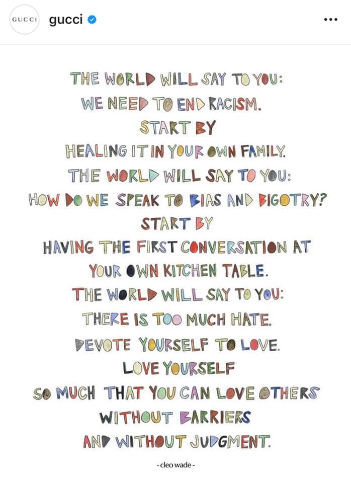 Dopo essere stato criticato per aver lanciato la campaign per una nuova borsa nel crescendo delle proteste, anche Louis Vuitton ha scelto Instagram per fare uno statement ben preciso: un video commissionato da Virgil Abloh, accompagnato dal messaggio “Make a change. Freedom from racism towards peace together. #BlackLivesMatter.” Tra gli altri luxury brand che hanno preso posizione, ci sono stati anche Gucci che ha condiviso le parole della scrittrice Cleo Wade, 1017 Alyx 9SM che ha invece mostrato una delle sue prime grafiche contro il razzismo ma anche Jacquemus, Fendi, Valentino, Versace e Vetements. Anche se le intenzioni di questi brand sono senza dubbio lodevoli, specialmente considerato la loro crescente importanza sul piano culturale, va detto che spesso il loro progressismo viene manifestato più per riflettere gli atteggiamenti mentali dei propri follower e attirarne l'approvazione che per attuare cambiamenti reali - non avendo questi nessun tipo di peso politico o profondità, come dimostrato dalla loro sostanziale indistiguibilità sul piano estetico.