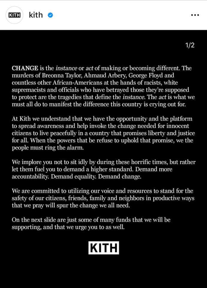 Più creativi e articolati nei propri messaggi si sono invece dimostrati i brand di streetwear. Proprio come Louis Vuitton, Supreme ha pubblicato un video del sassofonista Pharaoh Sanders con un messaggio dell'artista Raj Debah. Altri brand come Kith, New Balance, Fila, Thrasher Magazine, Rebook, Puma e Under Armour hanno offerto il proprio supporto tramite vere e proprie lettere aperte che, anche solo sul piano visivo, paiono molto meno convenzionali e ripetitive dei messaggi dei grandi fashion brand.
