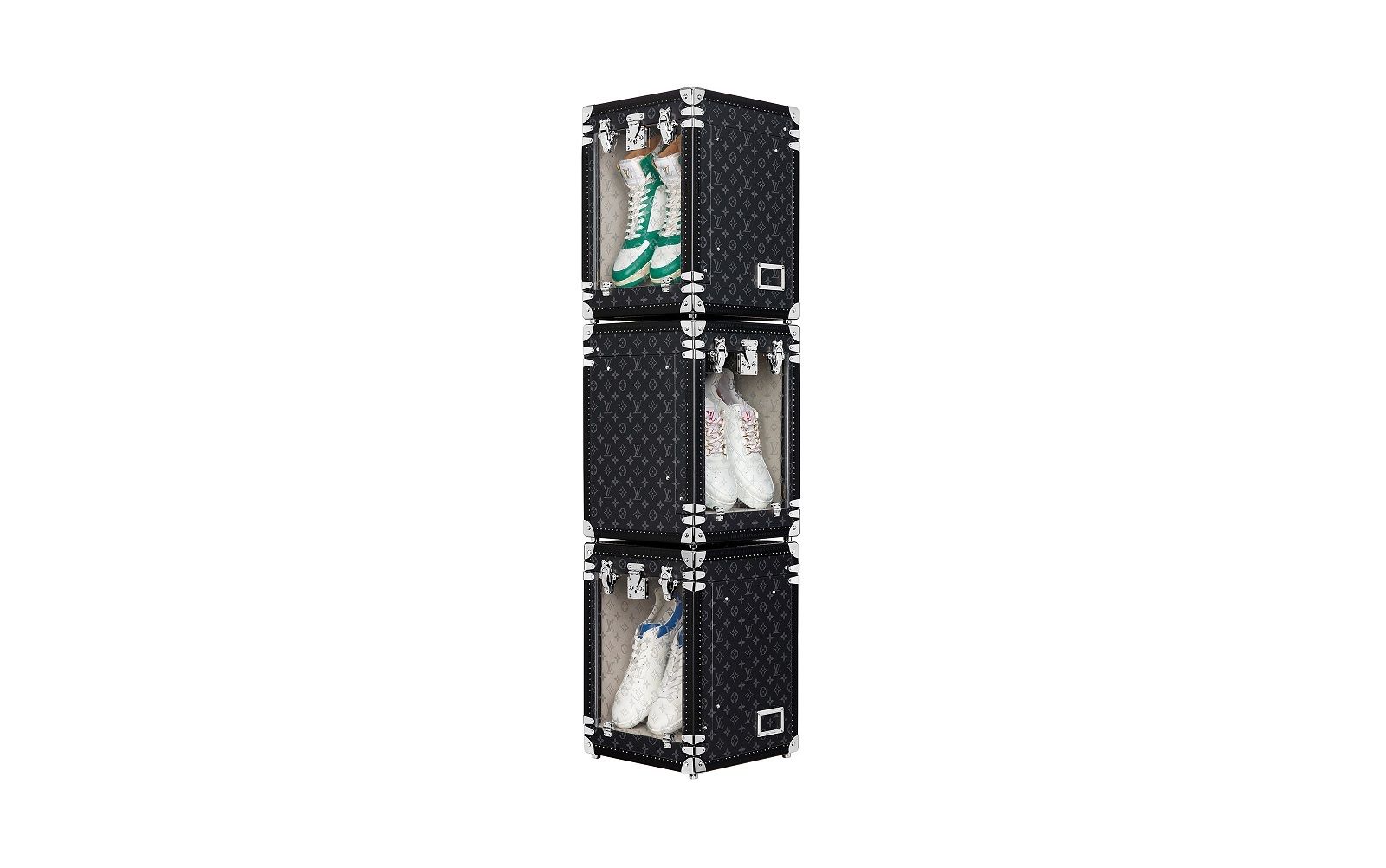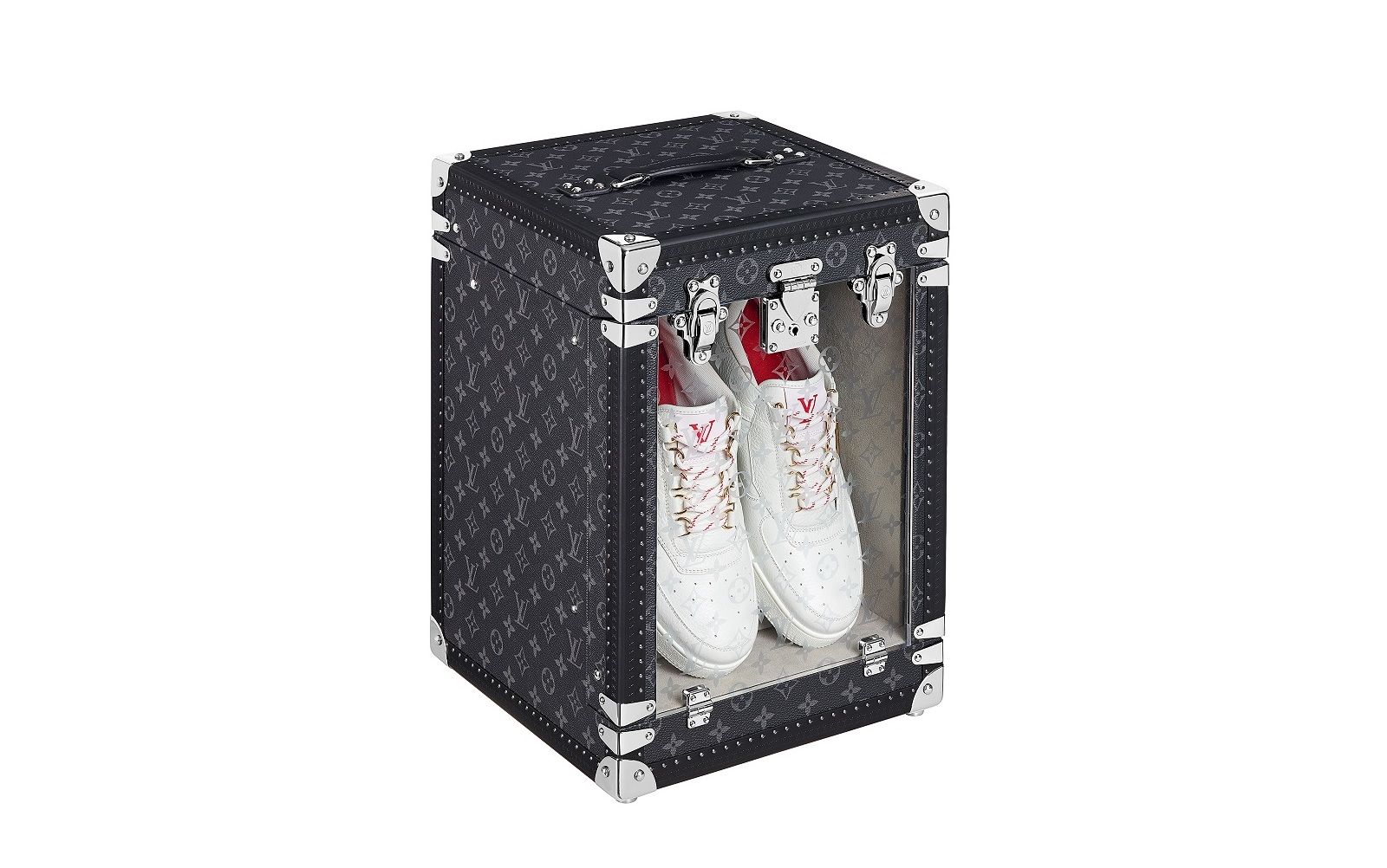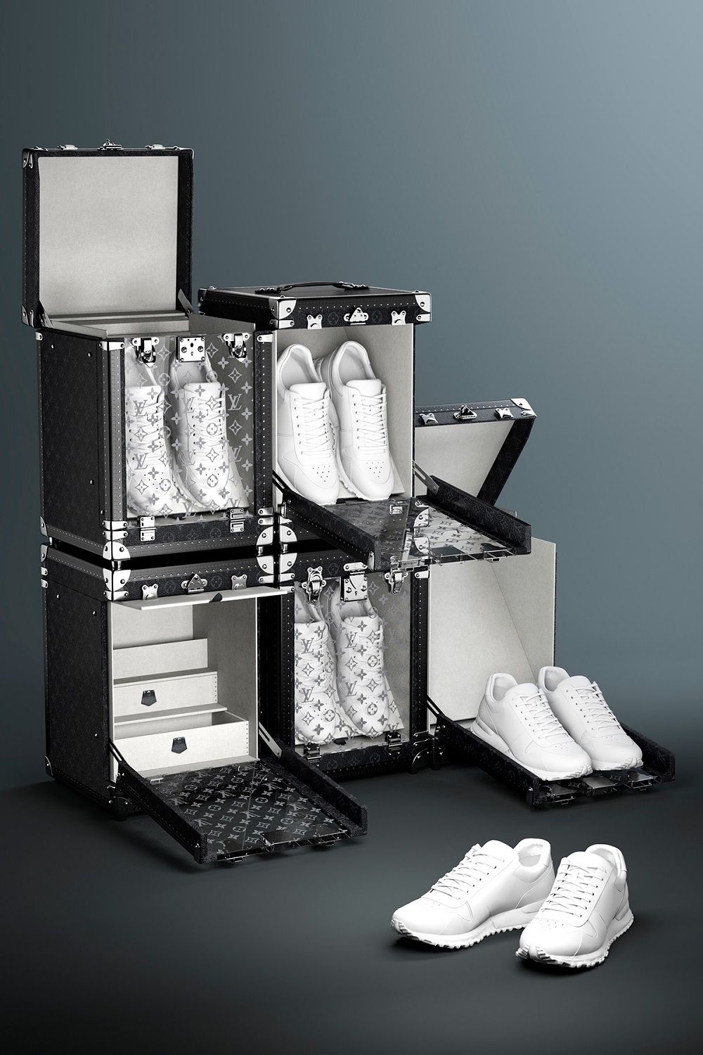 Lo Sneaker Trunk ha un'anima in metallo e rifiniture in pelle di vacchetta. All’interno, dietro due sportelli trasparenti decorati dal pattern Monogram a contrasto in bianco, si trovano otto cassetti per le sneaker high-top e sei per le low-top. A questi si aggiungono altri sette cassetti pensati per contenere tutti i prodotti per la cura delle sneakers e un piano d'appoggio per custodire piccoli oggetti e accessori. Infine, due specchi a scomparsa consentono di ammirare le scarpe quando vengono indossate. Lo Sneaker Box, invece, pensato per singoli paia di sneaker è realizzato in pelle nera monogrammata, con rivetti e fibbie in metallo e una porta trasparente decorata dal motivo Eclipse. Dietro le calzature si nascondono due vani che possono accogliere accessori e prodotti per la cura del footwear.