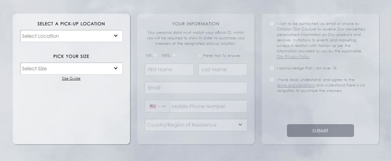 Una volta raggiunto il microsito AirDior, basterà cliccare il pulsante Enter per essere portati a una schermata dove bisognerà selezionare il tipo di modello desiderato. Una volta che il modello è stato scelto, apparirà un form in cui verrà richiesto di scegliere la boutique dove condurre l’acquisto e la misura della sneaker. Dopo di che, bisognerà inserire i propri dati personali e accettare i termini e le condizioni. Quando anche questo passaggio sarà completo, apparirà una schermata di conferma dell’acquisto. Ricordate: la registrazione non implica l’obbligo di acquistare la scarpa.