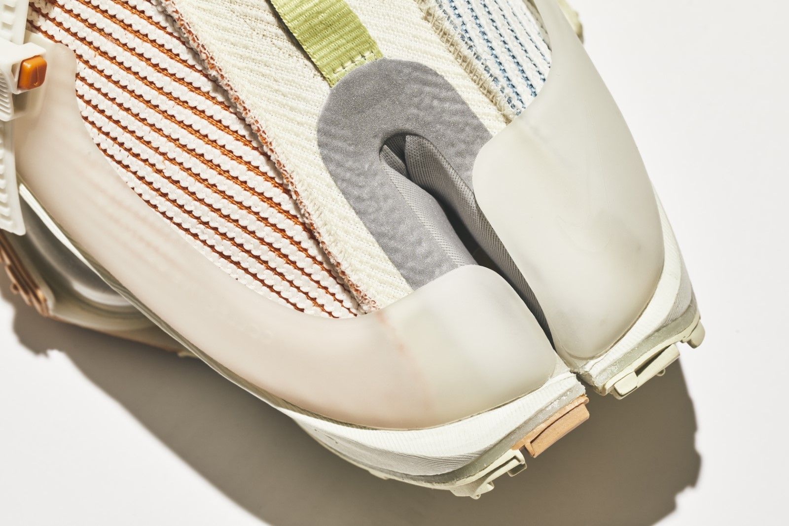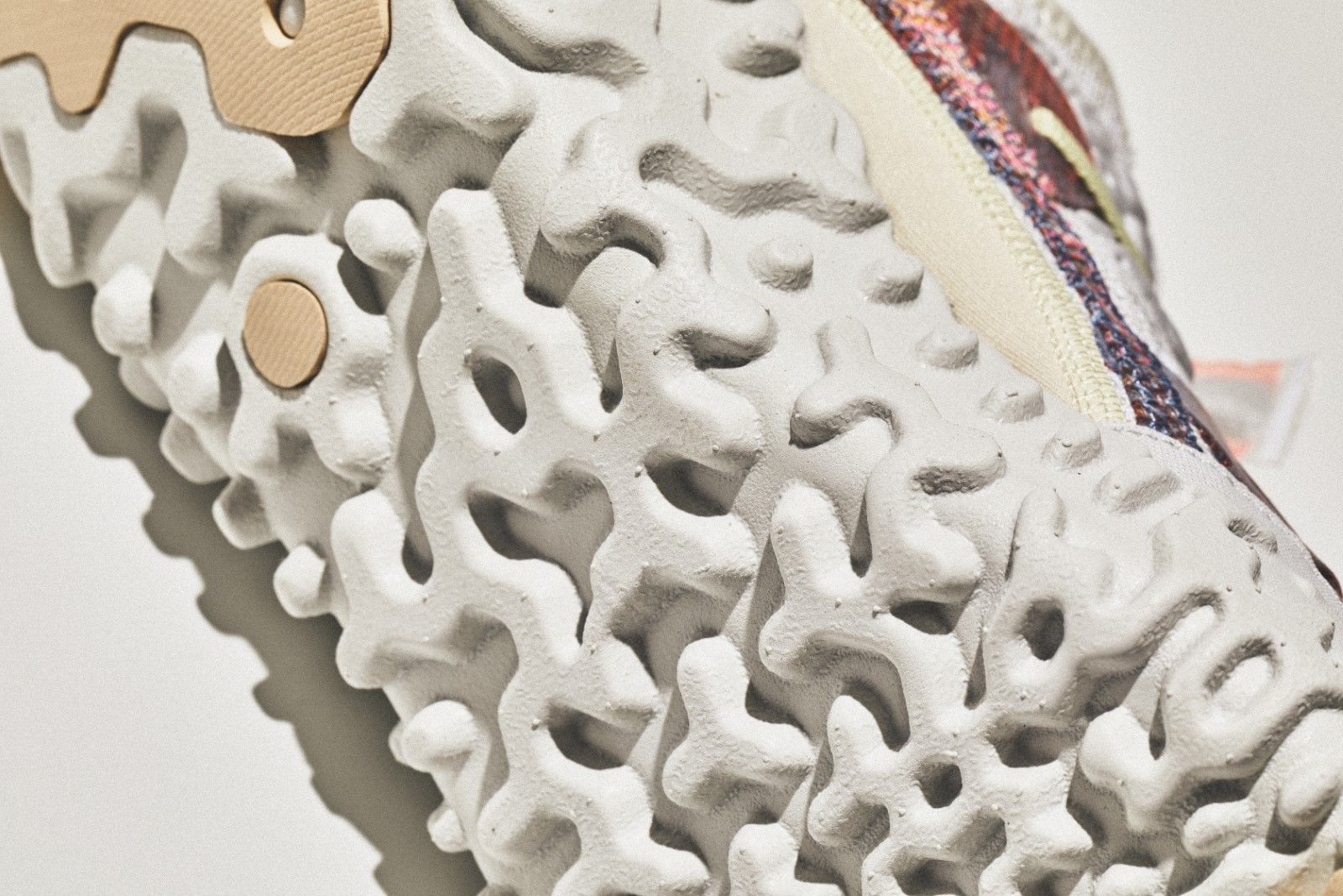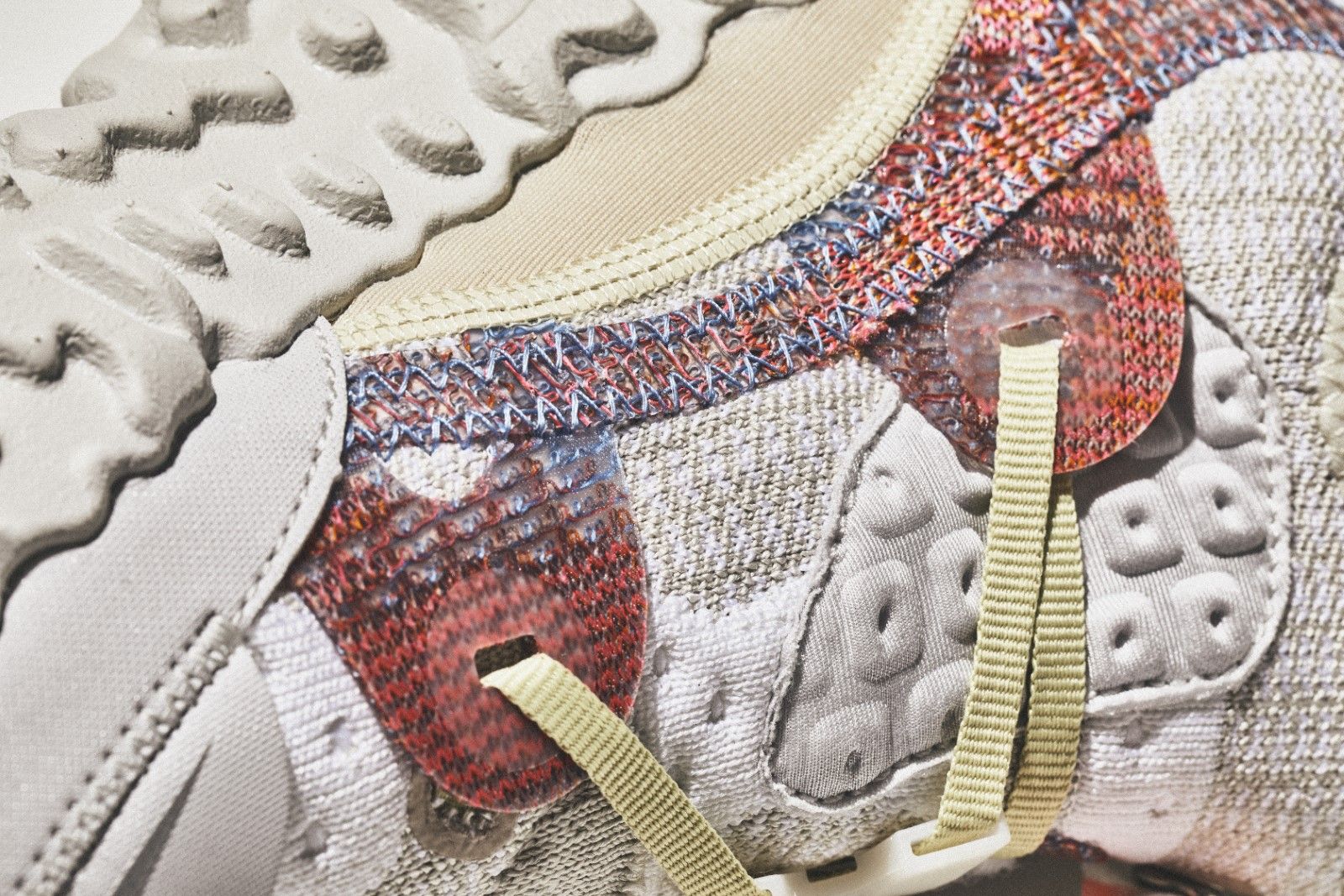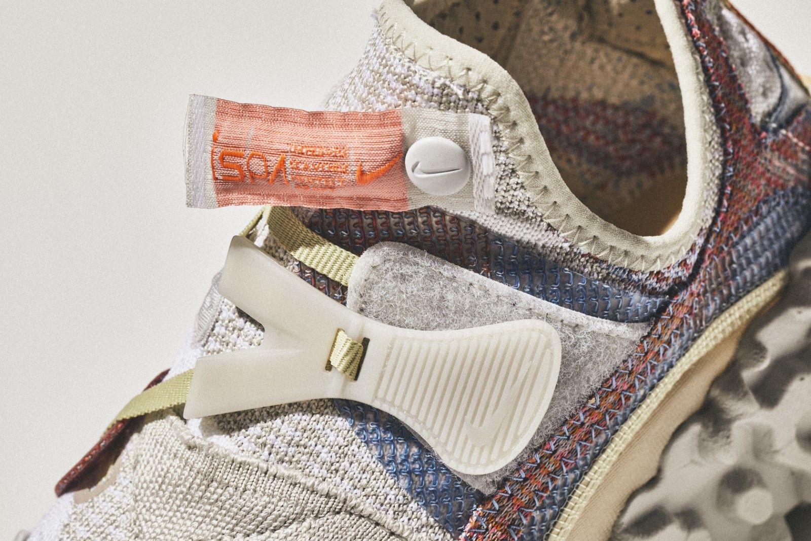La tomaia della scarpa, dotata inoltre di un sistema di allaccio innovativi, rappresenta invece l’evoluzione del Flyknit di Nike utilizzando materiali tessili di recupero, come quelli delle Nike VaporMax 2 Random. Anche gli elementi mesh sono di recupero, e le combinazioni cromatiche della scarpa sono dettate dai filati disponibili.