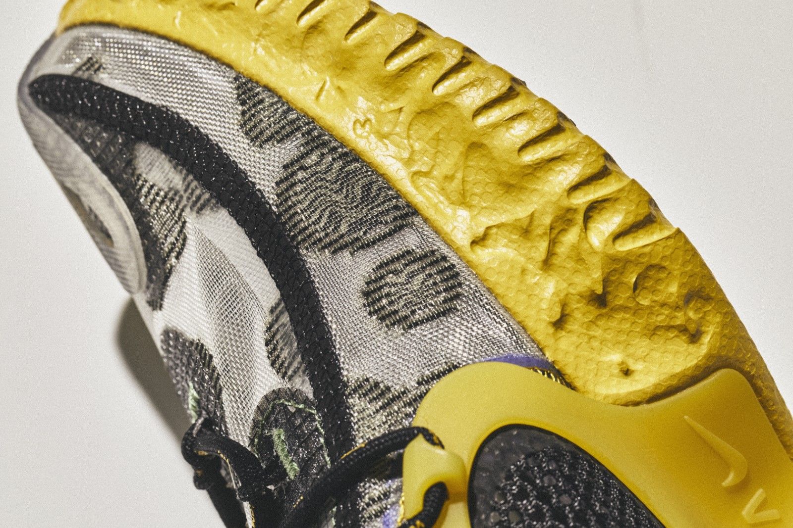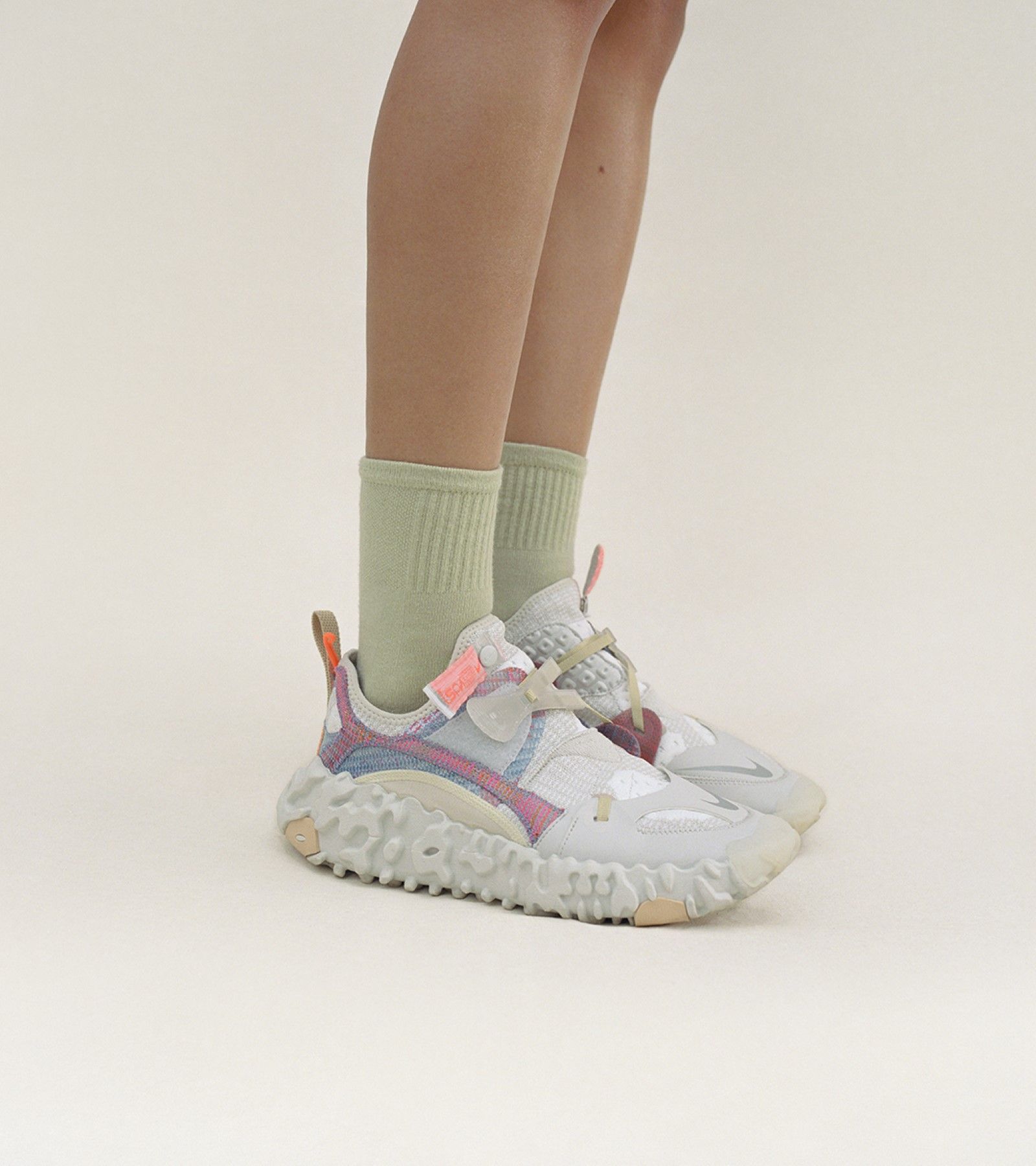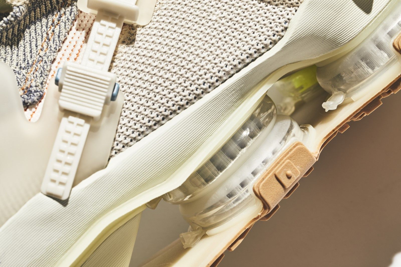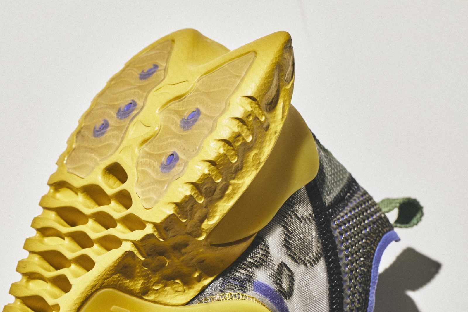 La tomaia della scarpa, dotata inoltre di un sistema di allaccio innovativi, rappresenta invece l’evoluzione del Flyknit di Nike utilizzando materiali tessili di recupero, come quelli delle Nike VaporMax 2 Random. Anche gli elementi mesh sono di recupero, e le combinazioni cromatiche della scarpa sono dettate dai filati disponibili.