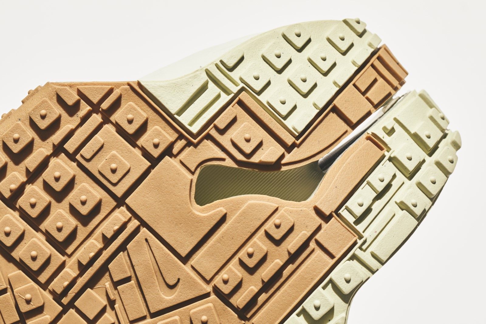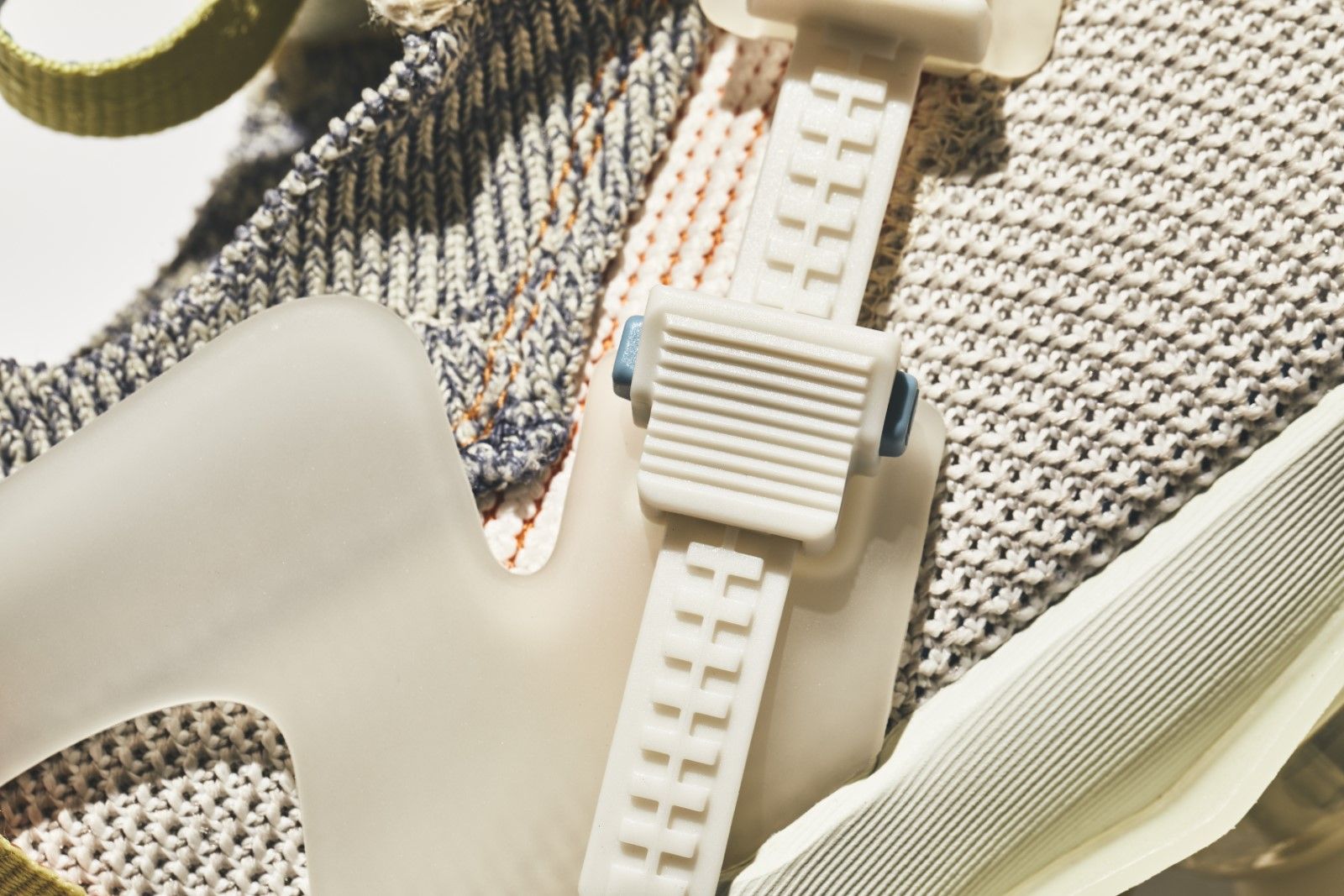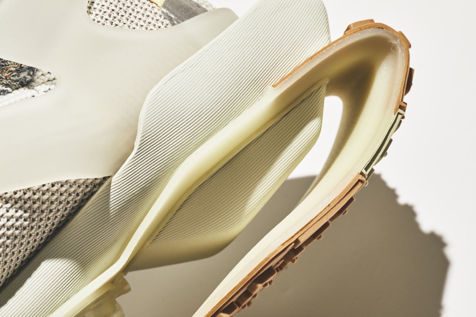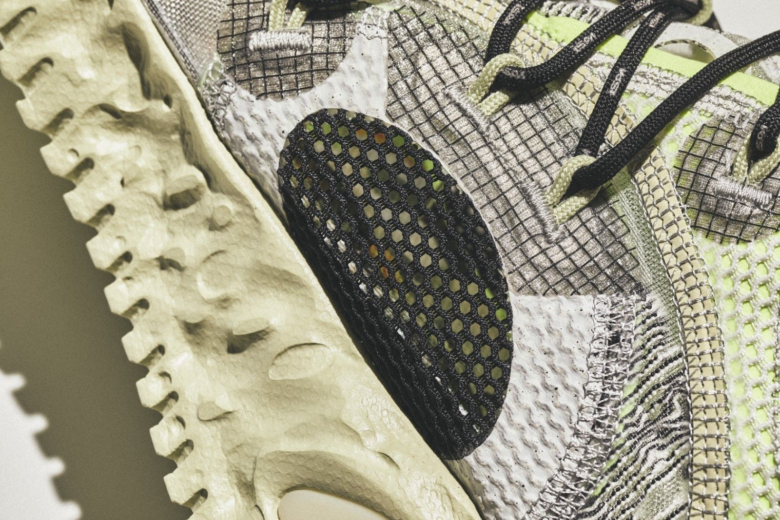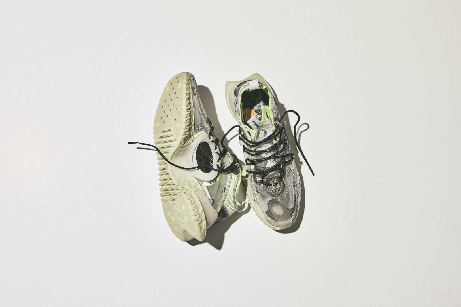 La tomaia della scarpa, dotata inoltre di un sistema di allaccio innovativi, rappresenta invece l’evoluzione del Flyknit di Nike utilizzando materiali tessili di recupero, come quelli delle Nike VaporMax 2 Random. Anche gli elementi mesh sono di recupero, e le combinazioni cromatiche della scarpa sono dettate dai filati disponibili.