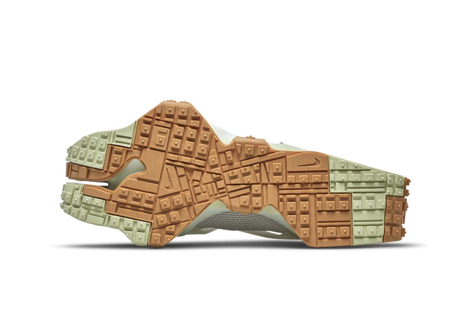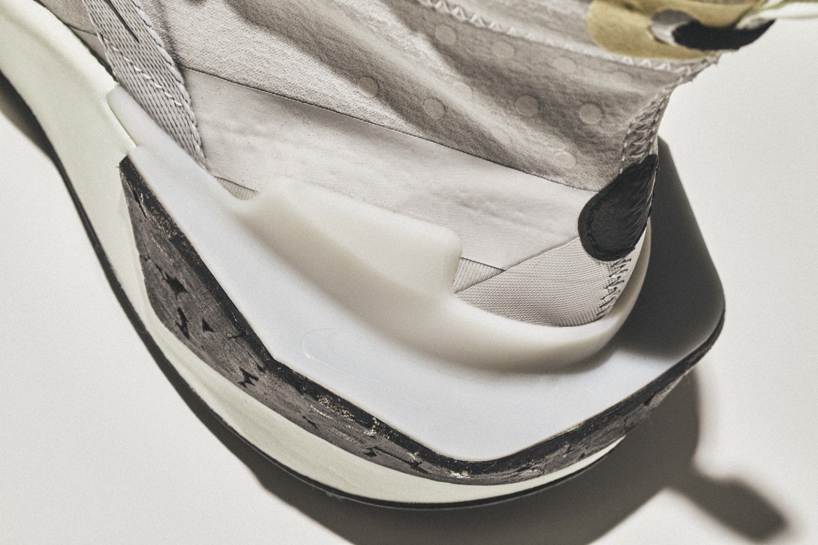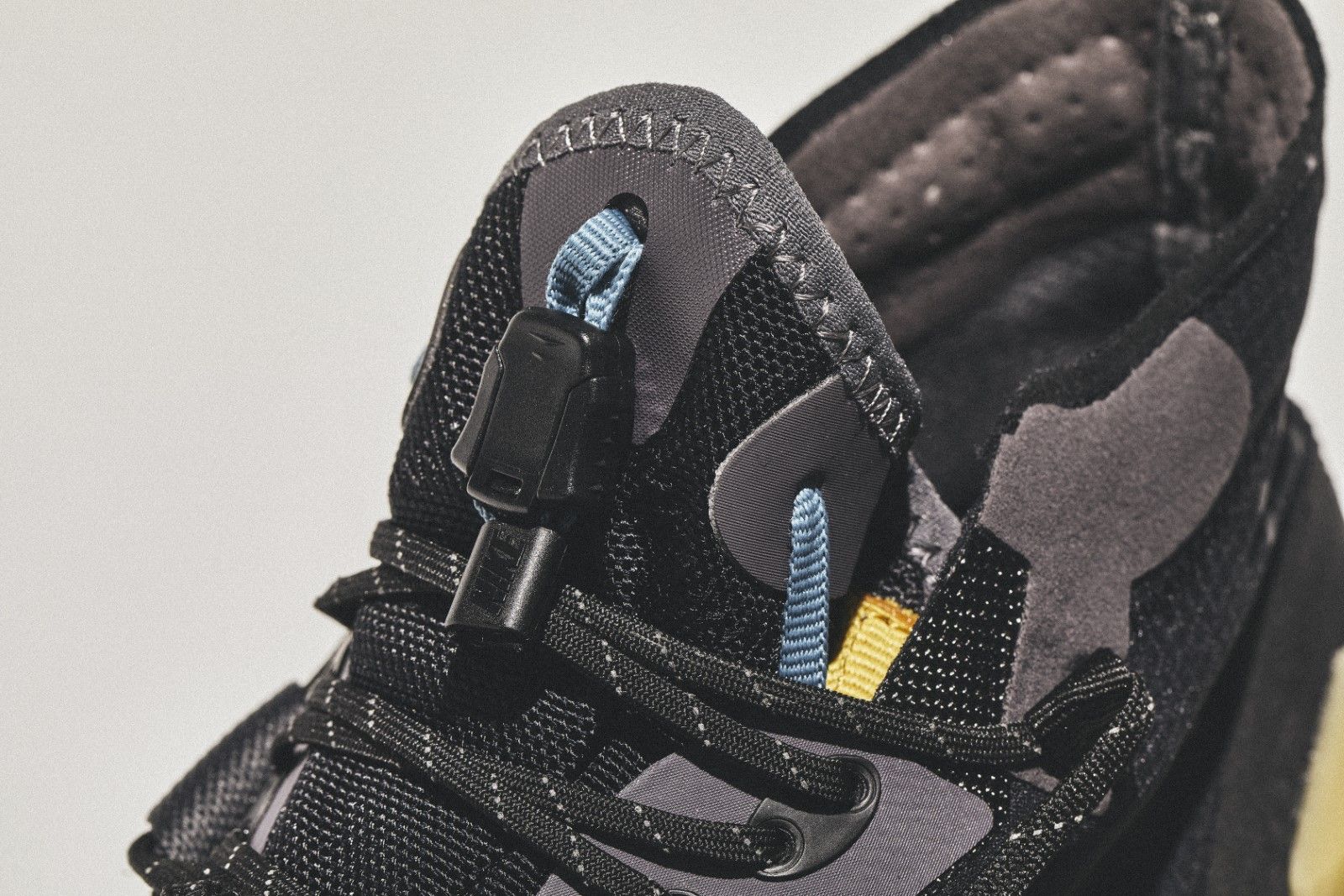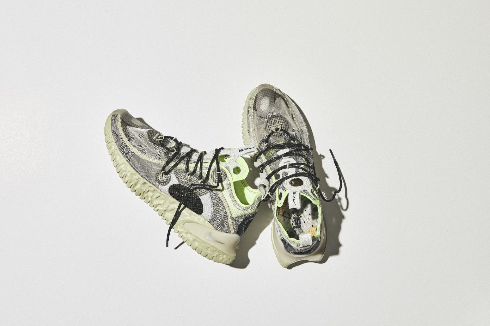 La tomaia della scarpa, dotata inoltre di un sistema di allaccio innovativi, rappresenta invece l’evoluzione del Flyknit di Nike utilizzando materiali tessili di recupero, come quelli delle Nike VaporMax 2 Random. Anche gli elementi mesh sono di recupero, e le combinazioni cromatiche della scarpa sono dettate dai filati disponibili.