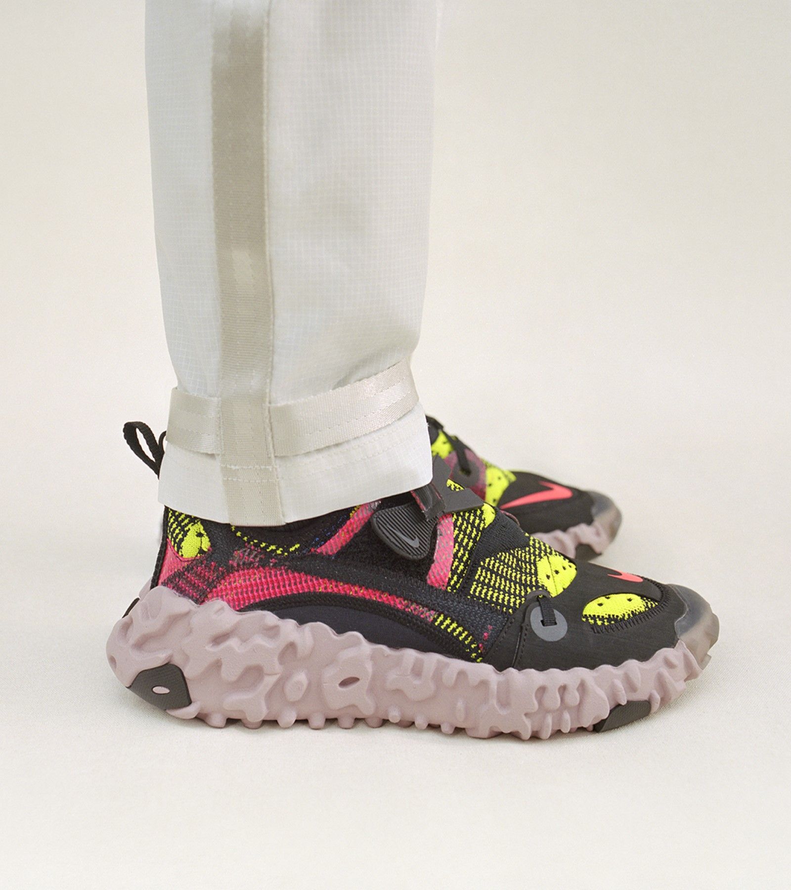 Il nome Overreact viene dall’estremizzazione delle caratteristiche delle classiche React, come ad esempio il raddoppiamento del pattern geometrico intrecciato che aumenta l’ammortizzazione già fornita dalle normali suole React. L’effetto è ottenuto mappando la pressione e densità del materiale in corrispondenza dei punti in cui il piede applica maggiore forza. La rimozione dei layer interni aumenta ancora di più la sensazione di cushioning perché il piede è molto più vicino allo strato di schiuma.