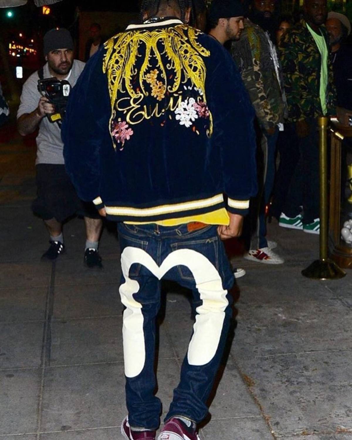 La passione di La Flame per il brand giapponese non è certo una novità, sono infatti numerose le volte in cui il rapper è stato fotografato con un paio di jeans Evisu. Dal canto suo, il brand fondato nel 1991 da Hidehiko Yamane continua con la sua progressiva apertura al mercato e al pubblico occidentale, dopo essere scomparso dalle scene a fronte di alcuni cambi di trend e di proprietà. In questo senso la scelta di Travis Scott sembra proprio indirizzata verso un tentativo di riaffermazione in un contesto come quello streetwear in cui, ad inizio degli anni 2000, Evisu era riuscita a imporsi grazie a nomi come Jay-Z e Beyoncé, ma anche grazie al lavoro della costumista June Ambrose, spesso citata come la persona che ha portato Evisu negli States.