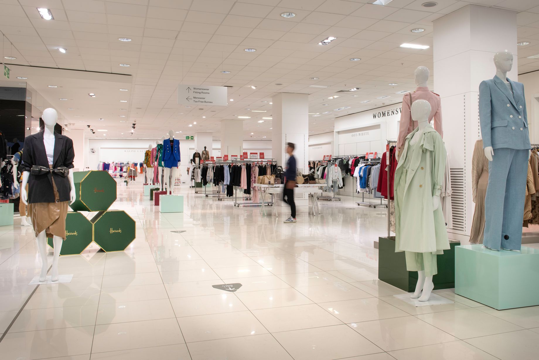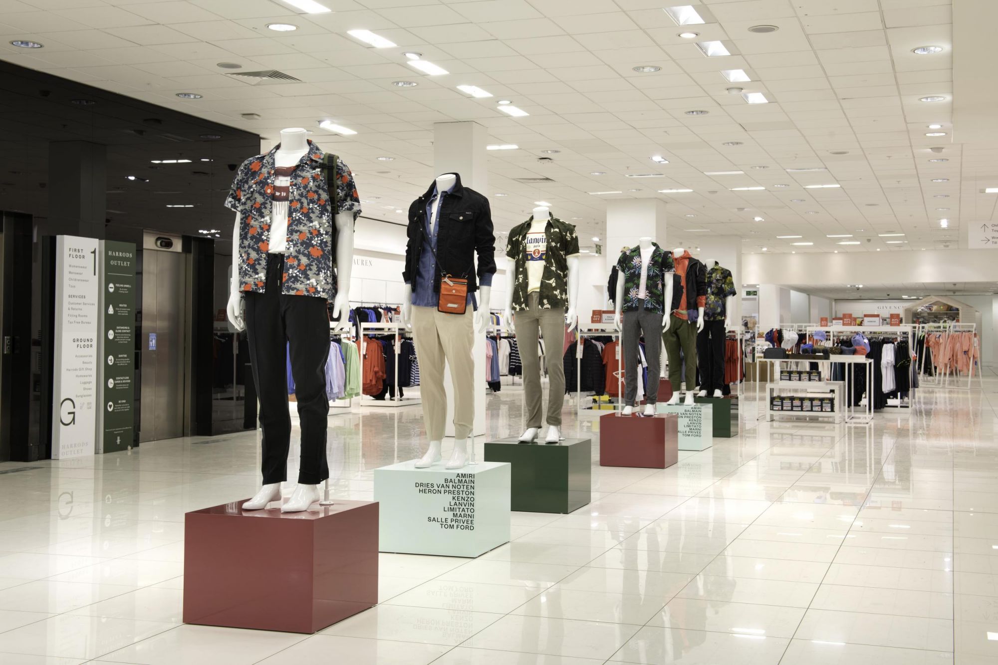 Il nuovo Harrods Outlet occuperà due piani ed è stato concepito con in mente le regole di distanziamento sociale. Lo spazio sarà ampio e ben illuminato, facile da sanificare e con espositori distanziati fra di loro, per ospitare oltre 120.000 diversi prodotti selezionati da un portafoglio di cento fashion brands. Ogni abito che sarà indossato nei camerini e non acquistato sarà sanificato e conservato in isolamento per 48 ore prima di tornare a essere esposto. Inoltre saranno ammessi nel negozio solo 365 clienti alla volta, che verranno contati dallo stesso sistema informatico che monitora l’affluenza nella sede principale di Harrods. Al primo piano si troveranno i settori beauty e profumeria, insieme a borse e accessori, footwear e occhiali da sole. Al piano superiore si trovano invece le collezioni ready-to-wear maschili e femminili.