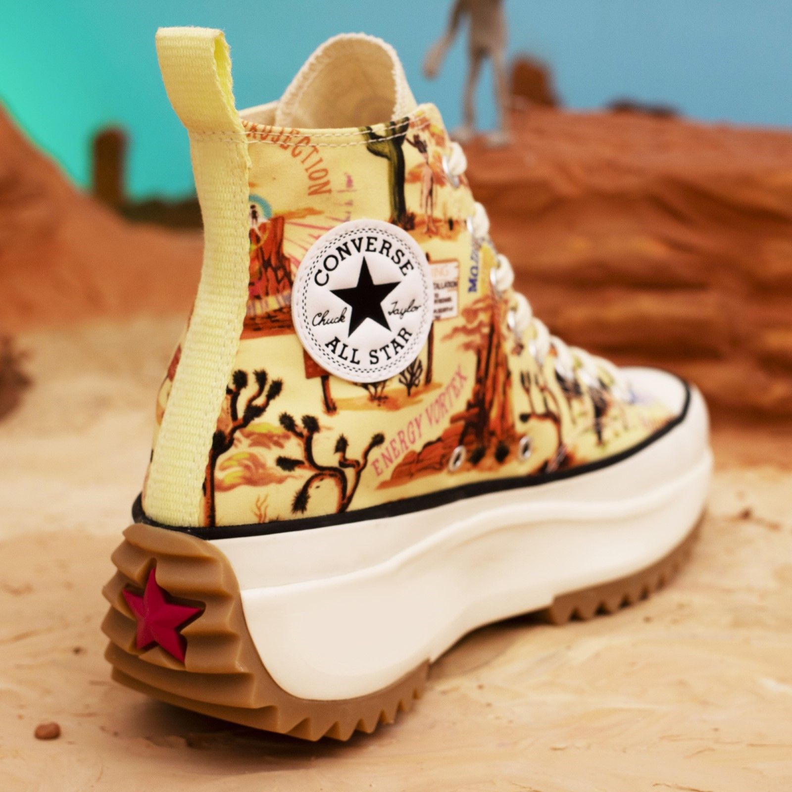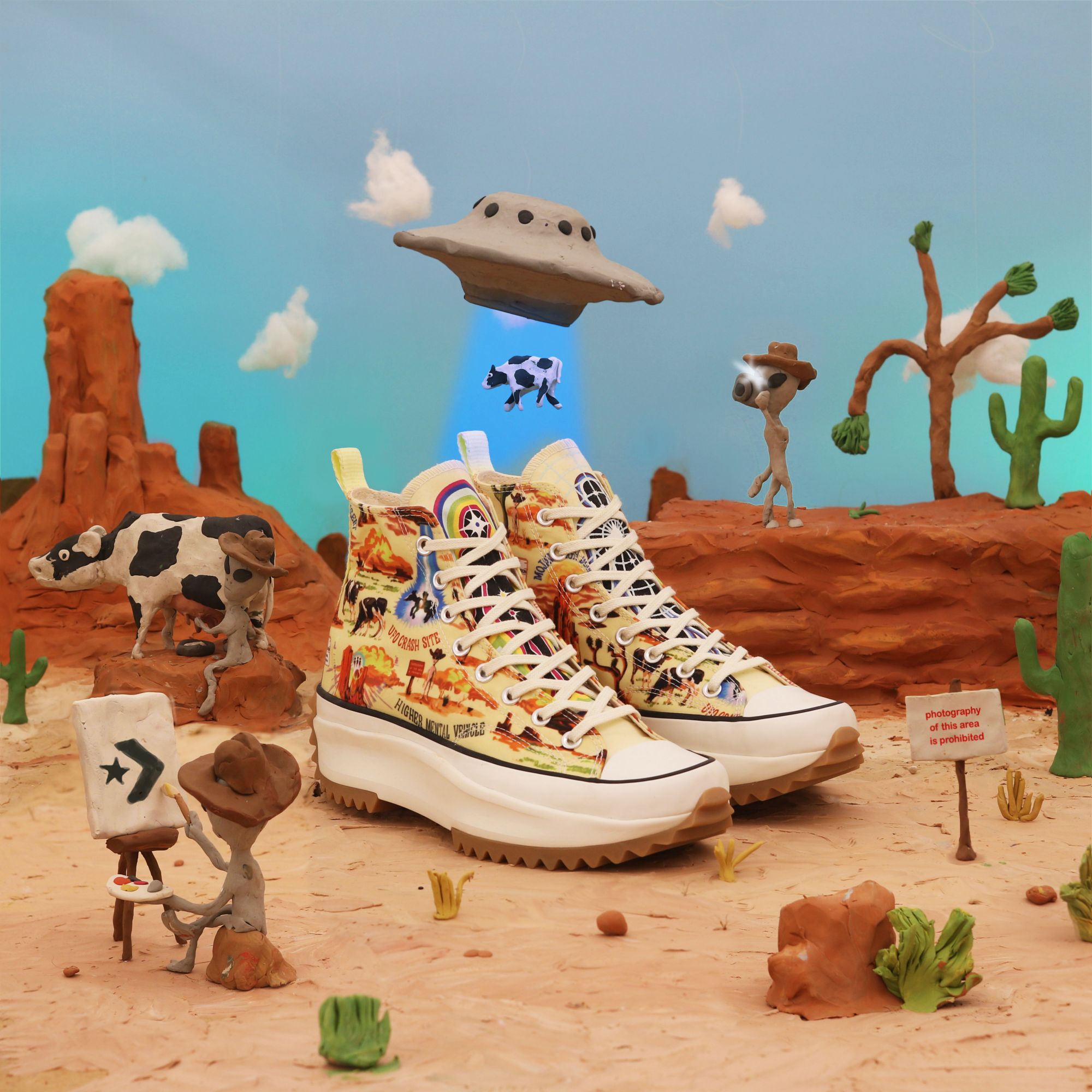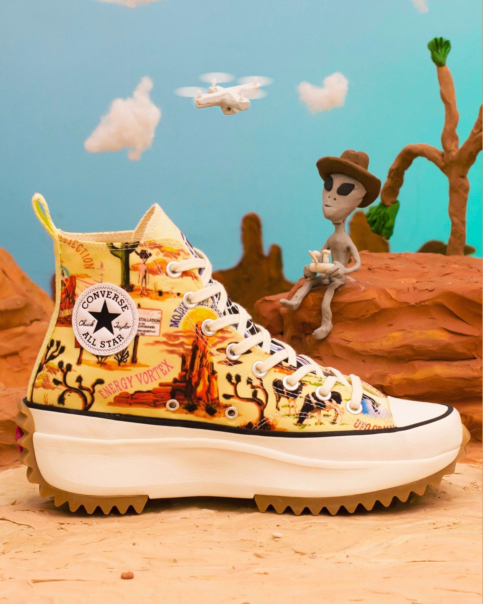 In occasione dell’uscita di questo pack, la Run Star Hike e la Chuck 70, sia nella versione high-top che low-top, si colorano dell’estetica del deserto americano, fatta di incontri alieni, festival musicali ed esperienze lisergiche. L’artista stop-motion Stefano Colferai ha creato per la release una campagna che celebra giocosamente il mondo di riferimenti a cui si ispira il pack, con alieni e dischi volanti fra i cactus e le rocce del Nevada.
