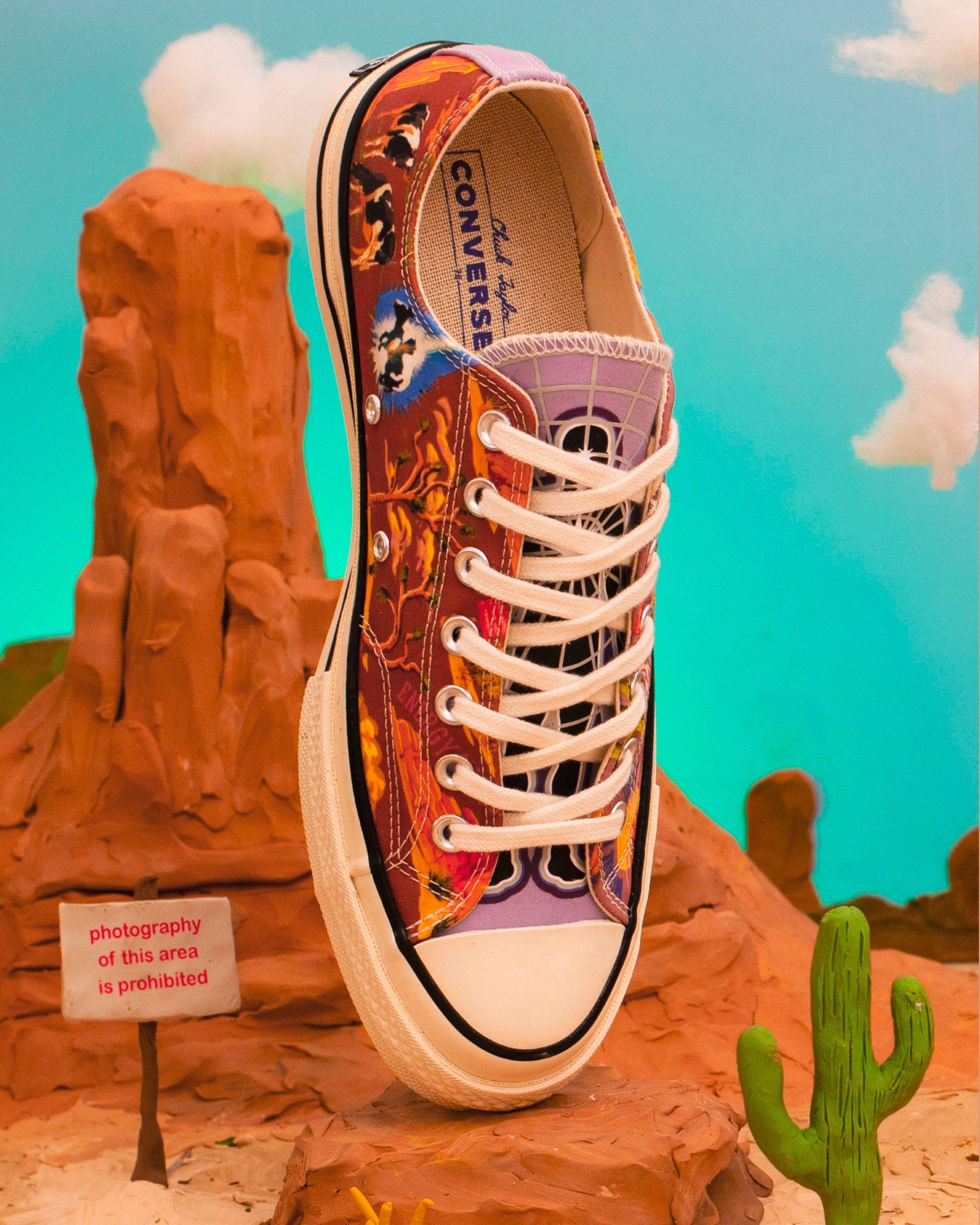 Per la nuova versione della Run Star Hike, è stata creata una tomaia in tela derivata dalla Chuck 70 e remixata con la nuova suola Converse Run Star. L’intersuola chunky in EVA della sneaker, rifinita con un rivestimento in gomma per il tallone, la distintiva Star e un battistrada a denti di sega, crea di fatto una scarpa in tre parti (tomaia, intersuola, suola esterna) che dà comfort e visibilità a ogni look. Le due versioni della Chuck 70 sono state invece costruite sulla base del design originale degli anni Settanta e decorate con i motivi desertici che distinguono la collezione. Inoltre, a completare il design del pack, il diagramma dei chakra in colori vibranti è visibile sulla lingua di ogni silhouette.