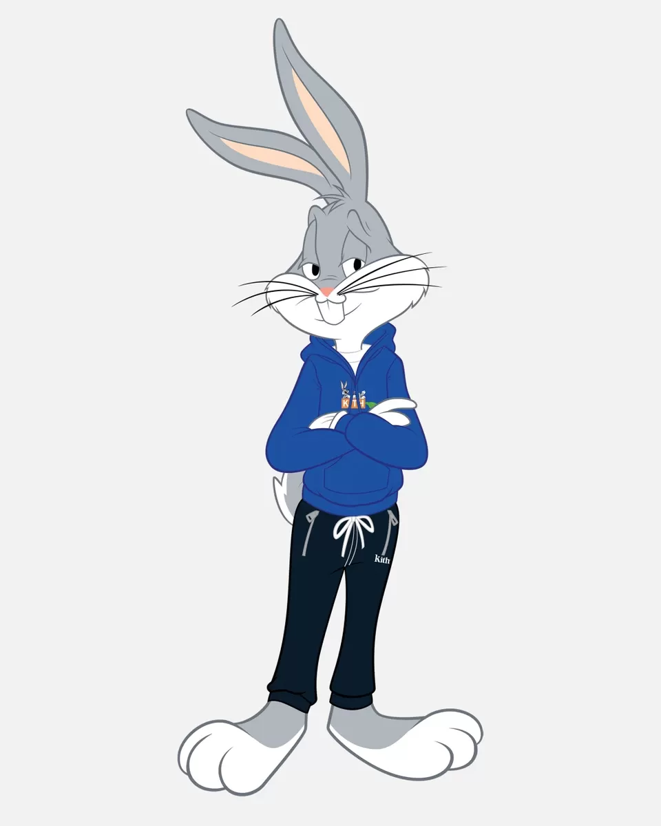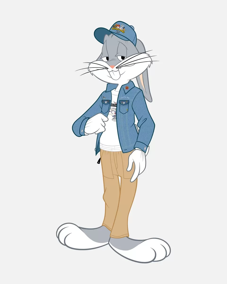 L'occasione sono gli 80 anni di Bugs Bunny, protagonista assoluto della collezione in cui la storia del personaggio si intreccia e viene raccontata dagli item firmati da Fieg. C'è un omaggio a Space Jam e alla Tune Squad, ma anche alla storia dell'intero gruppo dei Looney Tunes nei pezzi che trasformano la frase di chiusura di ogni cartoon "That's all Folks!" in "Just Us, Kith".