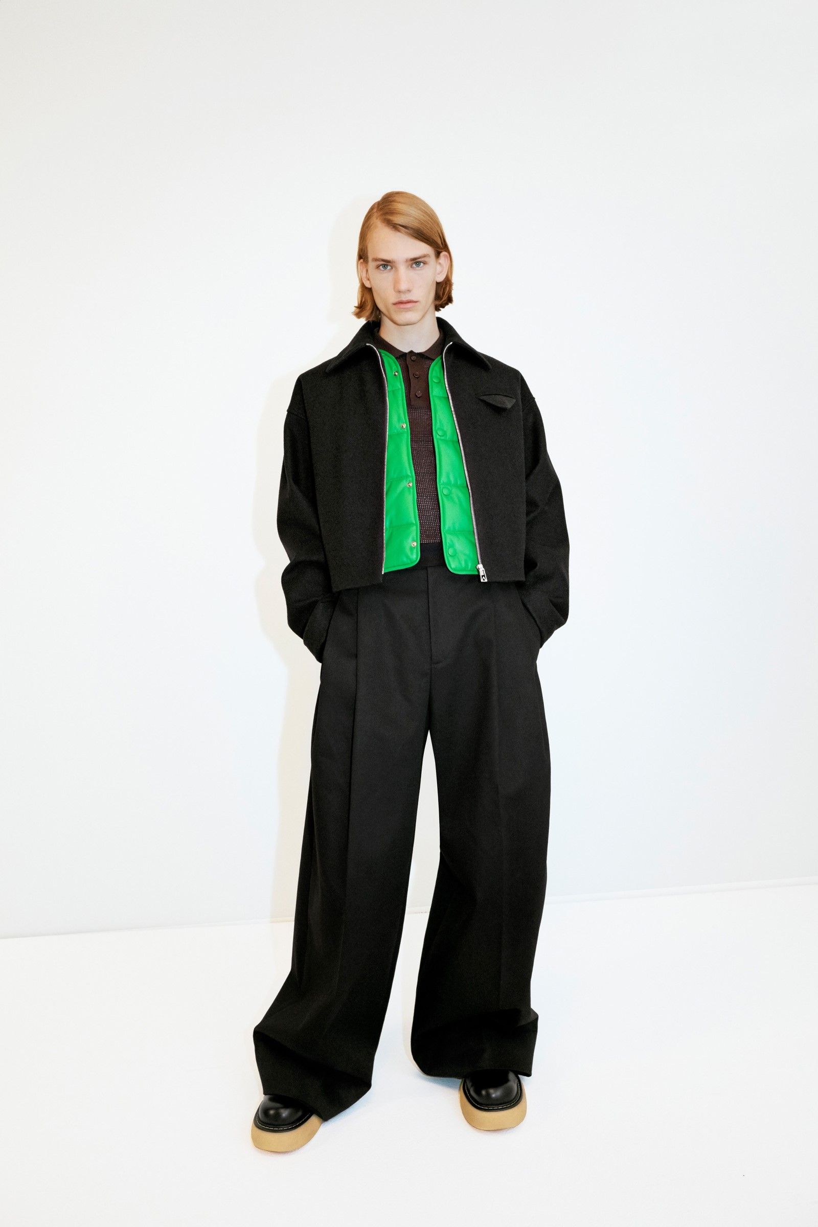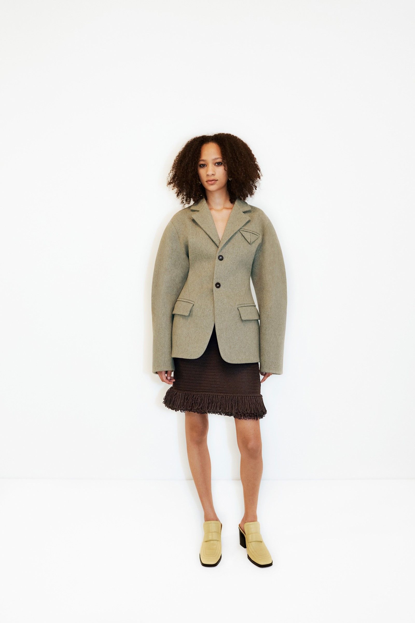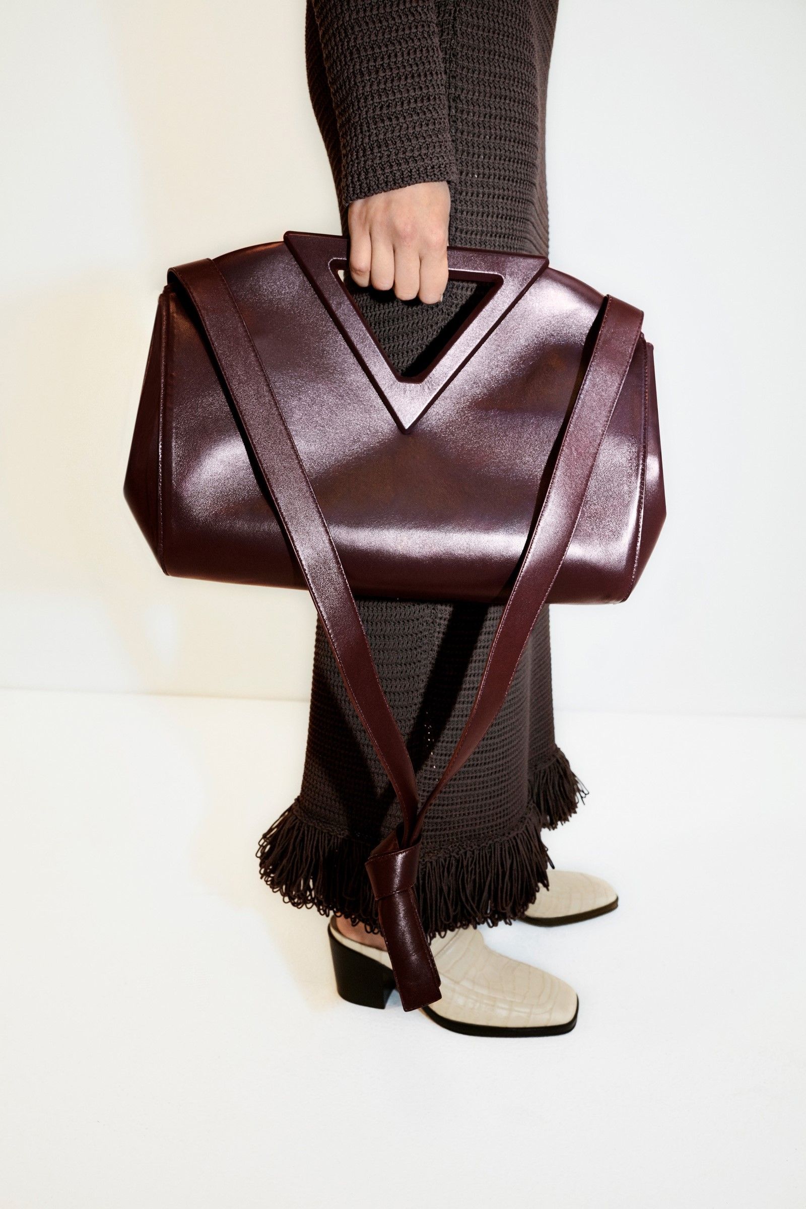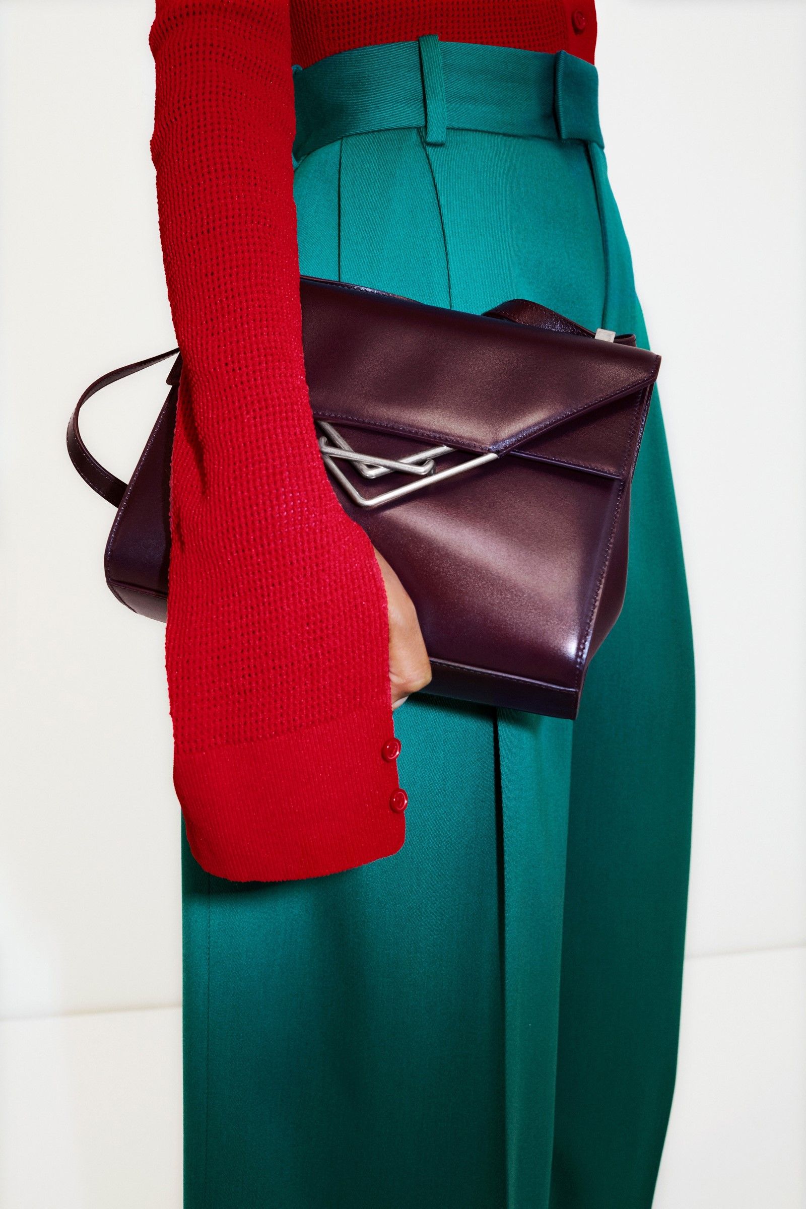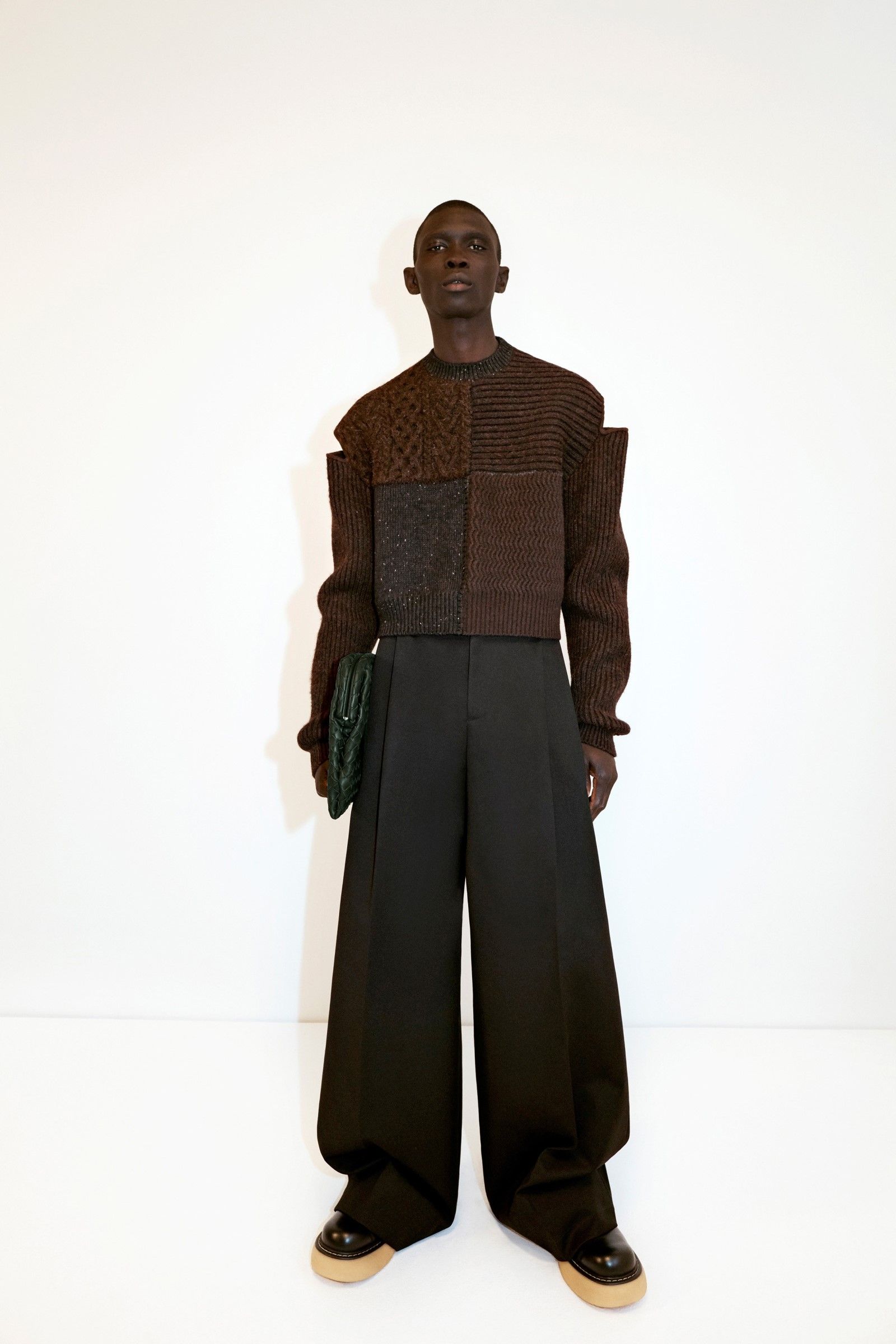 Fra tutte le collezioni finora disegnate da Lee, questa è quella che legge con maggior leggerezza l’identità di Bottega Veneta – identità che si manifesta attraverso la moltiplicazione delle forme a V che costellano l’intera collezione sotto forma di dettagli sartoriali: baveri di giacche, taschini, intarsi nei maglioni e, soprattutto, in una nuova borsa di pelle dove la V di “Veneta” diventa un fermaglio a metà fra il liberty e il futuristico. È una risposta personale al concetto di logomania, ancora importante per enormi brand come Dior ad esempio, che vuole trasformare il logo, inteso come elemento estraneo alla struttura del capo, in signature mantenendo la sua riconoscibilità e, soprattutto, coltivando una radicale originalità. Sulla questione, Lee stesso si è espresso con grande semplicità ed eloquenza: