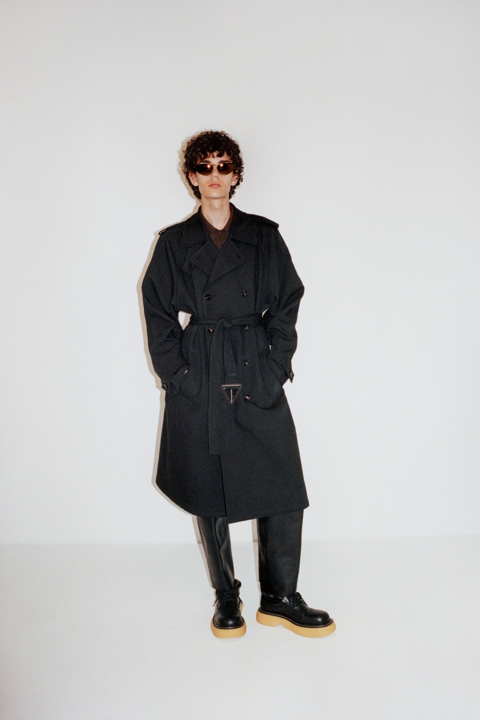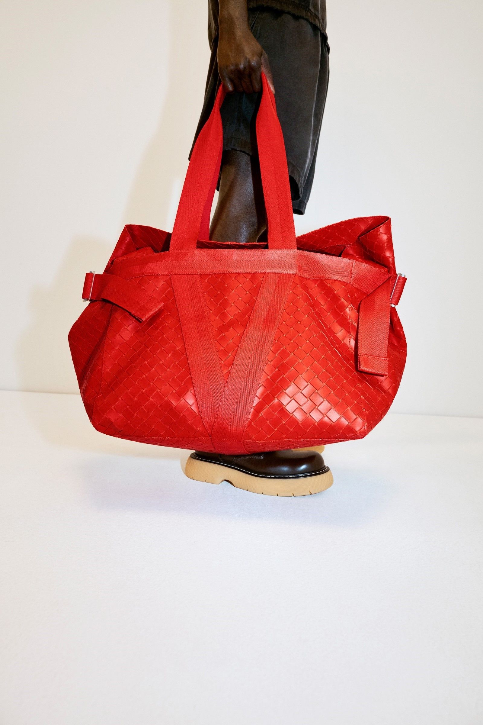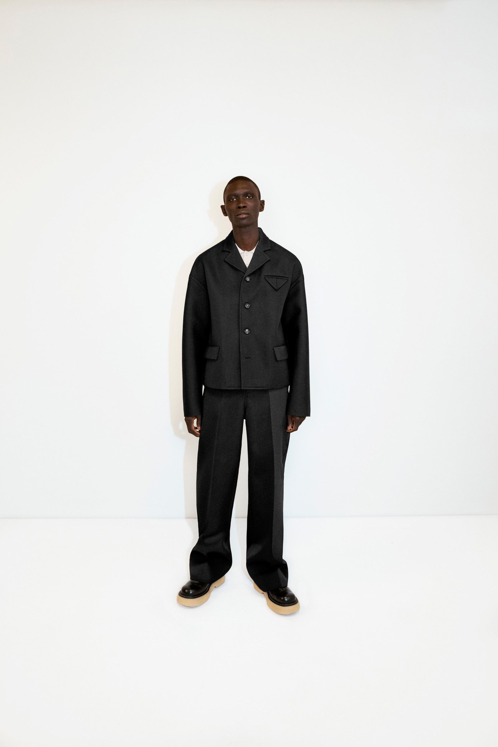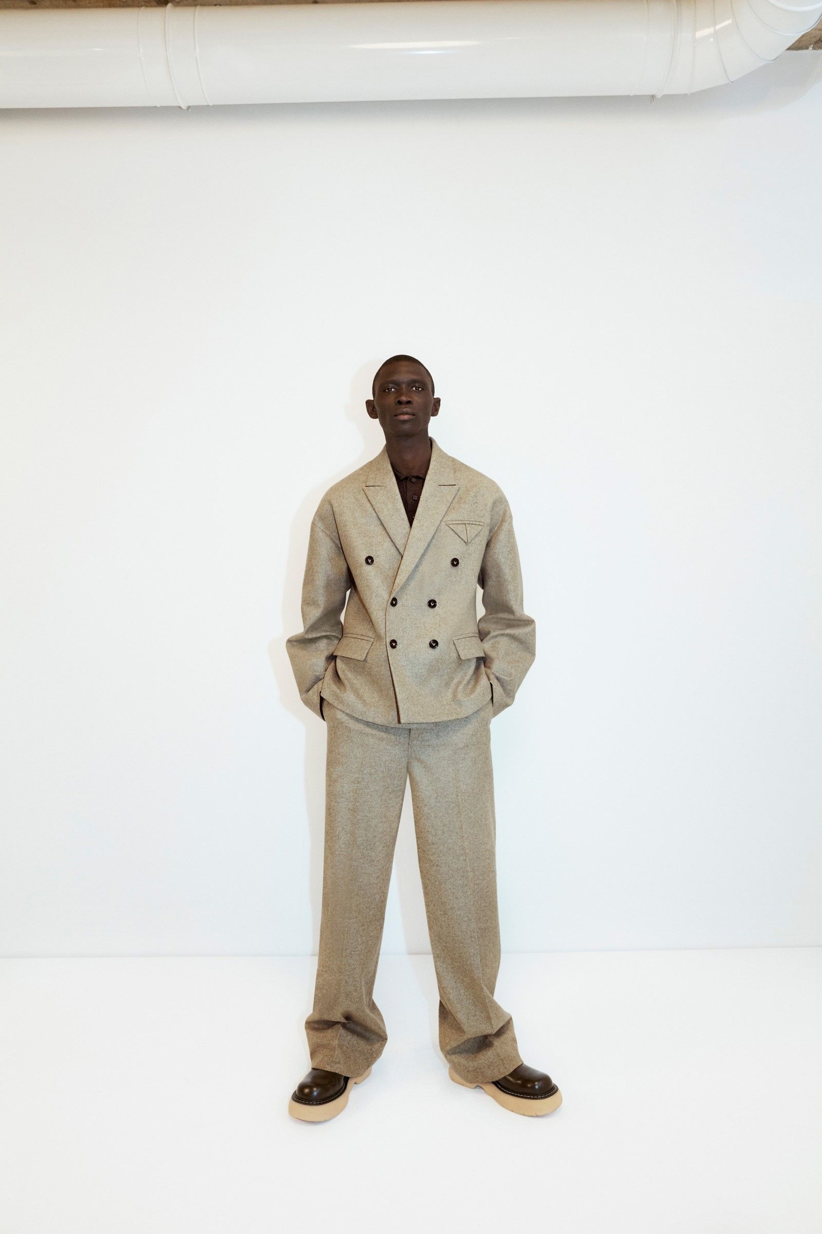 Fra tutte le collezioni finora disegnate da Lee, questa è quella che legge con maggior leggerezza l’identità di Bottega Veneta – identità che si manifesta attraverso la moltiplicazione delle forme a V che costellano l’intera collezione sotto forma di dettagli sartoriali: baveri di giacche, taschini, intarsi nei maglioni e, soprattutto, in una nuova borsa di pelle dove la V di “Veneta” diventa un fermaglio a metà fra il liberty e il futuristico. È una risposta personale al concetto di logomania, ancora importante per enormi brand come Dior ad esempio, che vuole trasformare il logo, inteso come elemento estraneo alla struttura del capo, in signature mantenendo la sua riconoscibilità e, soprattutto, coltivando una radicale originalità. Sulla questione, Lee stesso si è espresso con grande semplicità ed eloquenza: