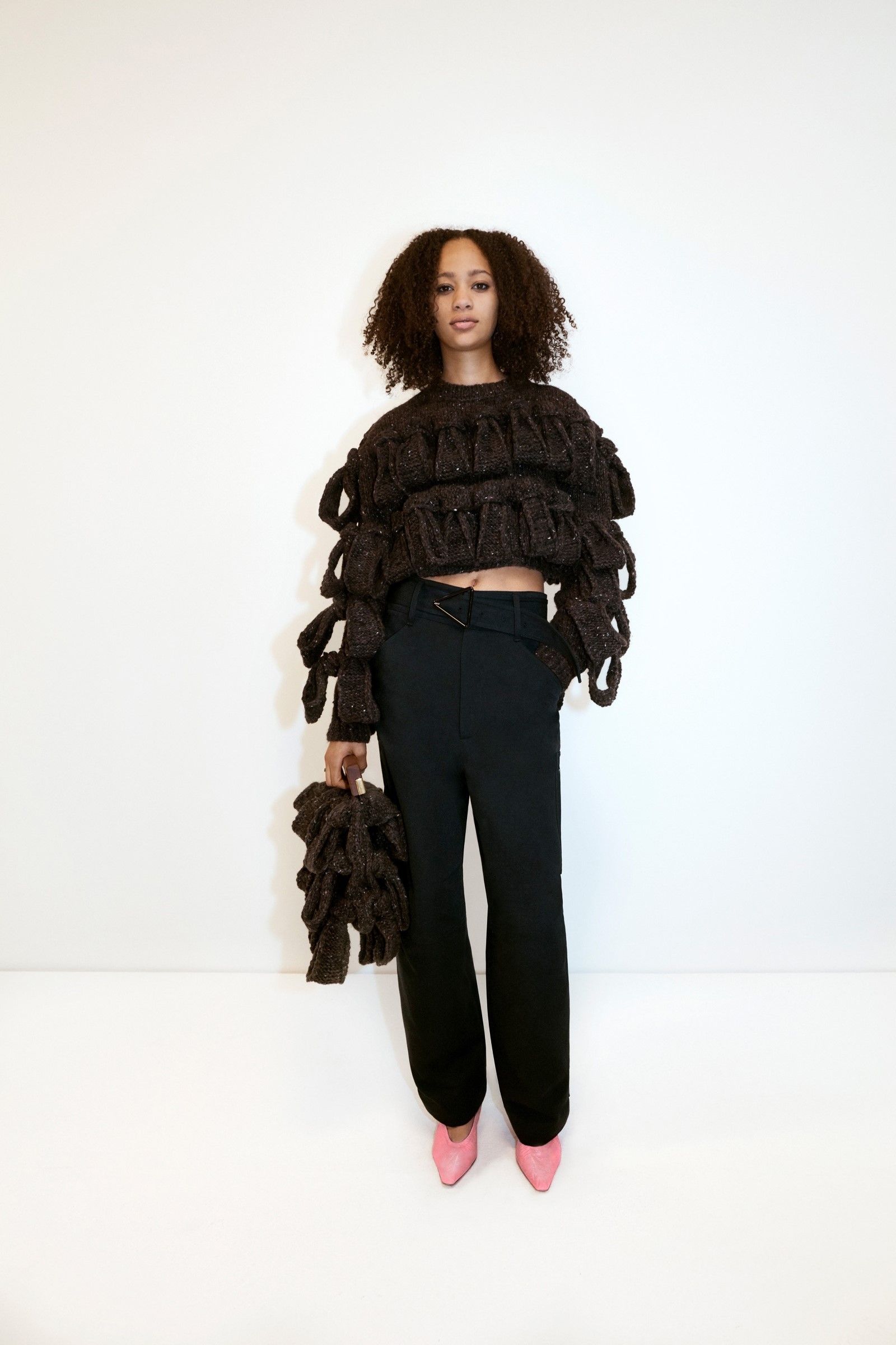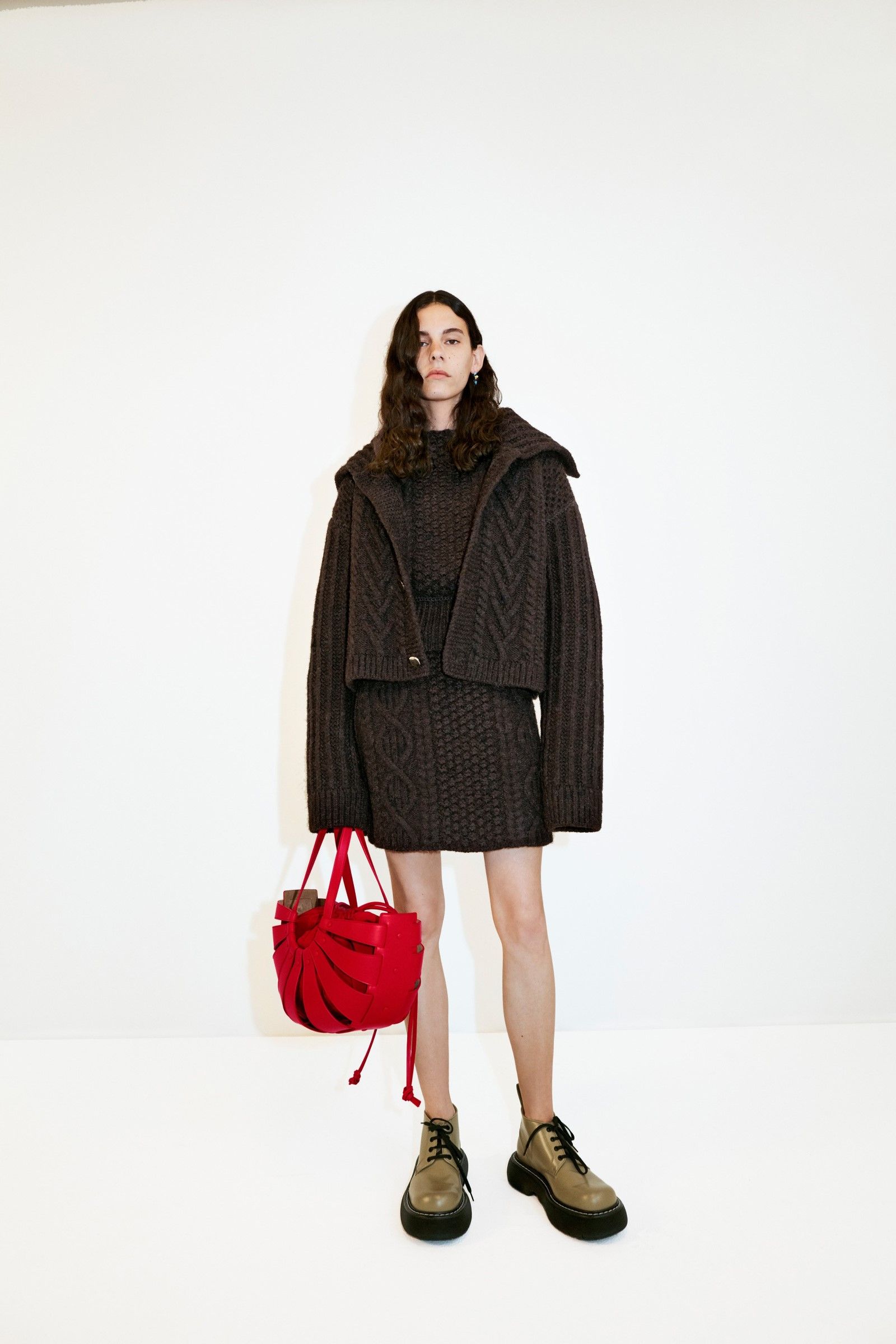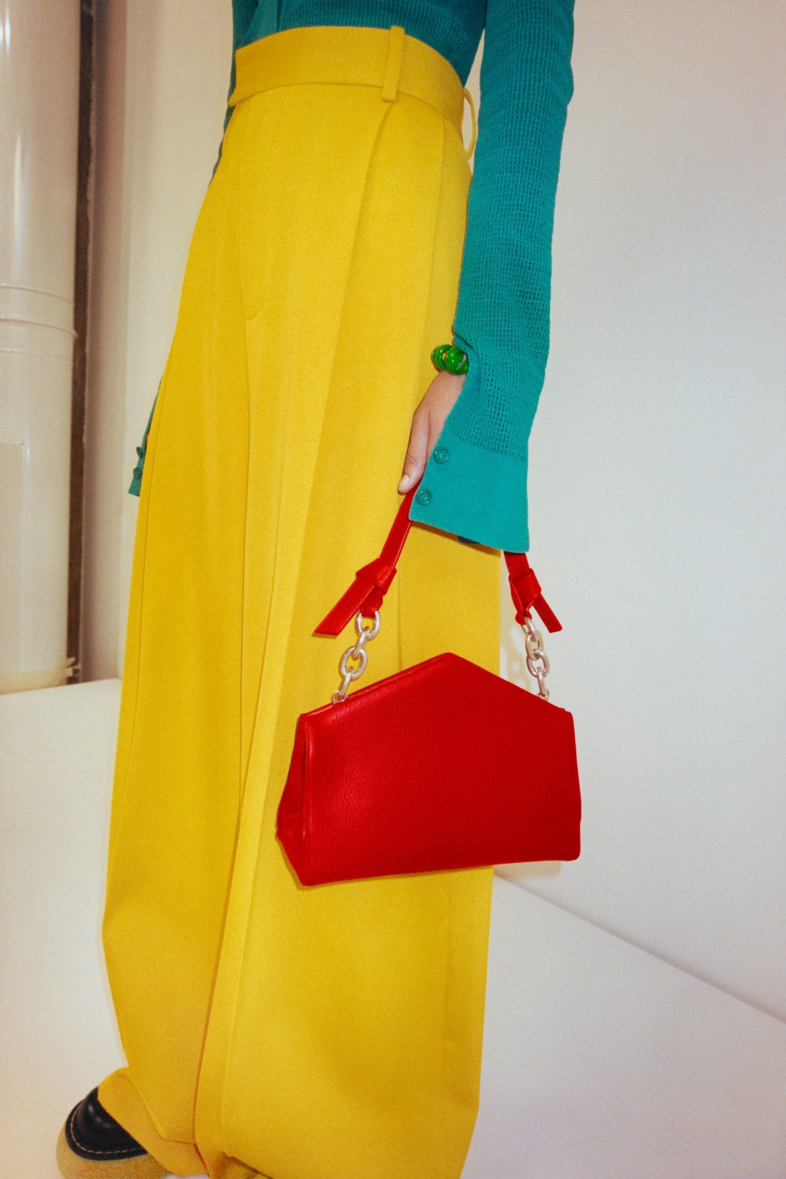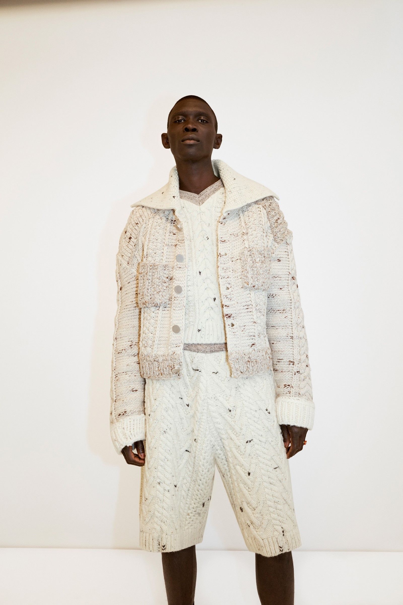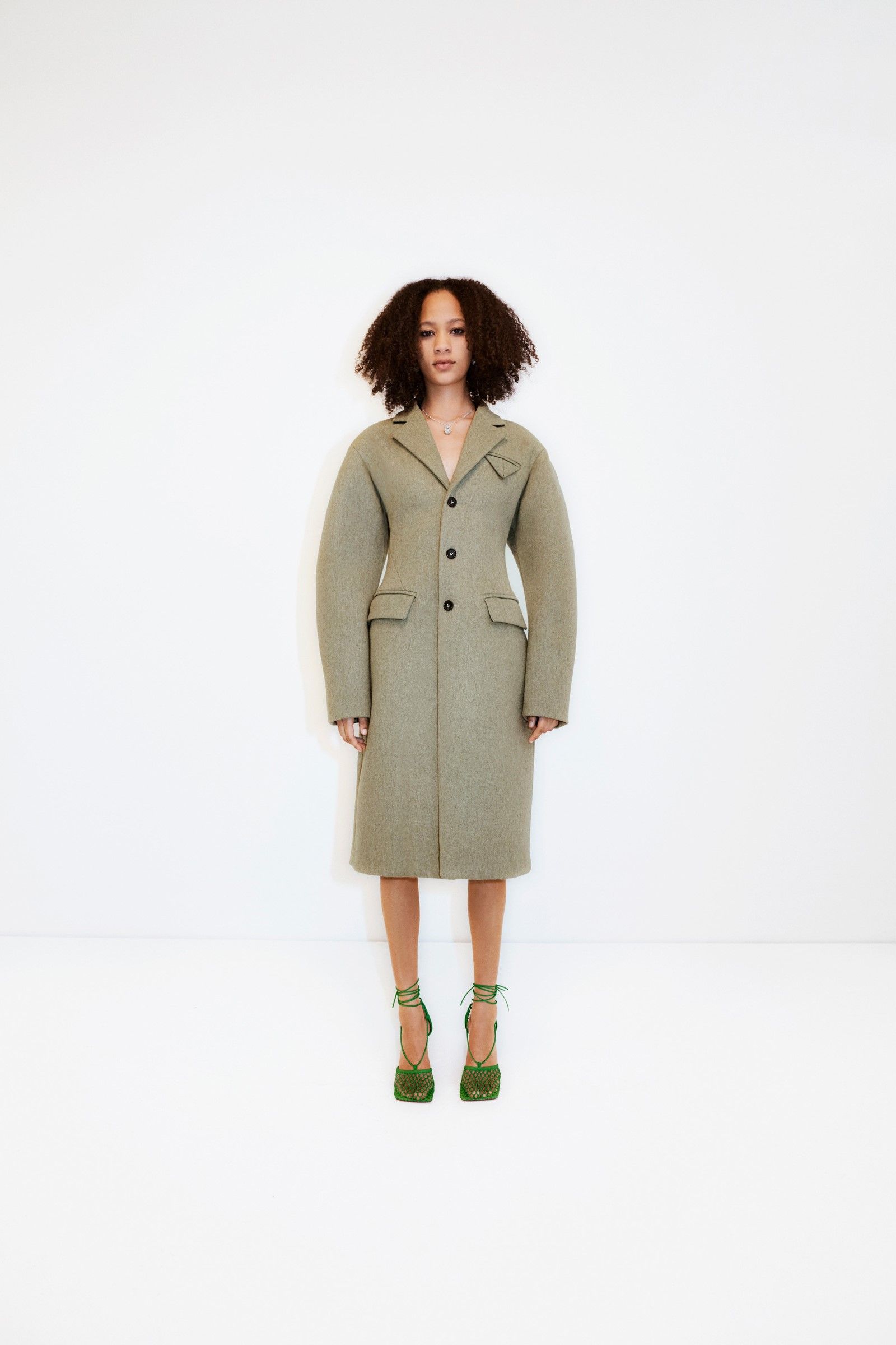 Fra tutte le collezioni finora disegnate da Lee, questa è quella che legge con maggior leggerezza l’identità di Bottega Veneta – identità che si manifesta attraverso la moltiplicazione delle forme a V che costellano l’intera collezione sotto forma di dettagli sartoriali: baveri di giacche, taschini, intarsi nei maglioni e, soprattutto, in una nuova borsa di pelle dove la V di “Veneta” diventa un fermaglio a metà fra il liberty e il futuristico. È una risposta personale al concetto di logomania, ancora importante per enormi brand come Dior ad esempio, che vuole trasformare il logo, inteso come elemento estraneo alla struttura del capo, in signature mantenendo la sua riconoscibilità e, soprattutto, coltivando una radicale originalità. Sulla questione, Lee stesso si è espresso con grande semplicità ed eloquenza: