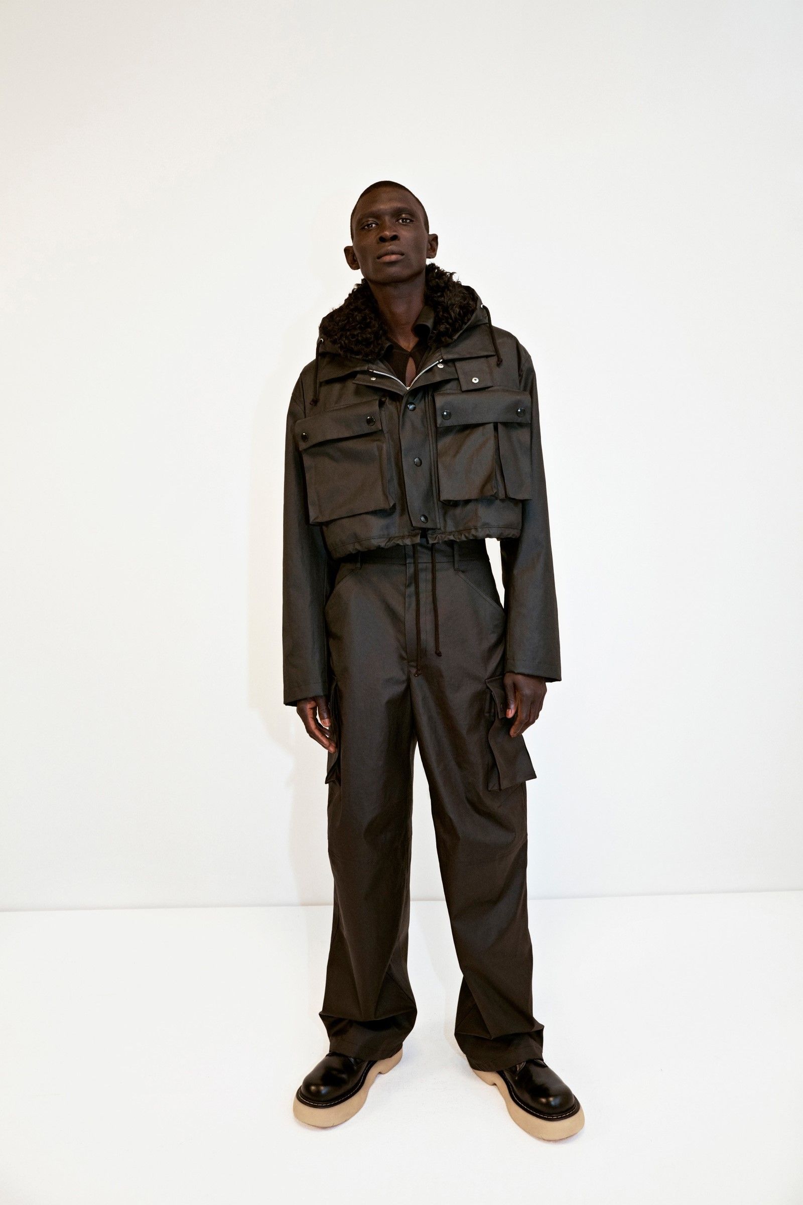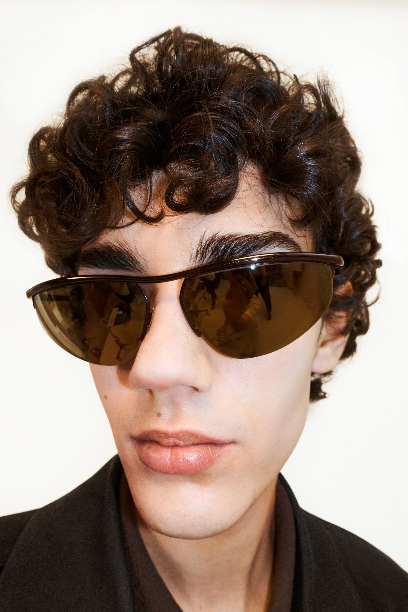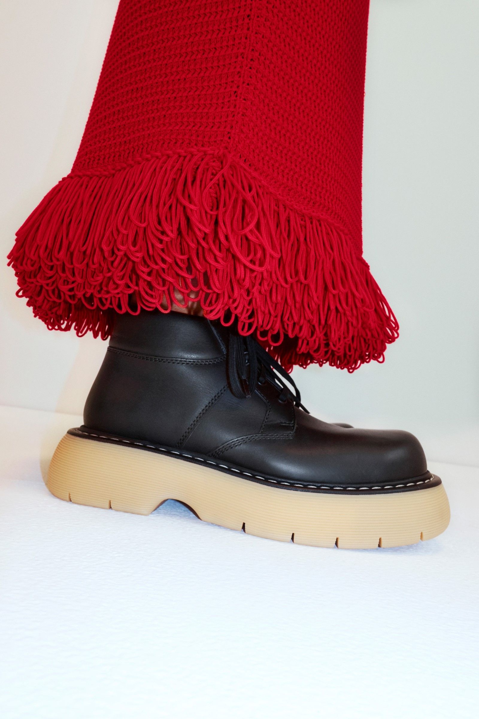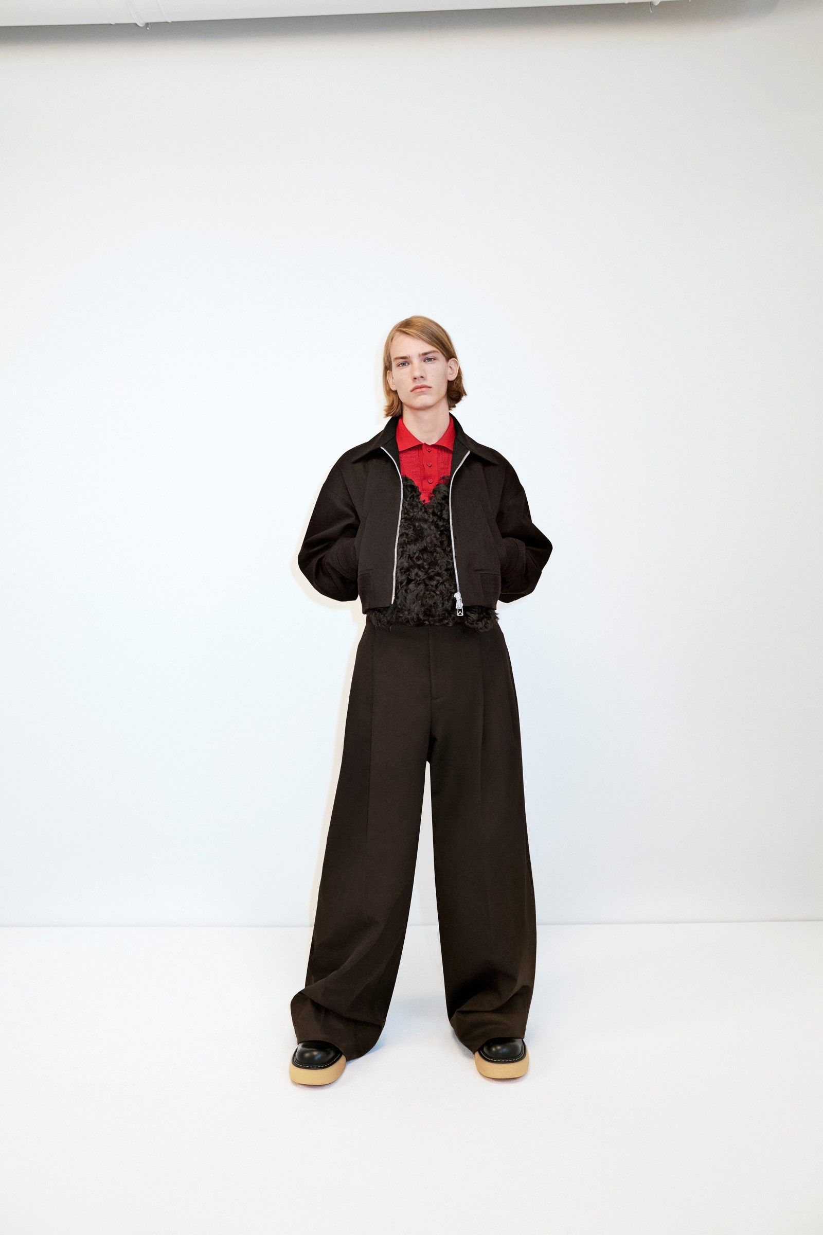 Fra tutte le collezioni finora disegnate da Lee, questa è quella che legge con maggior leggerezza l’identità di Bottega Veneta – identità che si manifesta attraverso la moltiplicazione delle forme a V che costellano l’intera collezione sotto forma di dettagli sartoriali: baveri di giacche, taschini, intarsi nei maglioni e, soprattutto, in una nuova borsa di pelle dove la V di “Veneta” diventa un fermaglio a metà fra il liberty e il futuristico. È una risposta personale al concetto di logomania, ancora importante per enormi brand come Dior ad esempio, che vuole trasformare il logo, inteso come elemento estraneo alla struttura del capo, in signature mantenendo la sua riconoscibilità e, soprattutto, coltivando una radicale originalità. Sulla questione, Lee stesso si è espresso con grande semplicità ed eloquenza: