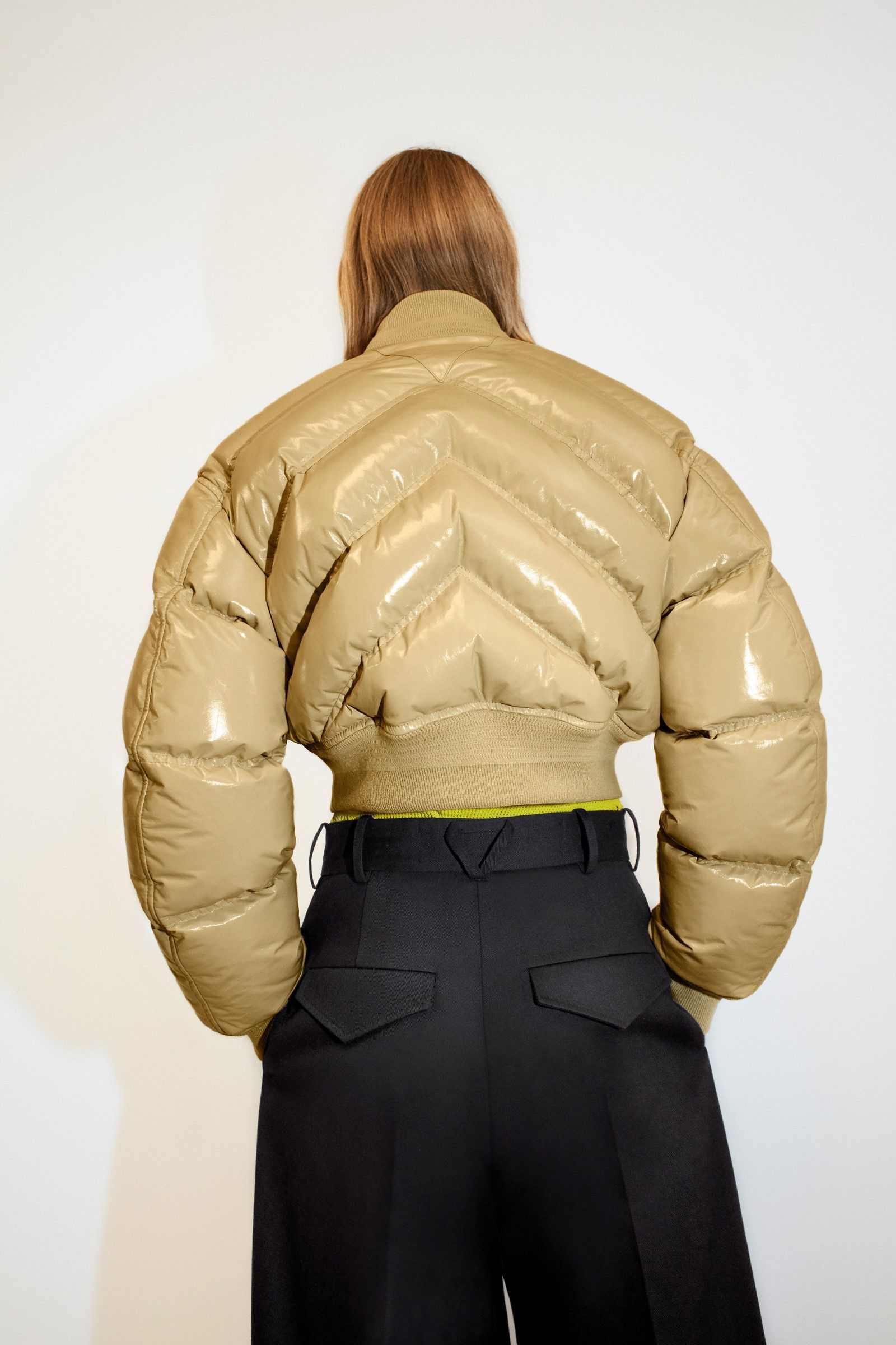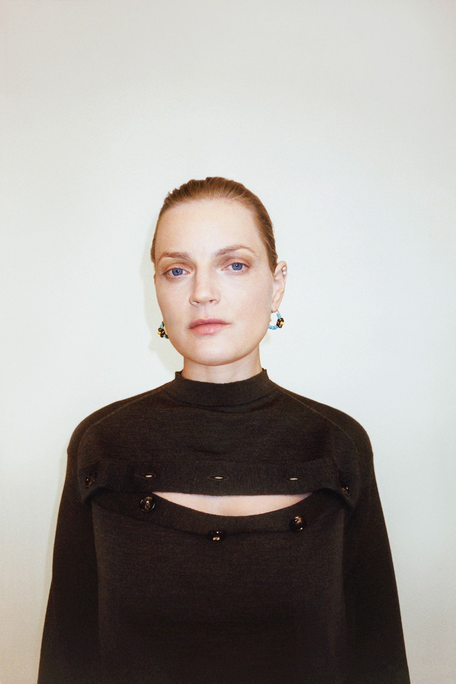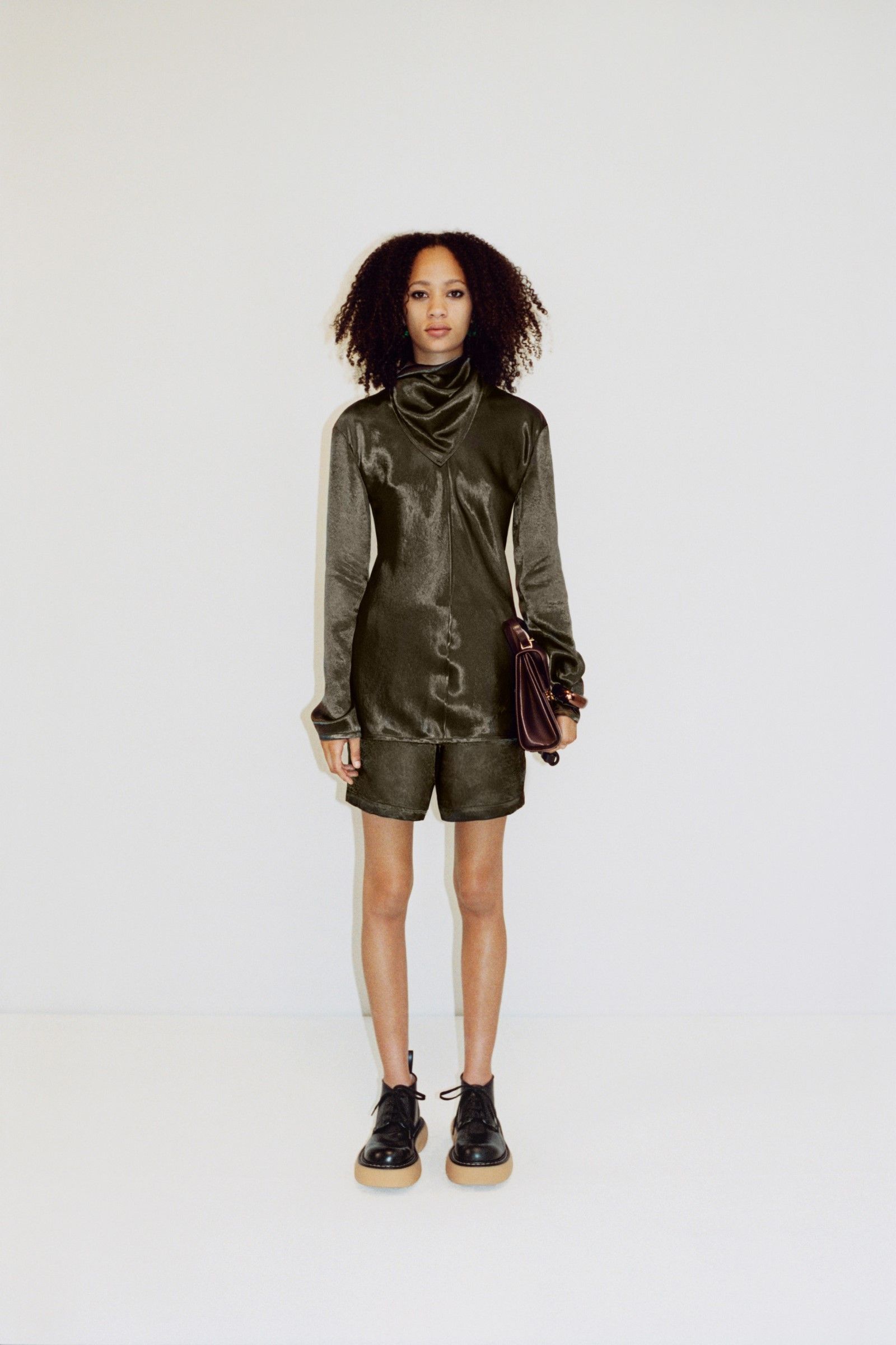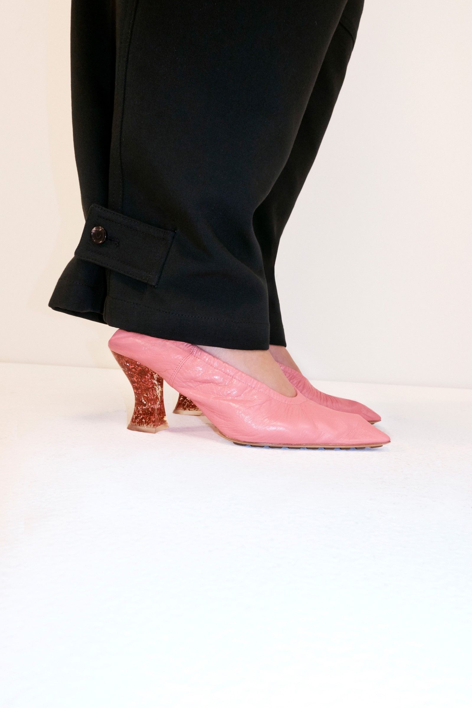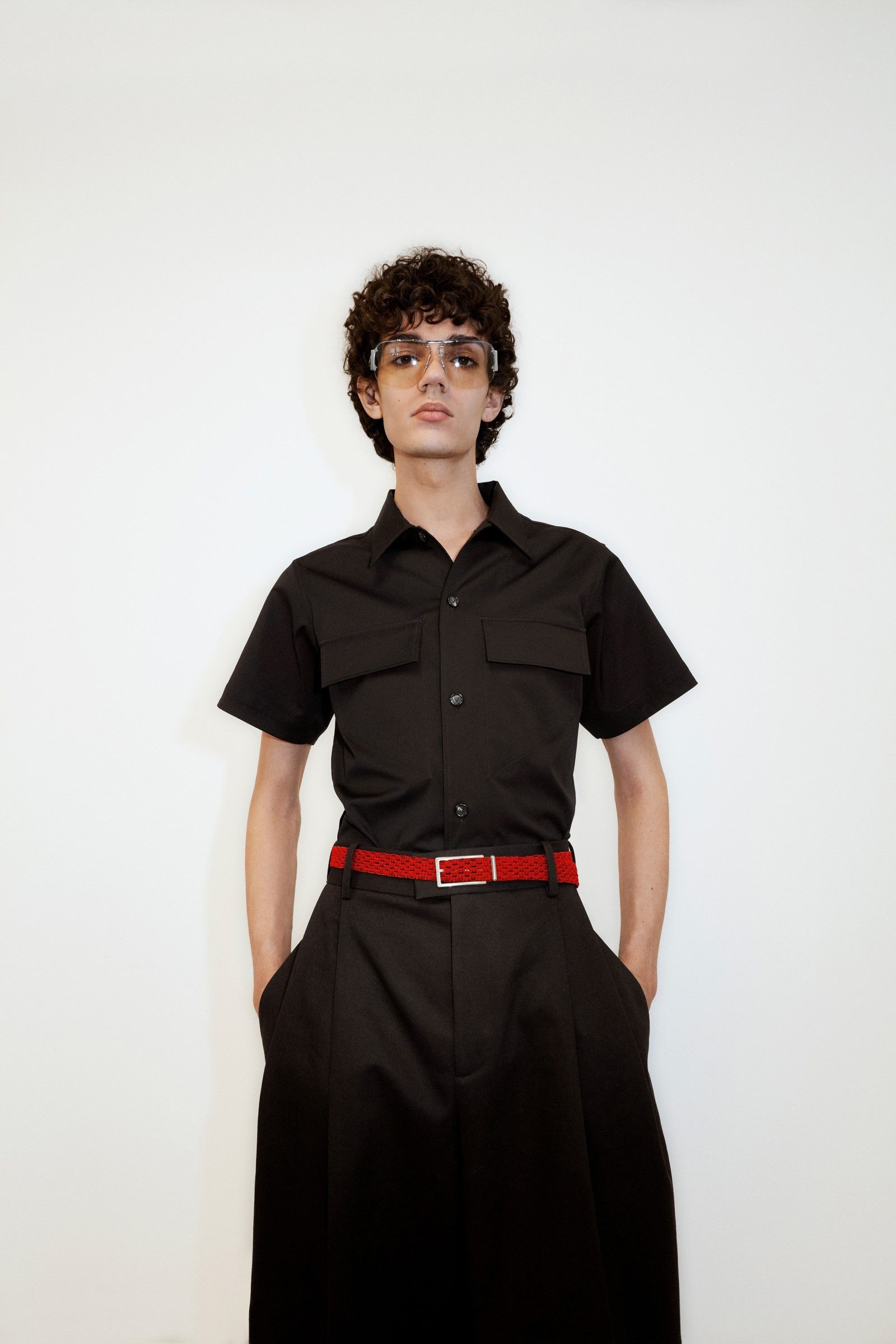 Fra tutte le collezioni finora disegnate da Lee, questa è quella che legge con maggior leggerezza l’identità di Bottega Veneta – identità che si manifesta attraverso la moltiplicazione delle forme a V che costellano l’intera collezione sotto forma di dettagli sartoriali: baveri di giacche, taschini, intarsi nei maglioni e, soprattutto, in una nuova borsa di pelle dove la V di “Veneta” diventa un fermaglio a metà fra il liberty e il futuristico. È una risposta personale al concetto di logomania, ancora importante per enormi brand come Dior ad esempio, che vuole trasformare il logo, inteso come elemento estraneo alla struttura del capo, in signature mantenendo la sua riconoscibilità e, soprattutto, coltivando una radicale originalità. Sulla questione, Lee stesso si è espresso con grande semplicità ed eloquenza:
