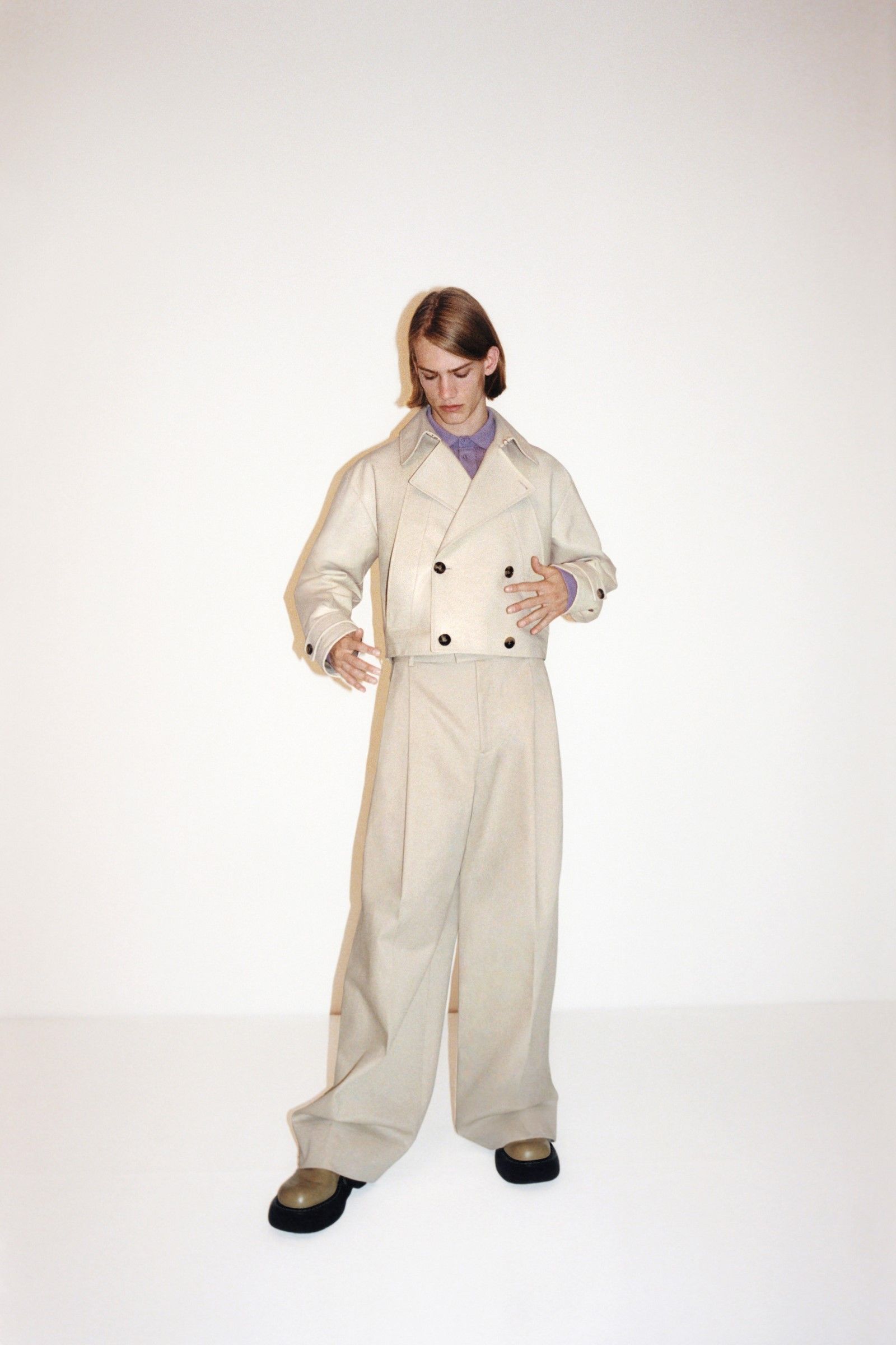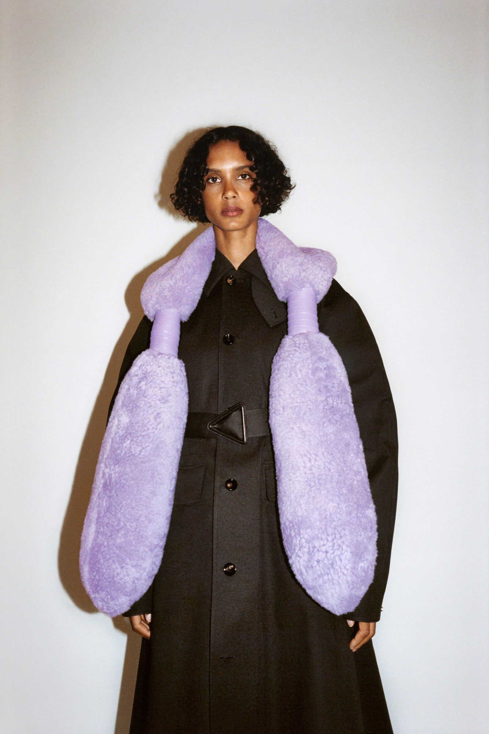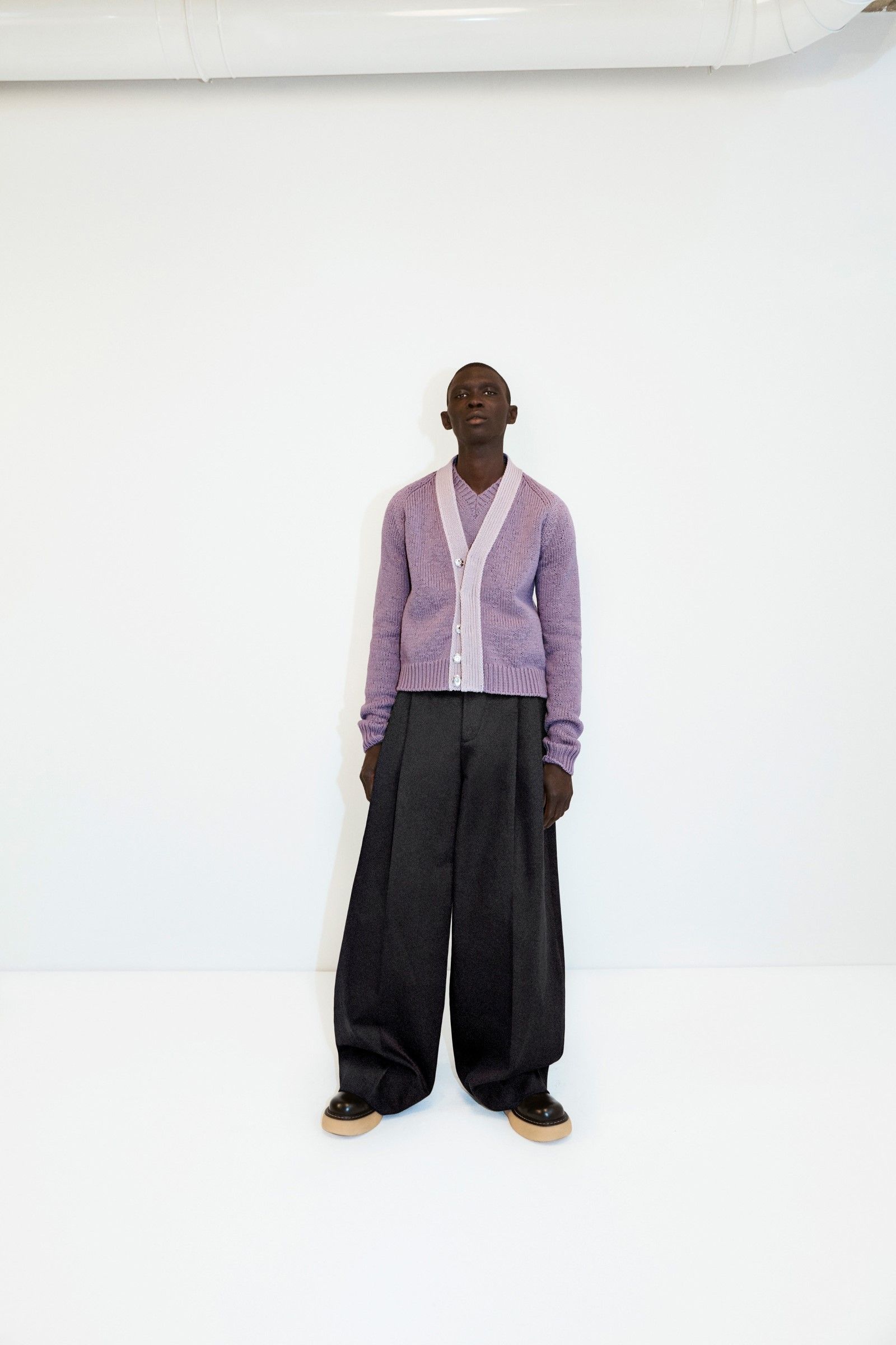 Una moda più rilassata e comoda è quella che emerge dalla quarantena, che si porta dietro una certa spensieratezza e giocosità – antidoti alla cupezza dei tempi - ma senza rinunciare alla sofisticazione formale. Rimane però invariata la teatralità delle silhouette che da snelle e sensuali diventano morbide e accoglienti. L’estetica loungewear si manifesta nel gioco fra pantaloni a vita alta dal fit ampio quanto quello di una tunica e da top, sia maschili per femminili, leggermente cropped alla vita. Meno radicale è la silhouette femminile, che compensa però in rotondità e morbidezza quanto perde in vaporosità e ampiezza: l’item più importante della collezione in questo senso è il completo lilla in knitwear che apre il lookbook insieme ai vari cappotti in faux-fur. Altro elemento in cui la giocosità di questa collezione si manifesta sono le scarpe che, oltre ai design già noti, diventano tondeggianti e lucide, ma assai meno futuristiche delle calzature apparse nella collezione FW20.