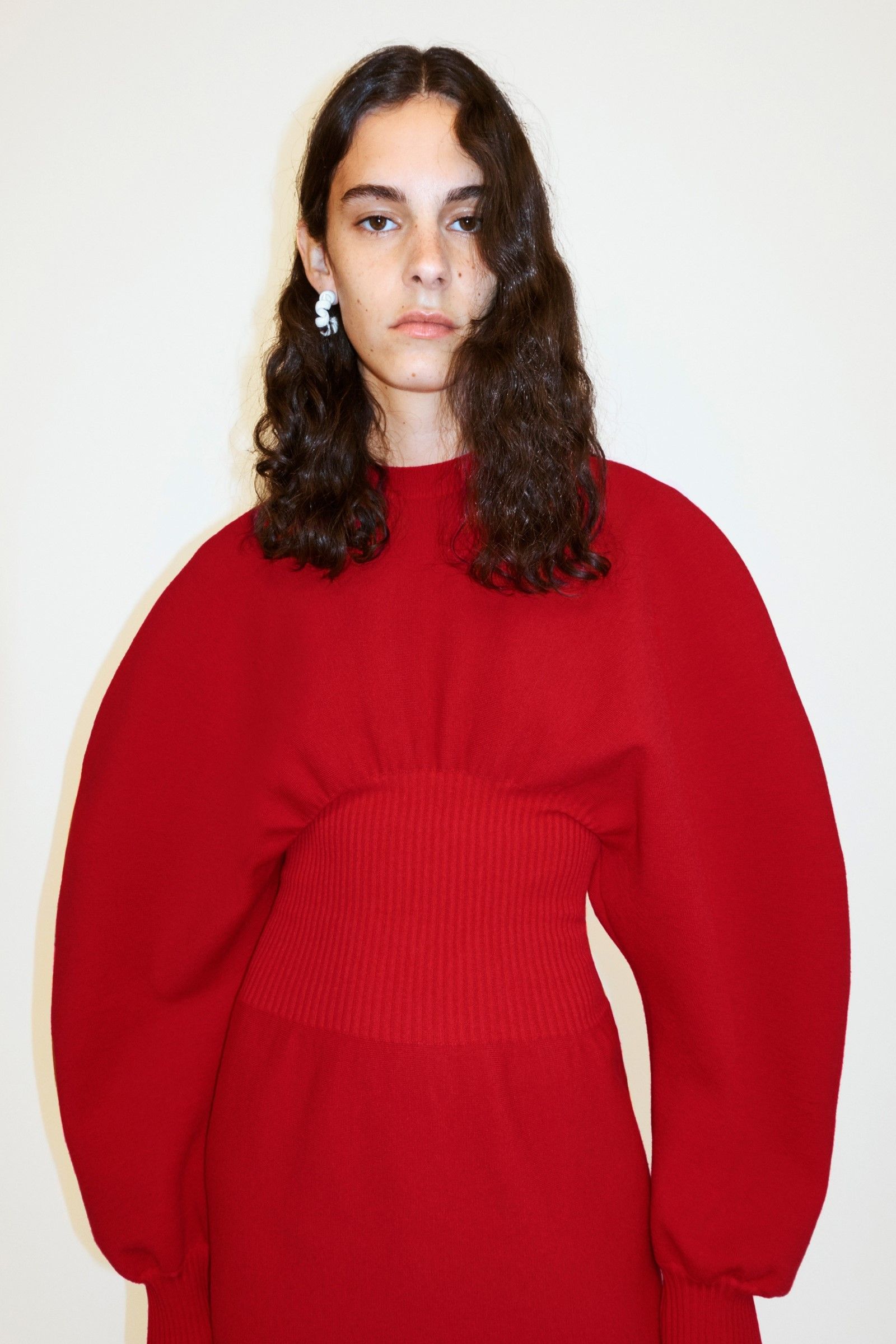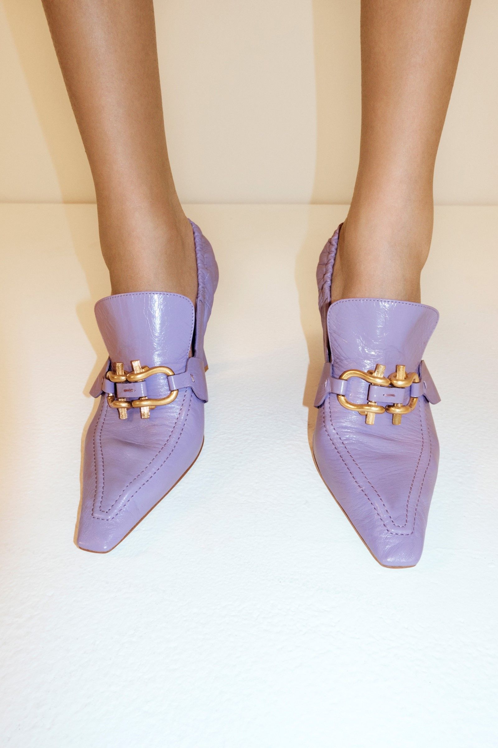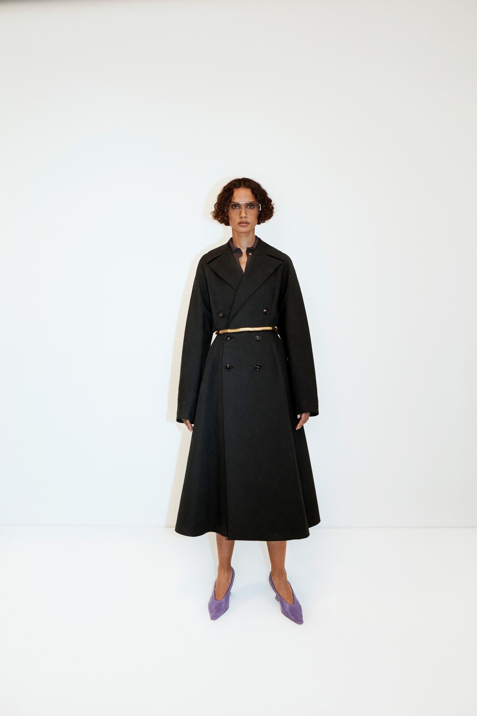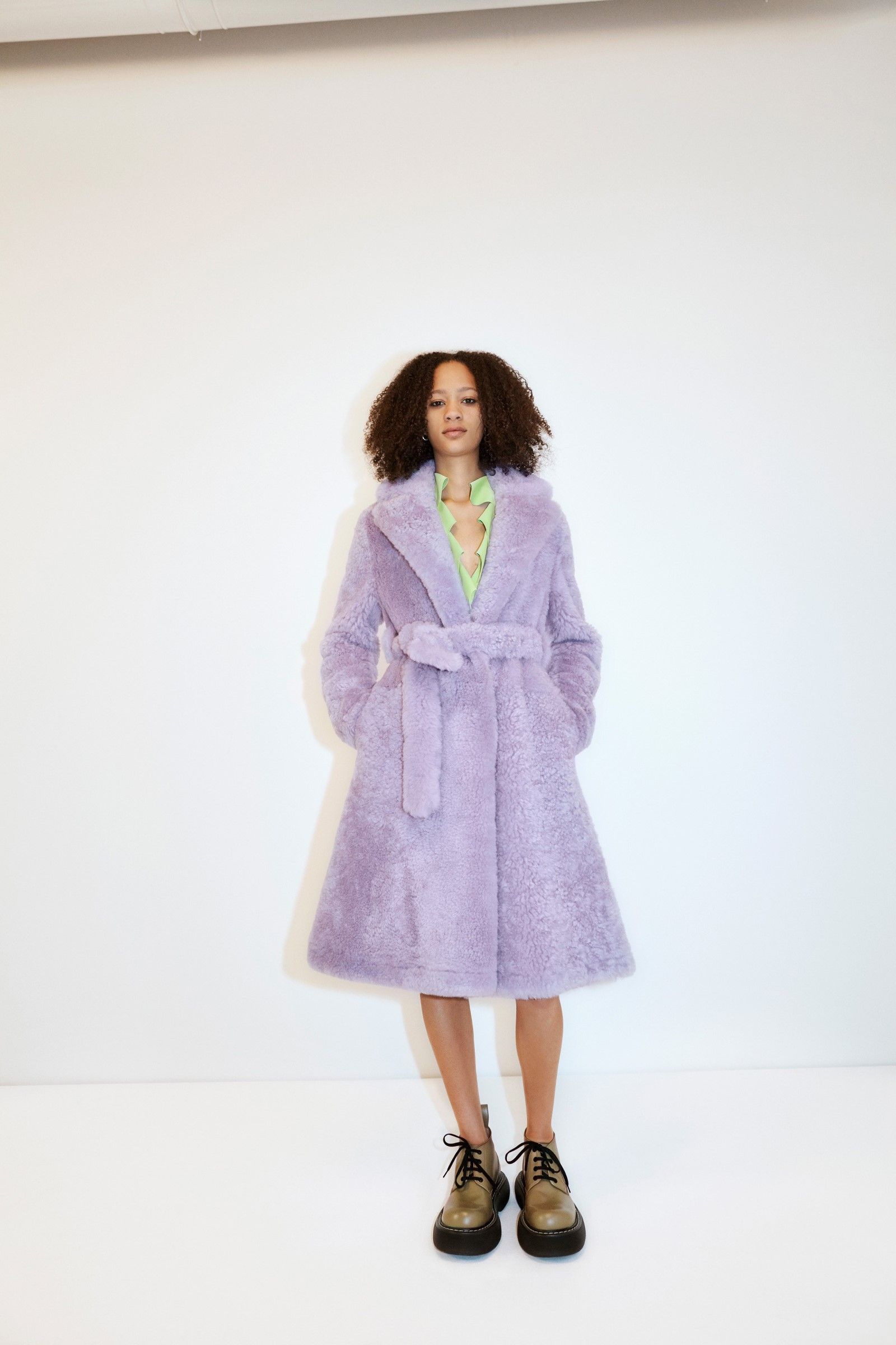 Una moda più rilassata e comoda è quella che emerge dalla quarantena, che si porta dietro una certa spensieratezza e giocosità – antidoti alla cupezza dei tempi - ma senza rinunciare alla sofisticazione formale. Rimane però invariata la teatralità delle silhouette che da snelle e sensuali diventano morbide e accoglienti. L’estetica loungewear si manifesta nel gioco fra pantaloni a vita alta dal fit ampio quanto quello di una tunica e da top, sia maschili per femminili, leggermente cropped alla vita. Meno radicale è la silhouette femminile, che compensa però in rotondità e morbidezza quanto perde in vaporosità e ampiezza: l’item più importante della collezione in questo senso è il completo lilla in knitwear che apre il lookbook insieme ai vari cappotti in faux-fur. Altro elemento in cui la giocosità di questa collezione si manifesta sono le scarpe che, oltre ai design già noti, diventano tondeggianti e lucide, ma assai meno futuristiche delle calzature apparse nella collezione FW20.
