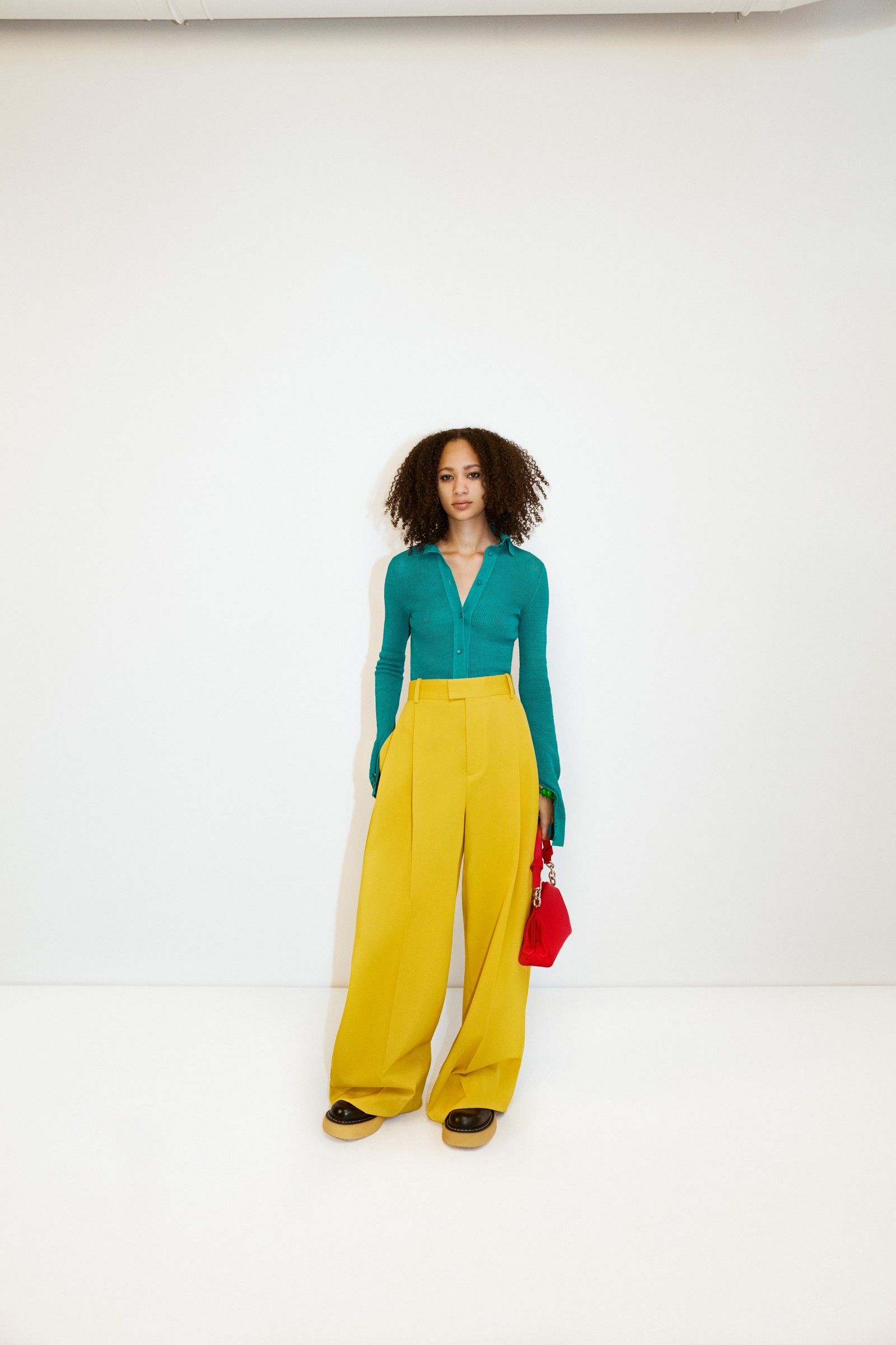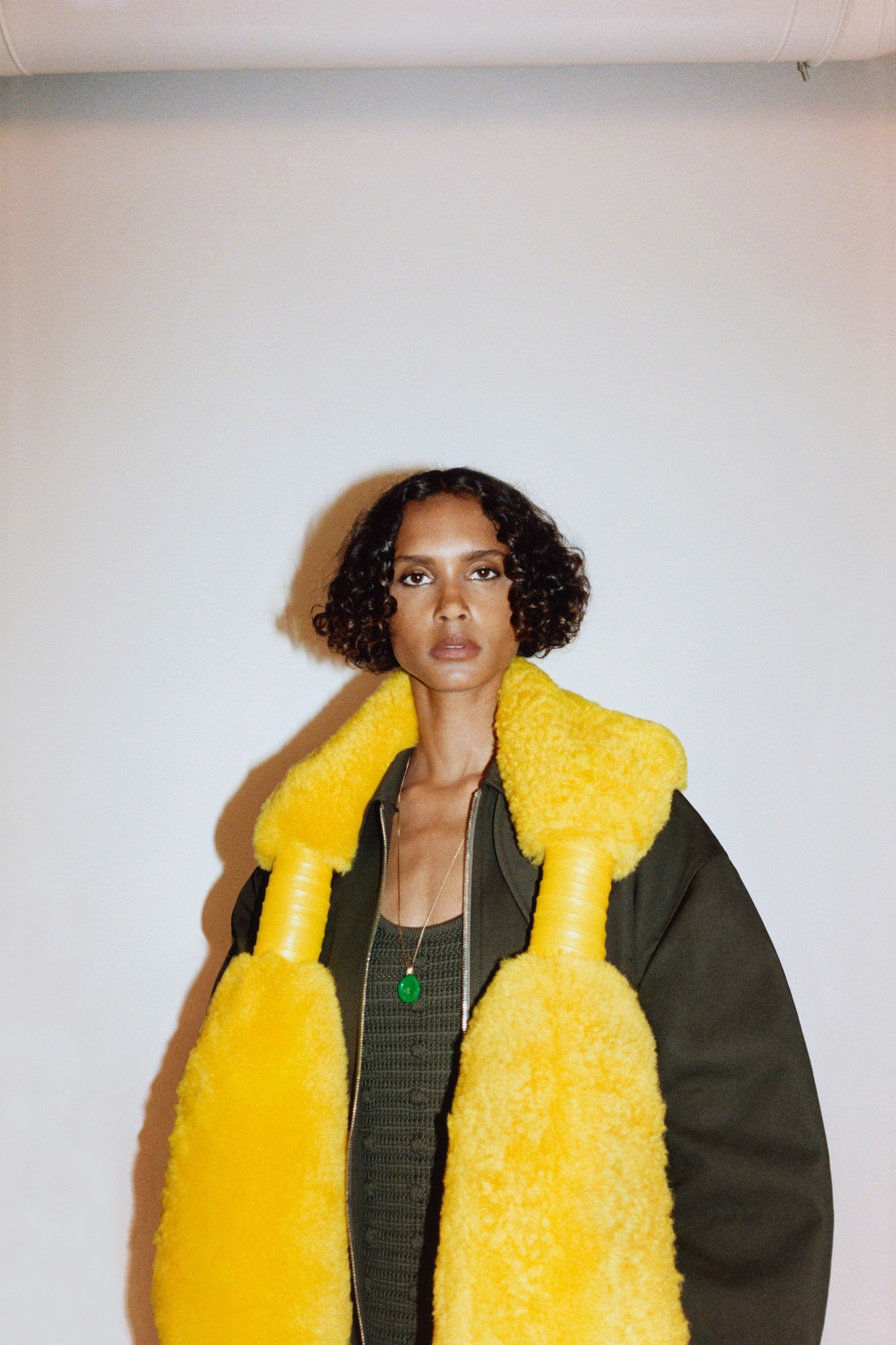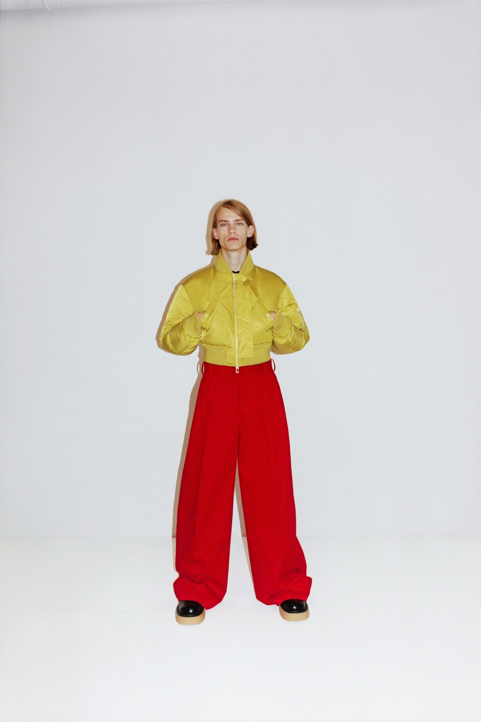 Insieme alle forme, i colori diventano l’elemento fondamentale che vivifica i design di Lee e del suo team. L’emozione e la giocosità che si volevano dare alla collezione vengono comunicati attraverso sfumature di lilla, di antracite e di giallo. È il lato womanswear della collezione il principale campo da gioco di colorway e texture diverse e anche l’unico in cui appare un vivace pattern a stampa giallo e verde, composto da figure umane nude intrecciate le une con le altre, che è una delle novità della collezione è che certamente continueremo a vedere in futuro. Più severa è invece la palette di colori per l’uomo, ricca di colori scuri e sobri, ma con occasionali lampi di verde e rosso che fanno capolino da sotto le giacche.