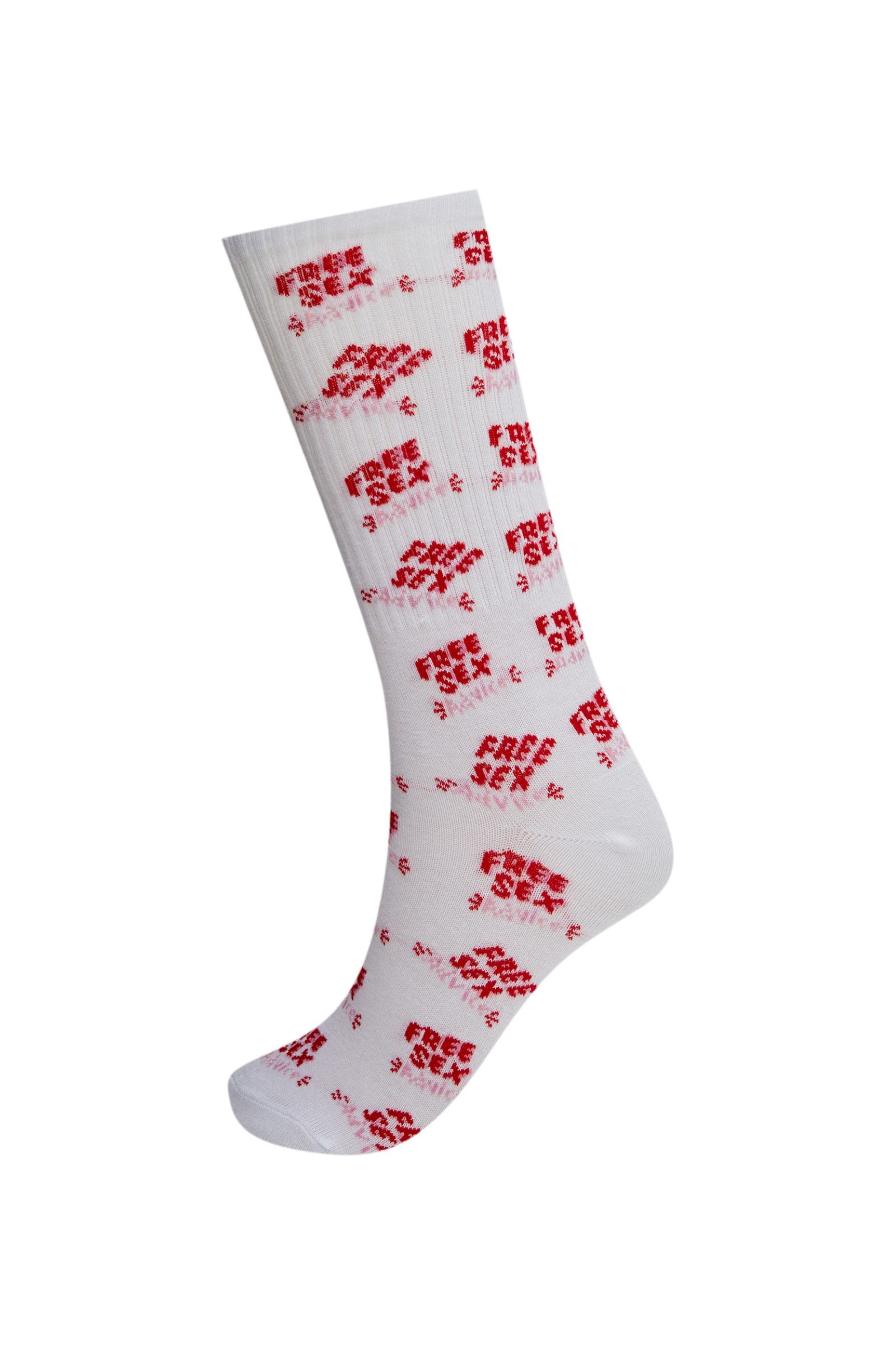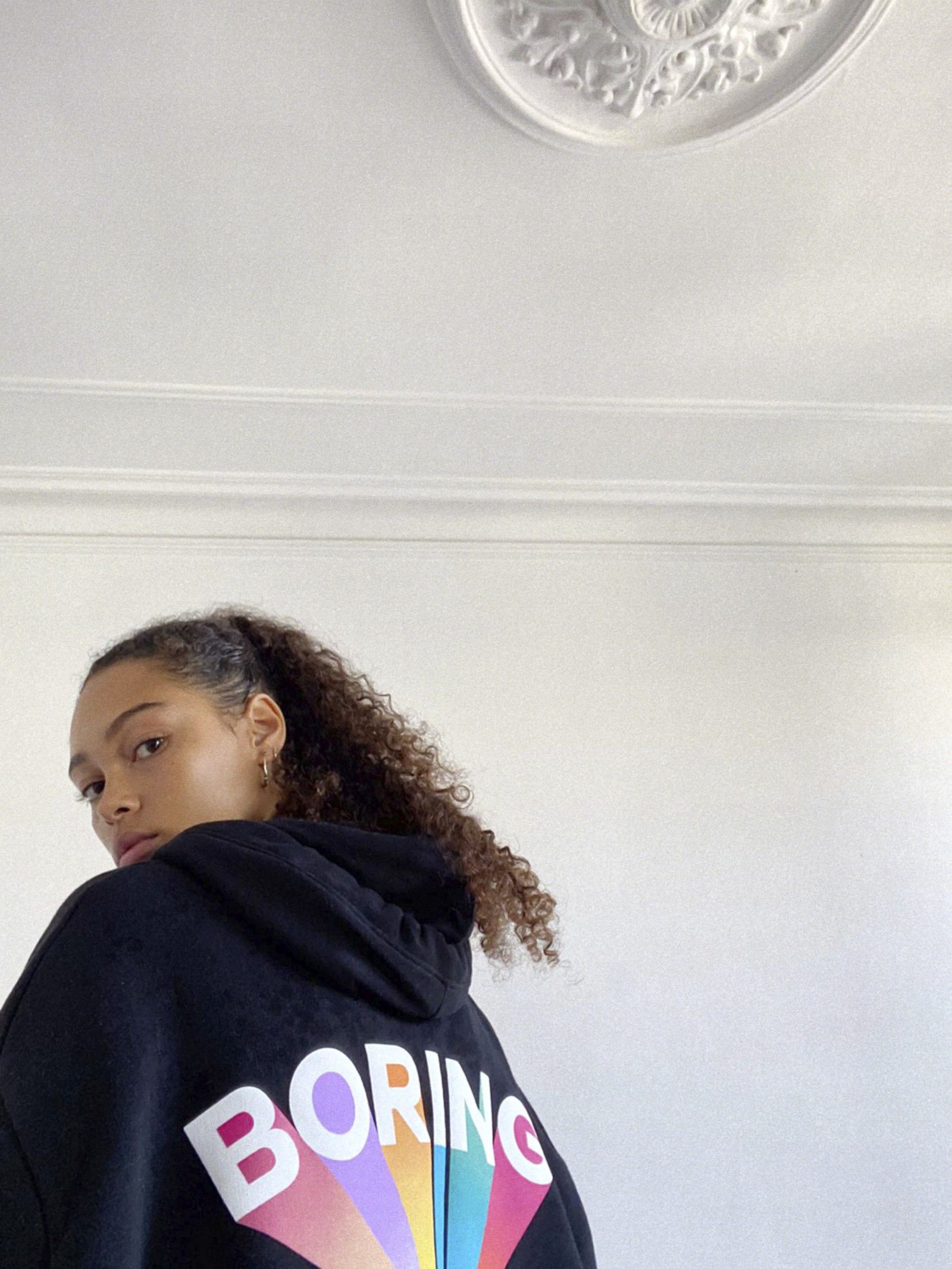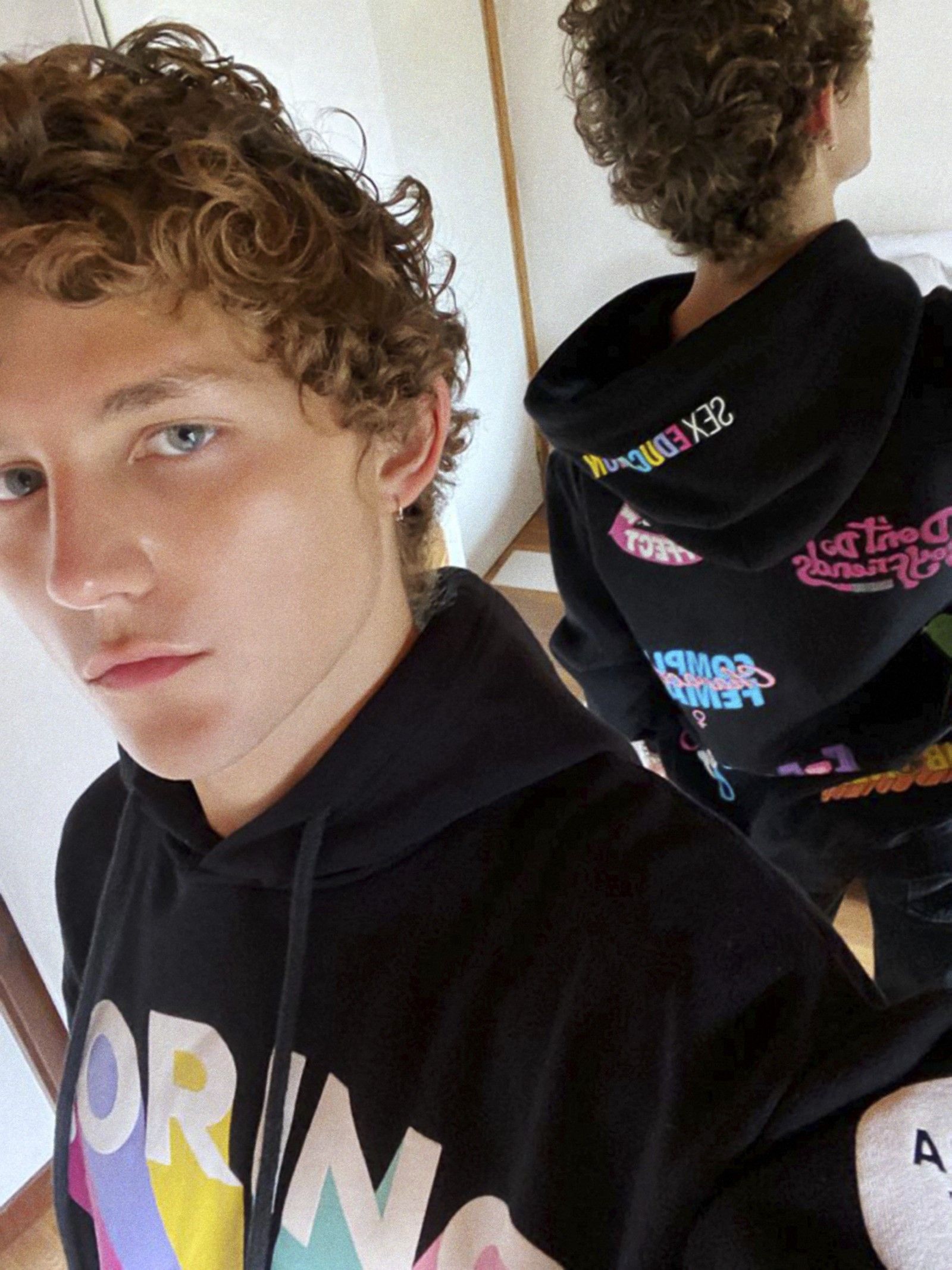 Il resto della collezione include un range di t-shirt e hoodie dedicate ai fan della serie con le foto d’insieme del cast come la felpa "Maeve & Otis" o la t-shirt con Maeve e Aimee, shot tratti dagli episodi più belli e anche grafiche del tutto originali come ad esempio la grafica "Boring" che appare su una delle felpe. La tee più interessante è la long-sleeve bianca in cui è riprodotta in versione pop-art un dettaglio della scena del bacio di Maeve e di Jackson, grafica presente anche su una hoodie nera. Fra gli accessori, invece, va segnalato un notevole paio di calzini bianchi in spugna con la scritta “Free Sex Advice” ma con le due prime parole in rosso acceso e l’ultima, meno visibile, in rosa – una pungente interpretazione dell’umorismo mindful ma sempre piccante di Sex Education. Il resto degli accessori include anche berretti, bucket hat, toppe per decorare abiti, shopping bag e anche una cover per il cellulare.