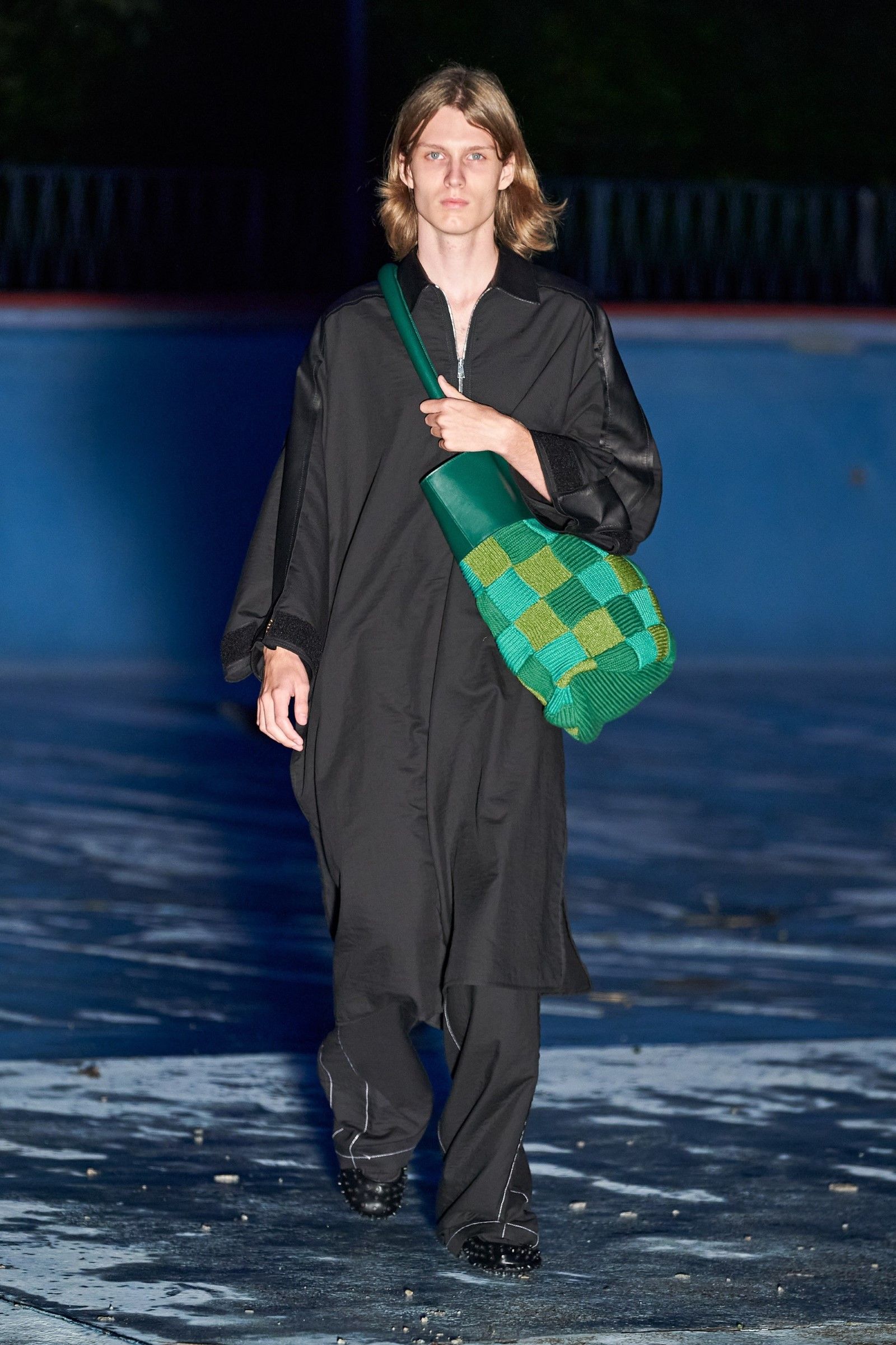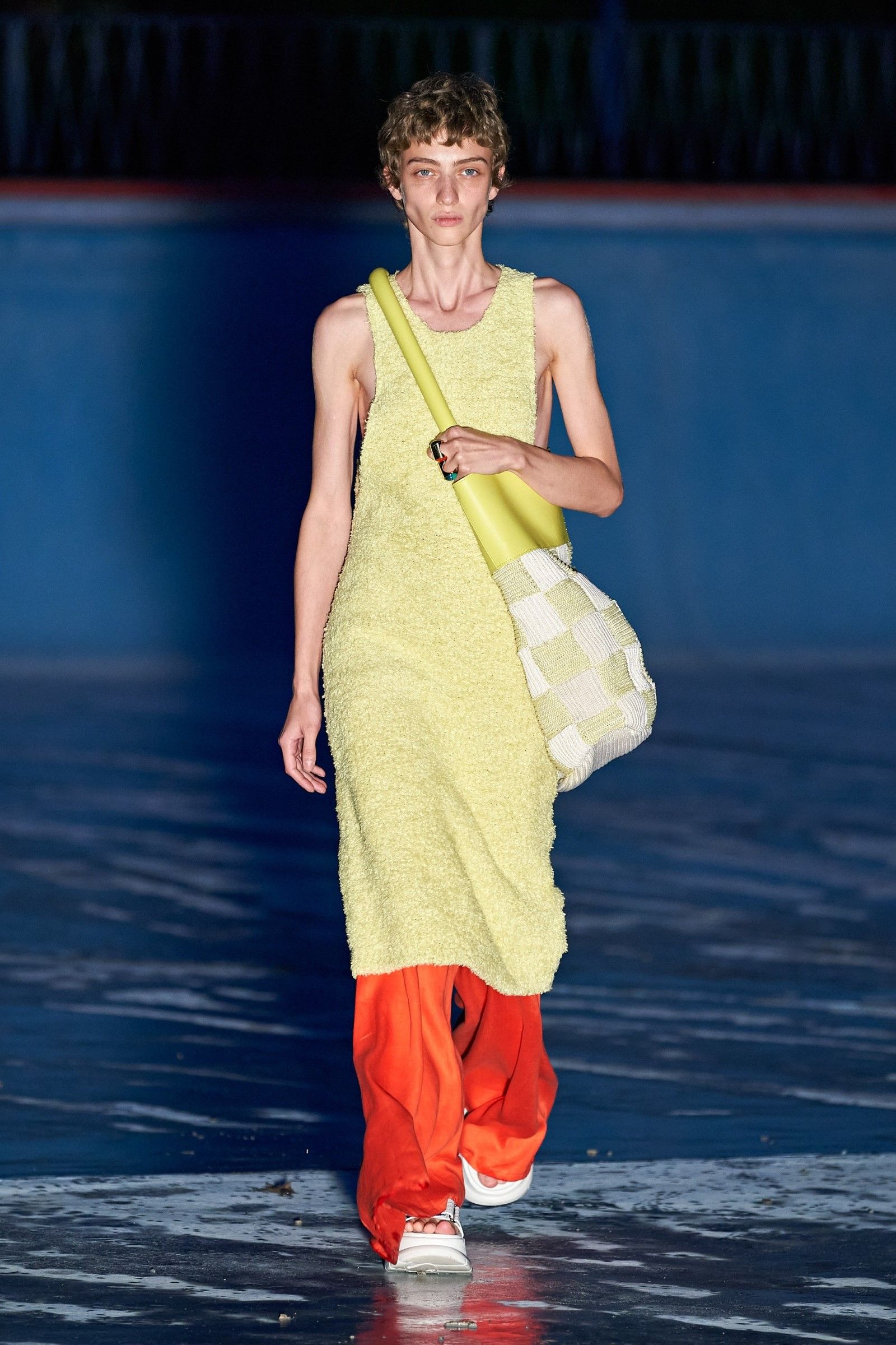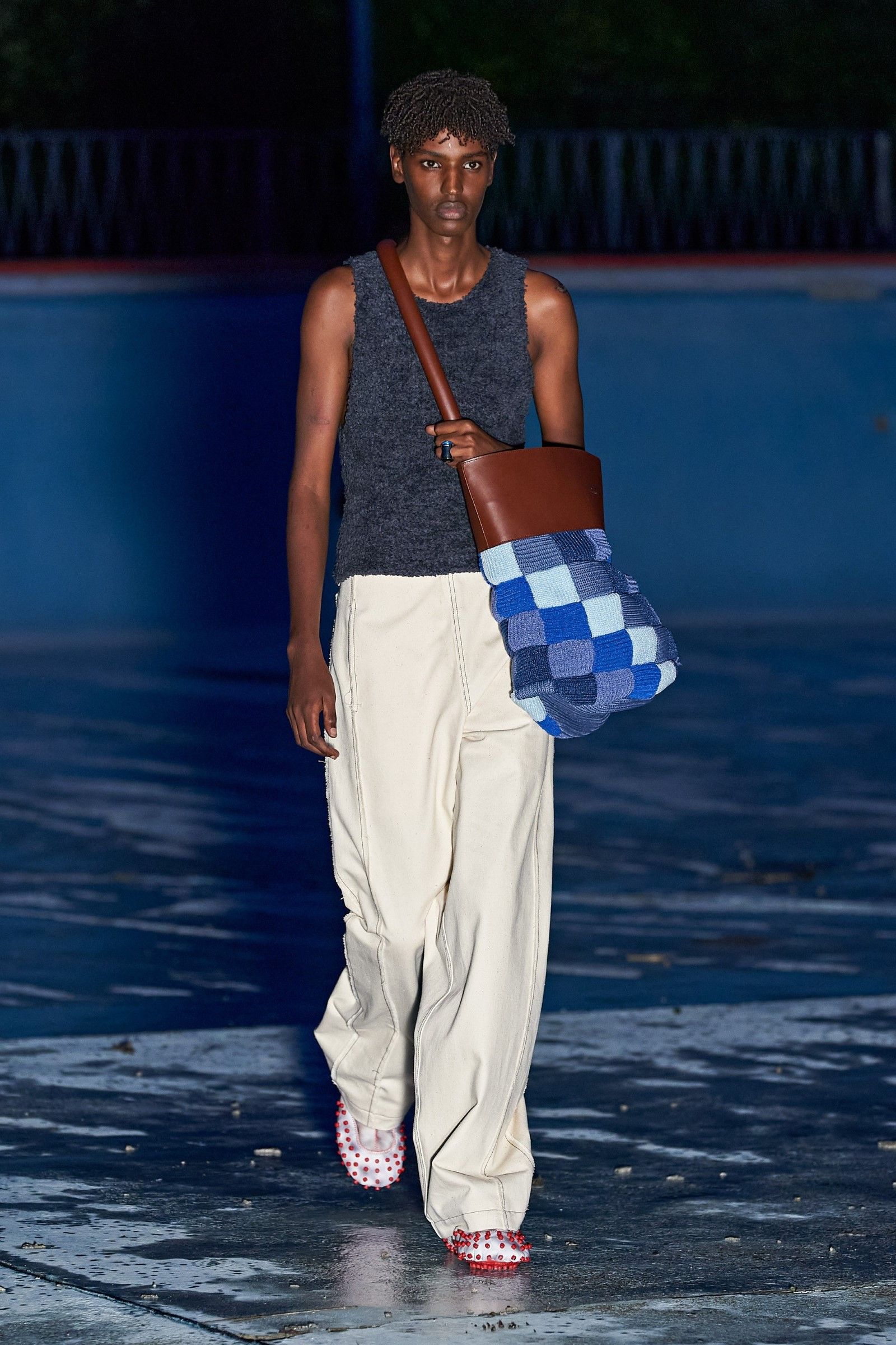 Una nuova crudezza si è fatta strada nei design dei due direttori creativi di Sunnei – manifestata nel trattamento delle cuciture di certi pantaloni, negli orli di un top femminile in denim, nei manici ultra-massimalisti di alcune delle borse squadrate ma anche nella lavorazione crochet di una borsa alternata alla tradizionale lucida pelle oltre che nel profluvio di check pattern e di contrast stitching che decora alcuni dei look. La collezione non ne ha alterato le linee fondamentali dell’identità del brand ma le ha colorate con pennellate più ampie e dure – cioè più energiche.