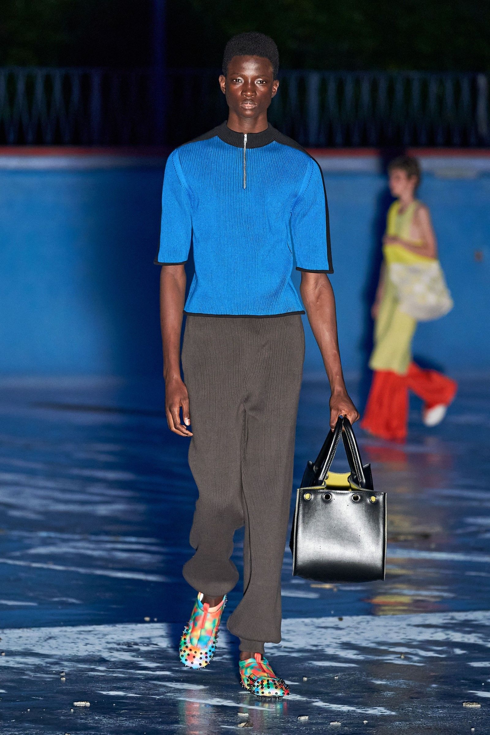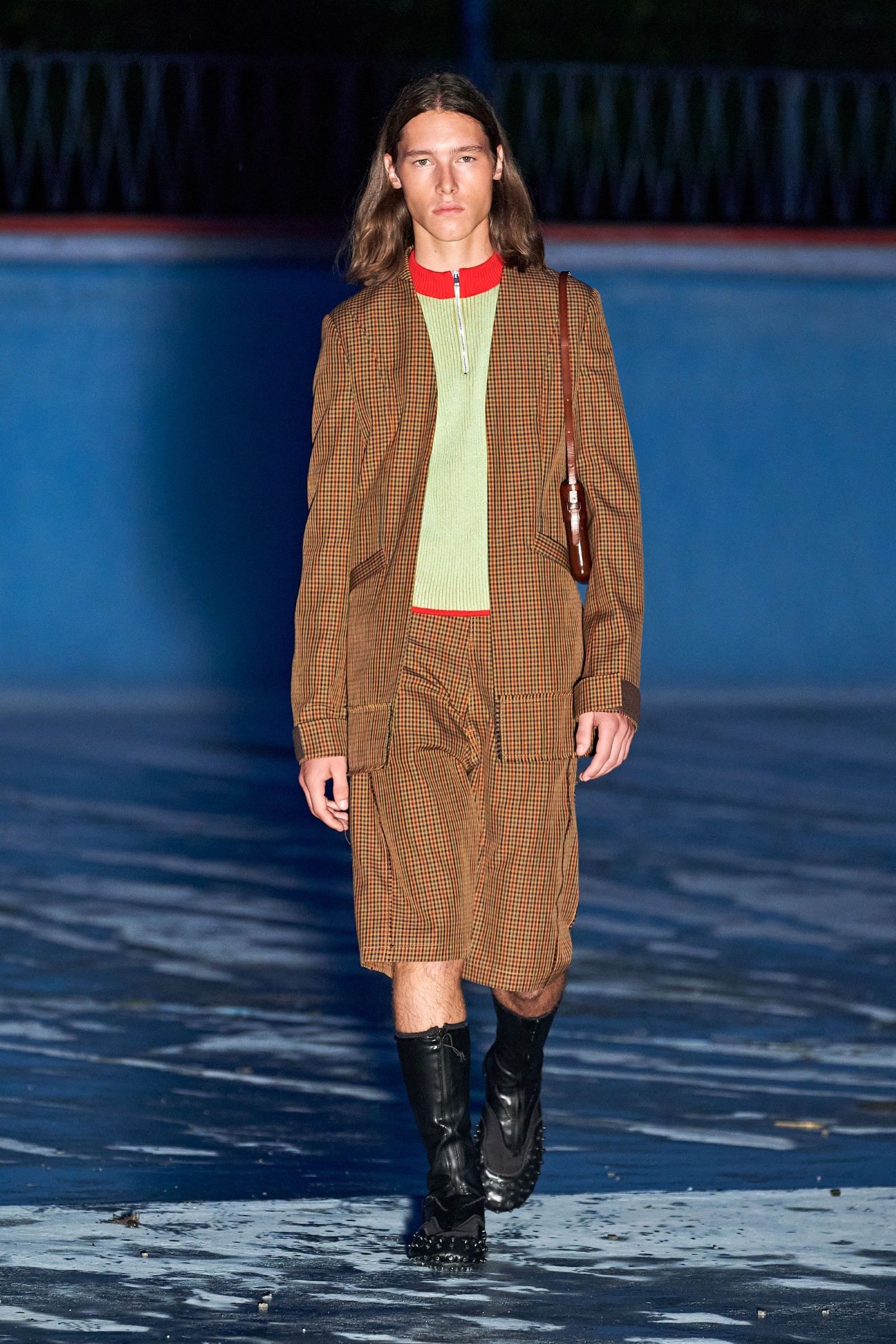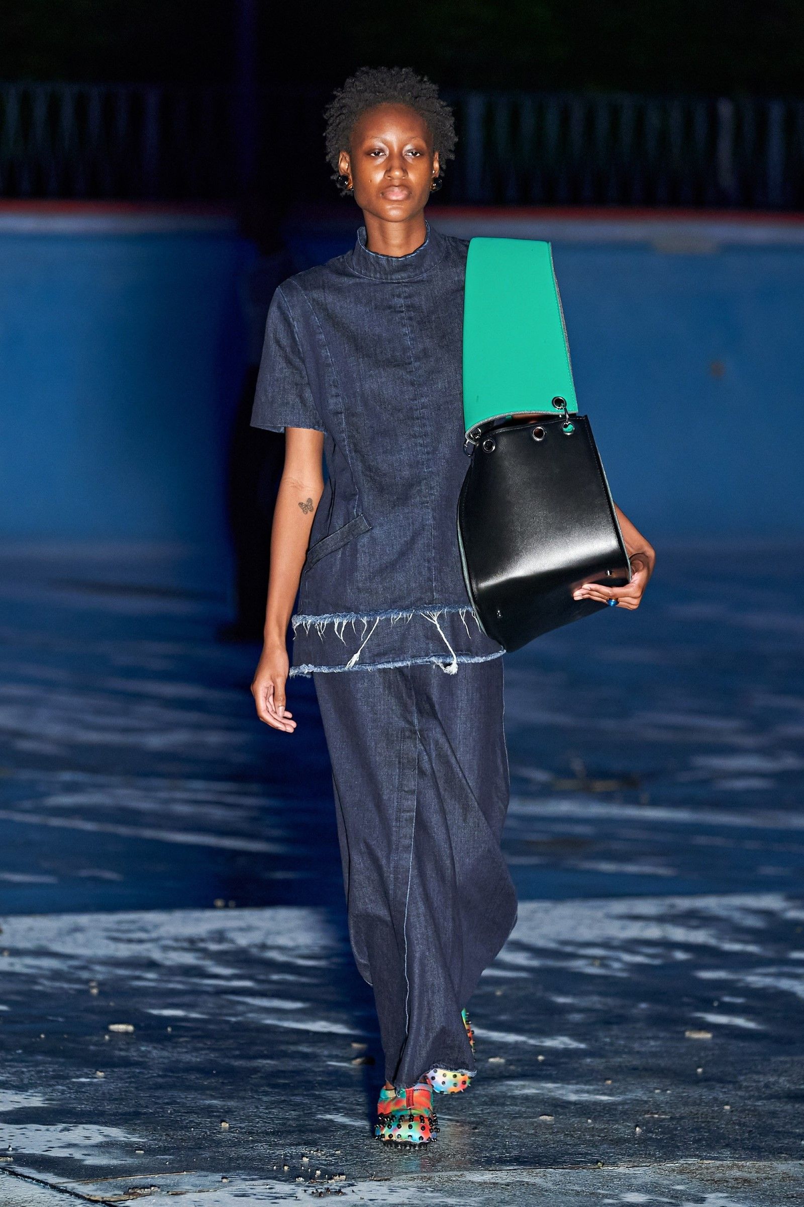 Una nuova crudezza si è fatta strada nei design dei due direttori creativi di Sunnei – manifestata nel trattamento delle cuciture di certi pantaloni, negli orli di un top femminile in denim, nei manici ultra-massimalisti di alcune delle borse squadrate ma anche nella lavorazione crochet di una borsa alternata alla tradizionale lucida pelle oltre che nel profluvio di check pattern e di contrast stitching che decora alcuni dei look. La collezione non ne ha alterato le linee fondamentali dell’identità del brand ma le ha colorate con pennellate più ampie e dure – cioè più energiche.