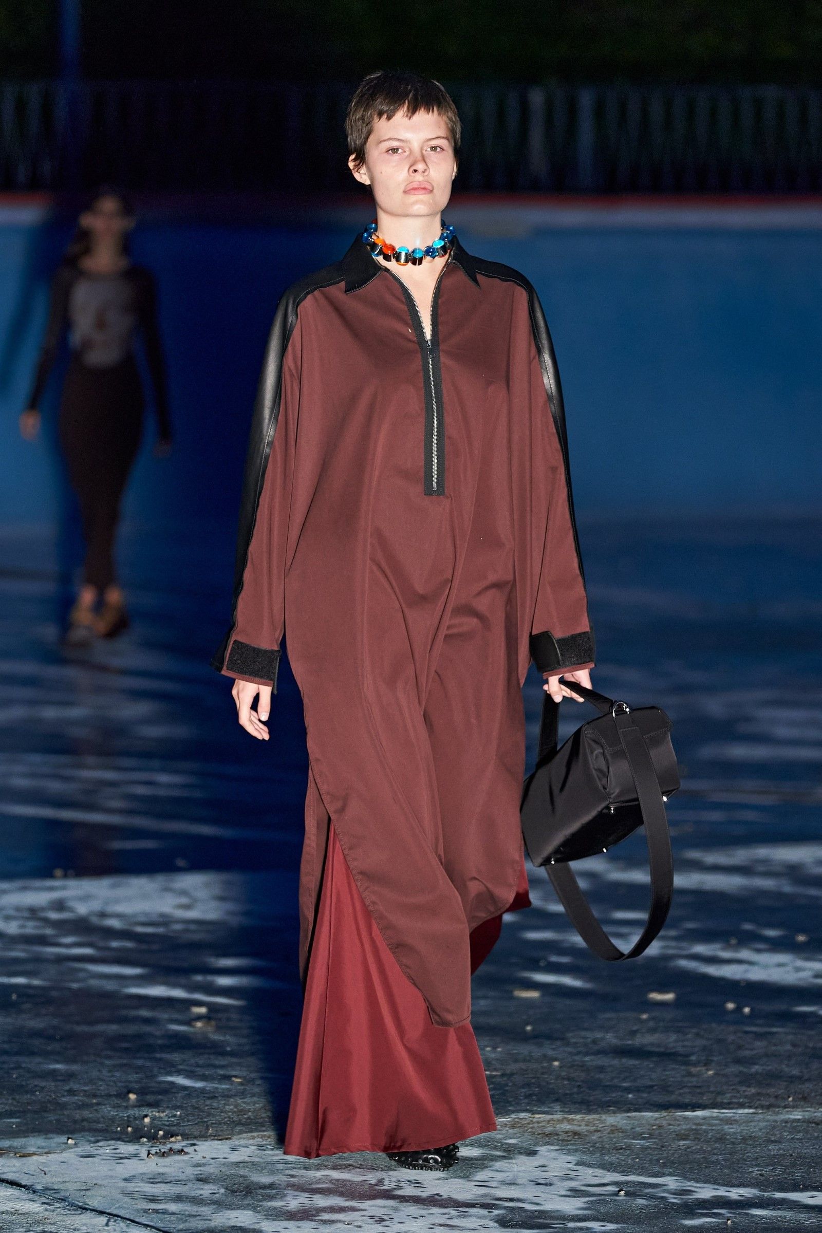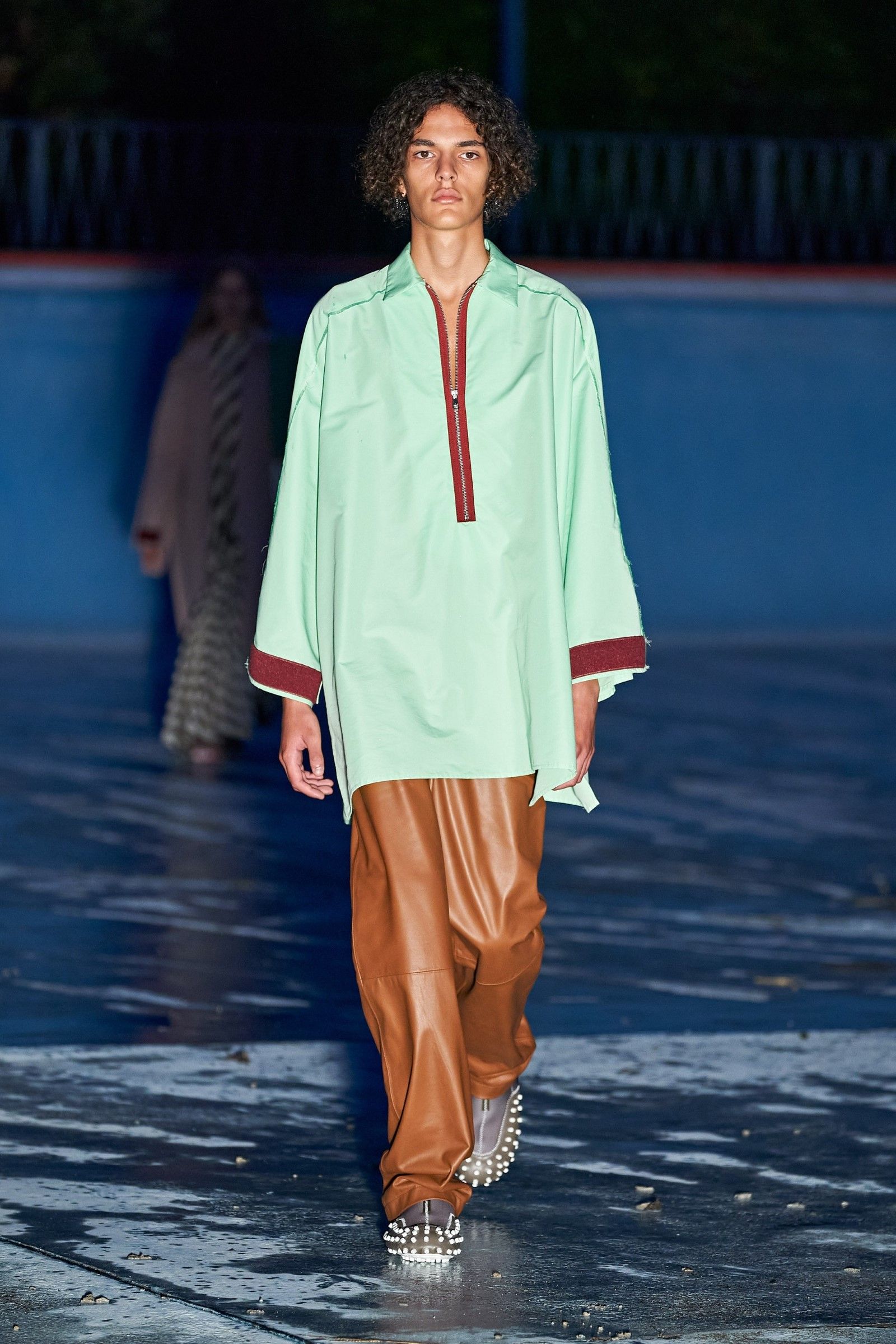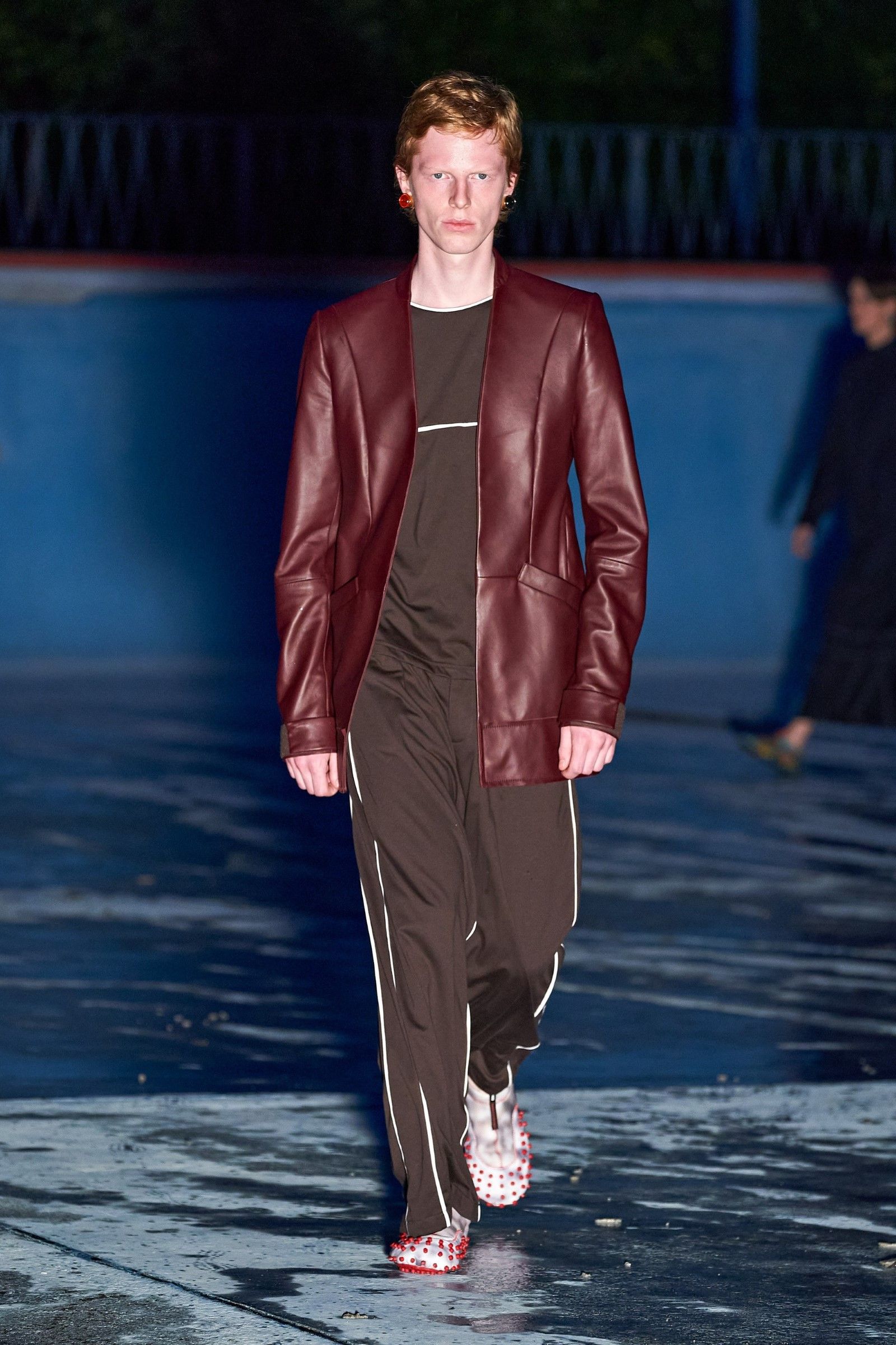 Se il womanswear della collezione, infine, appare il più strutturato e architettonico, con layering e accessori, oltre che con abiti in color blocking e cuciture che tagliano le sagome nella parte inferiore, il menswear appare invece semplificato. C’è quasi un senso di orientalismo nei top per uomo, che diventano quasi caftani e tuniche in certi casi, e nelle giacche prive di baveri, le cui linee si curvano secondo un’estetica vagamente asiatica. Non mancano ovviamente le ispirazioni sportswear rese più sofisticate dalla ricchezza dei materiali, e una serie di capispalla in pelle bordeaux che sono forse tra le proposte più interessanti della collezione.