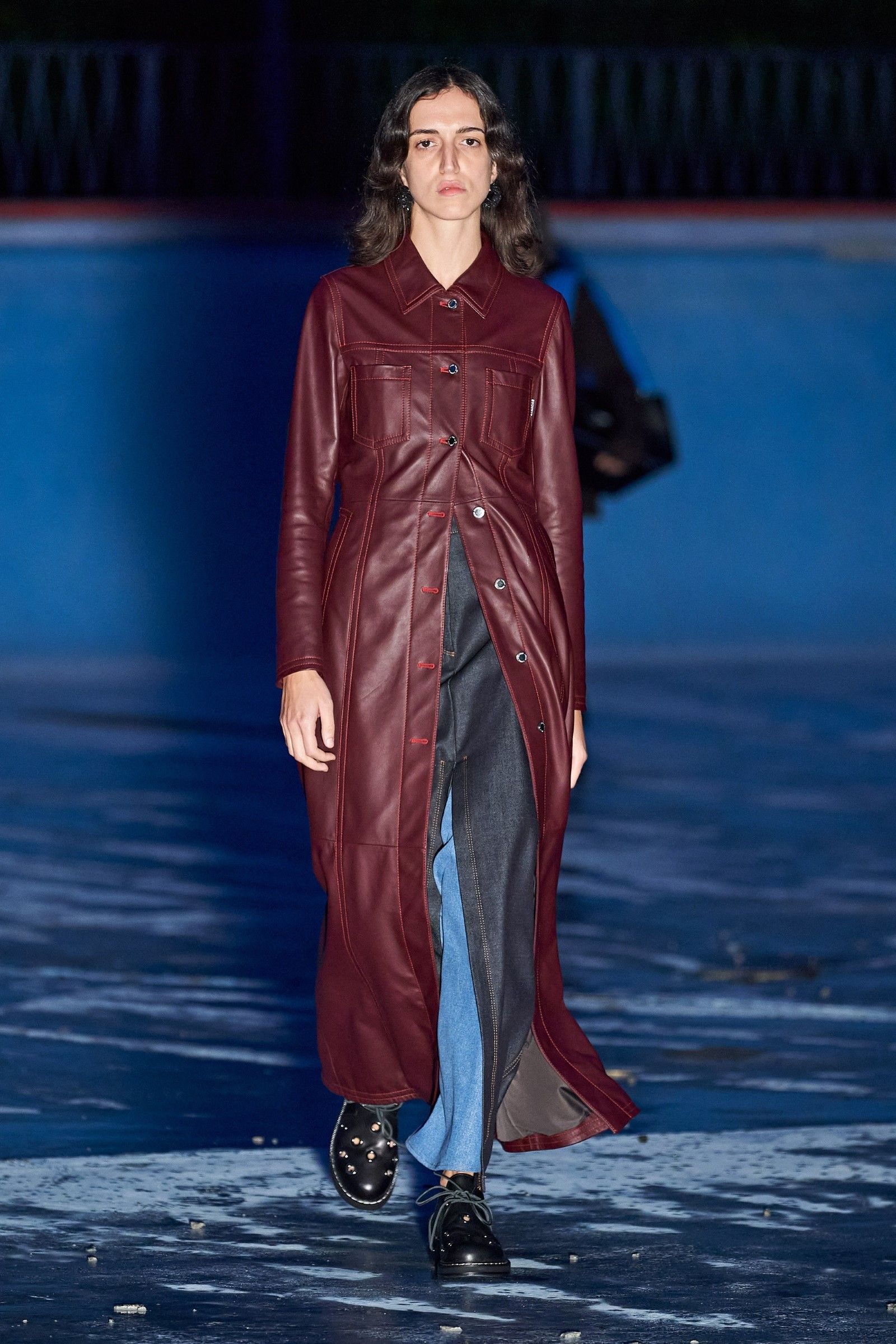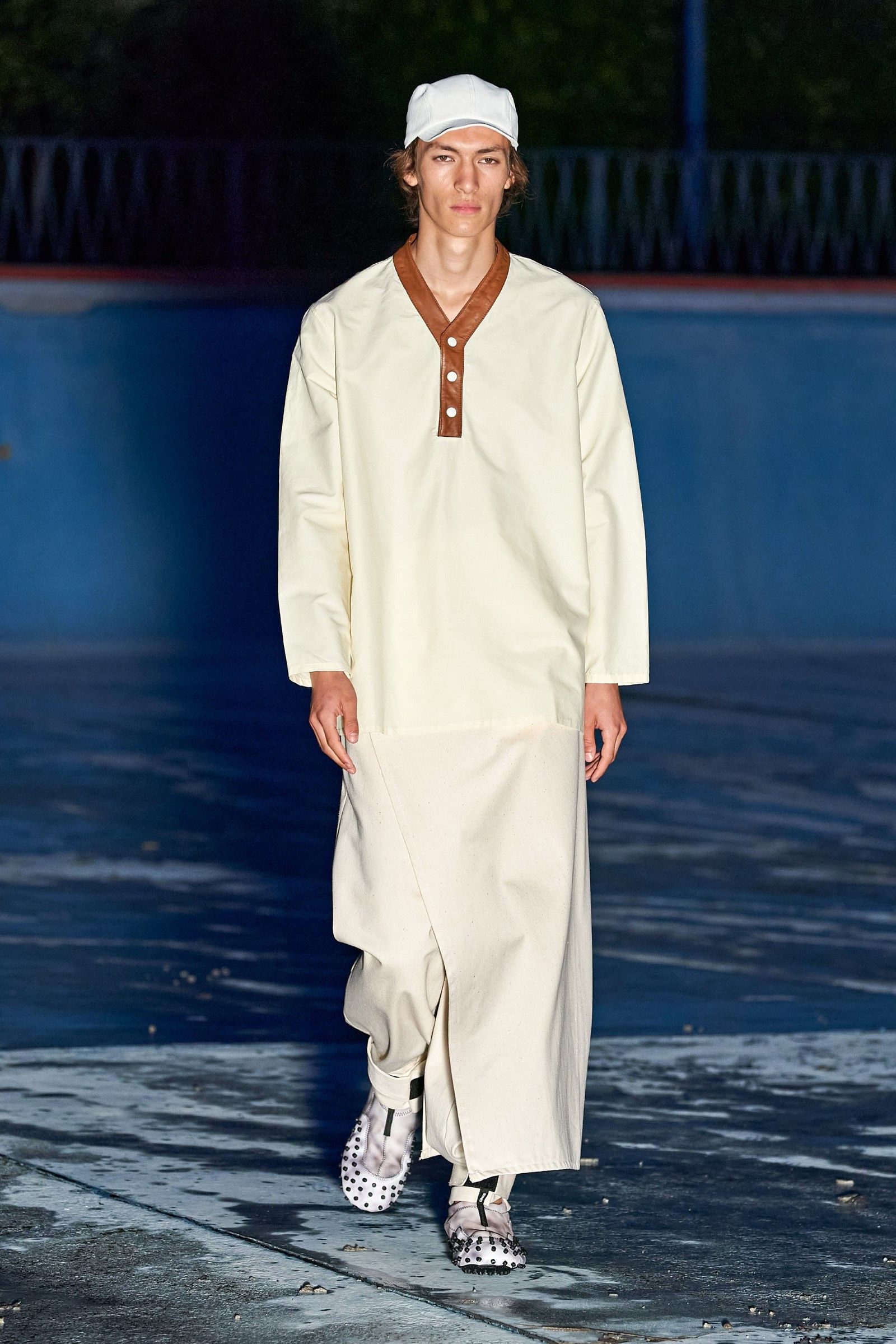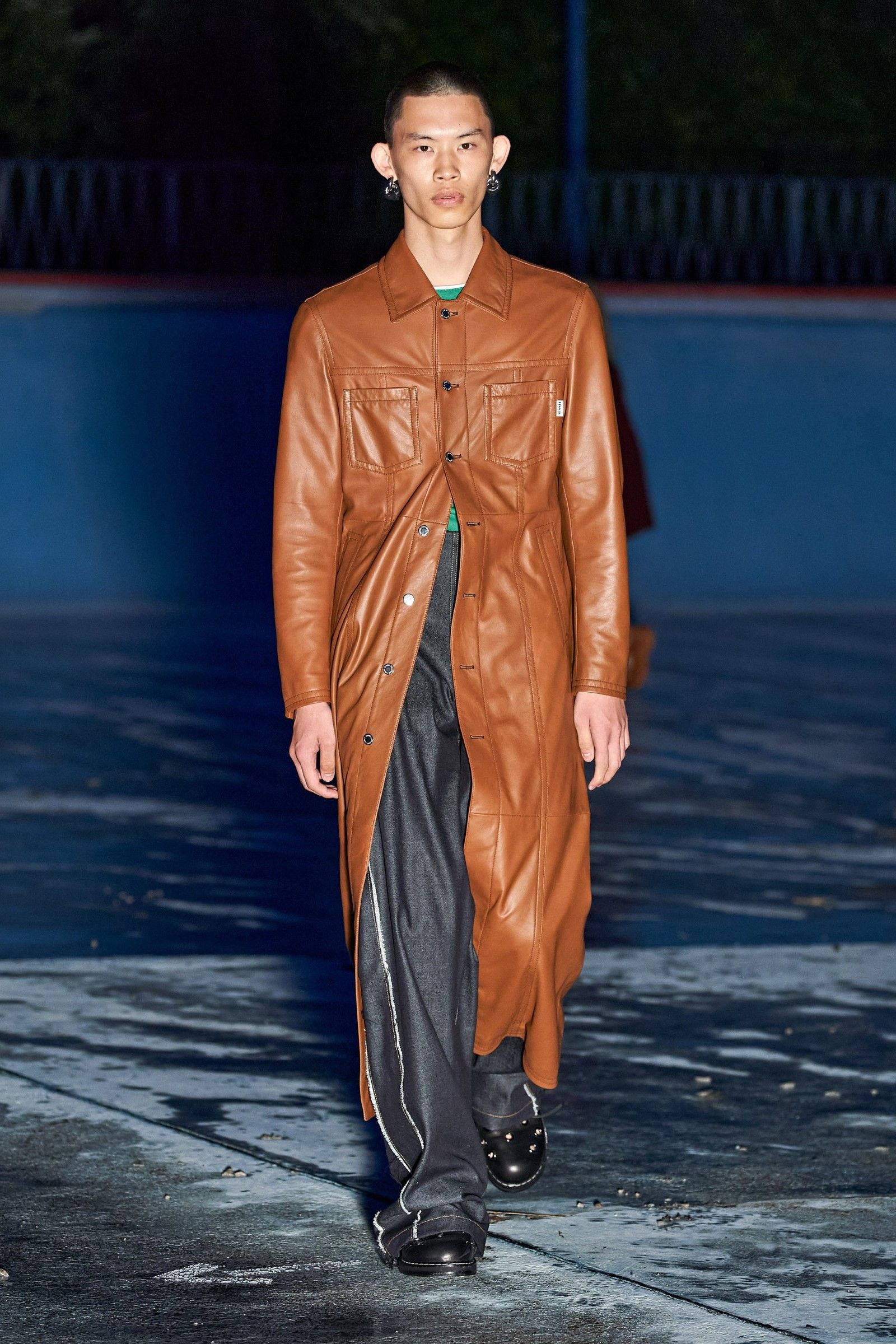 Se il womanswear della collezione, infine, appare il più strutturato e architettonico, con layering e accessori, oltre che con abiti in color blocking e cuciture che tagliano le sagome nella parte inferiore, il menswear appare invece semplificato. C’è quasi un senso di orientalismo nei top per uomo, che diventano quasi caftani e tuniche in certi casi, e nelle giacche prive di baveri, le cui linee si curvano secondo un’estetica vagamente asiatica. Non mancano ovviamente le ispirazioni sportswear rese più sofisticate dalla ricchezza dei materiali, e una serie di capispalla in pelle bordeaux che sono forse tra le proposte più interessanti della collezione.