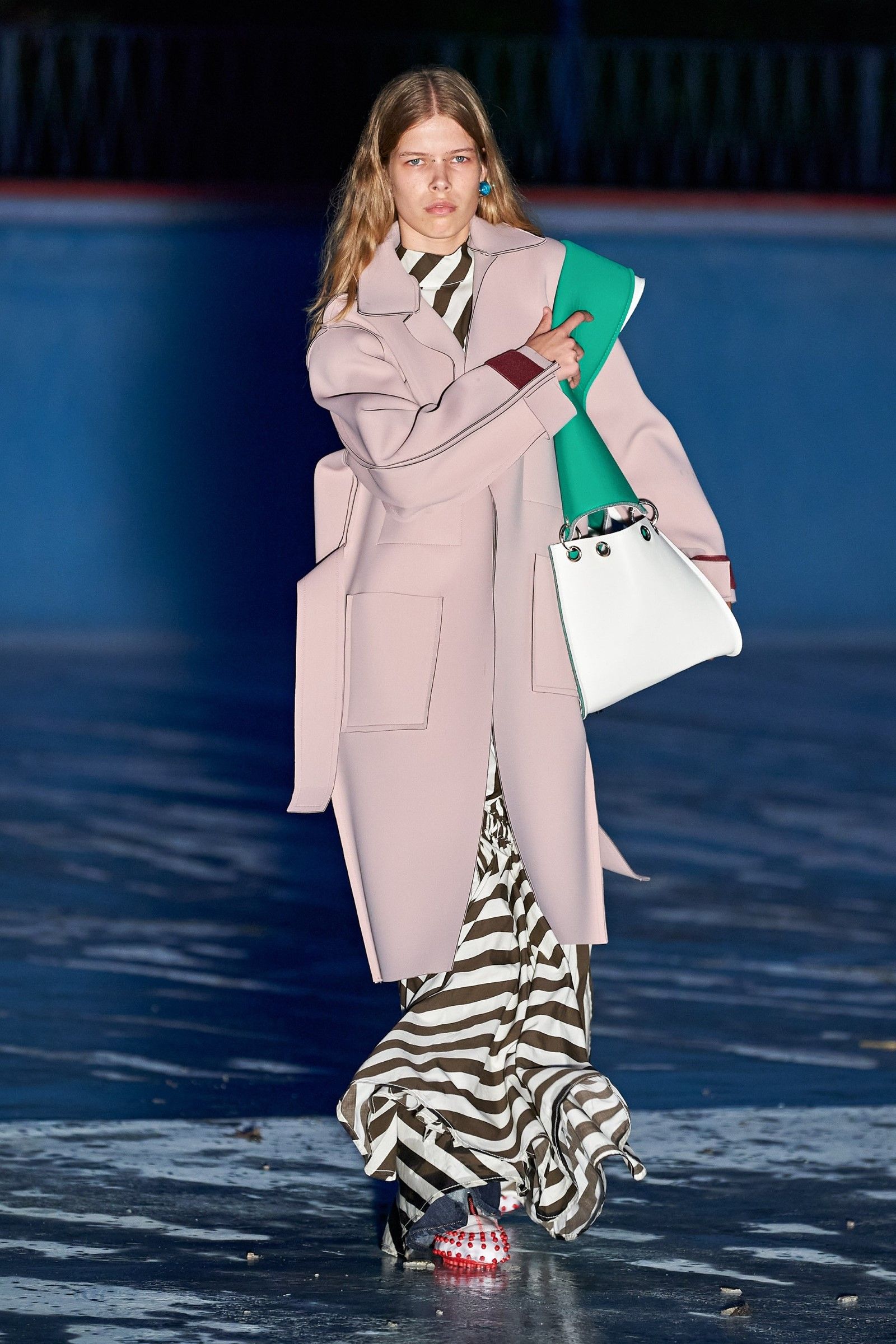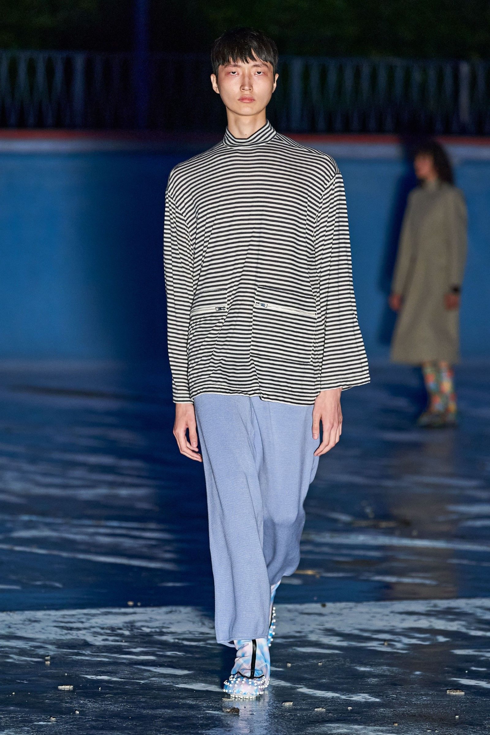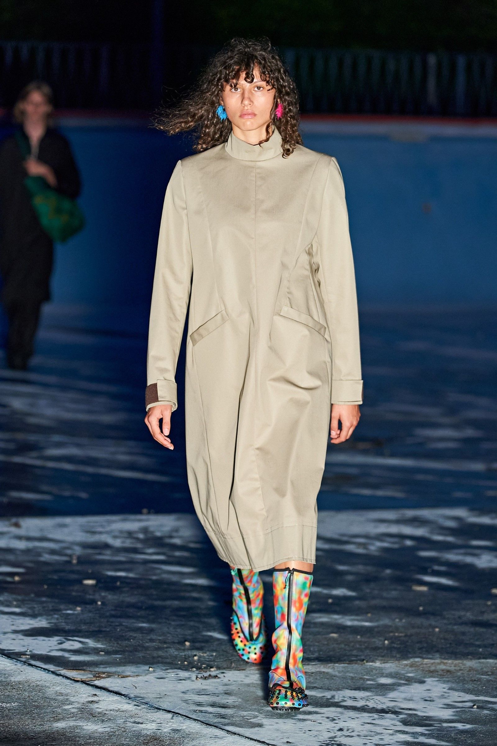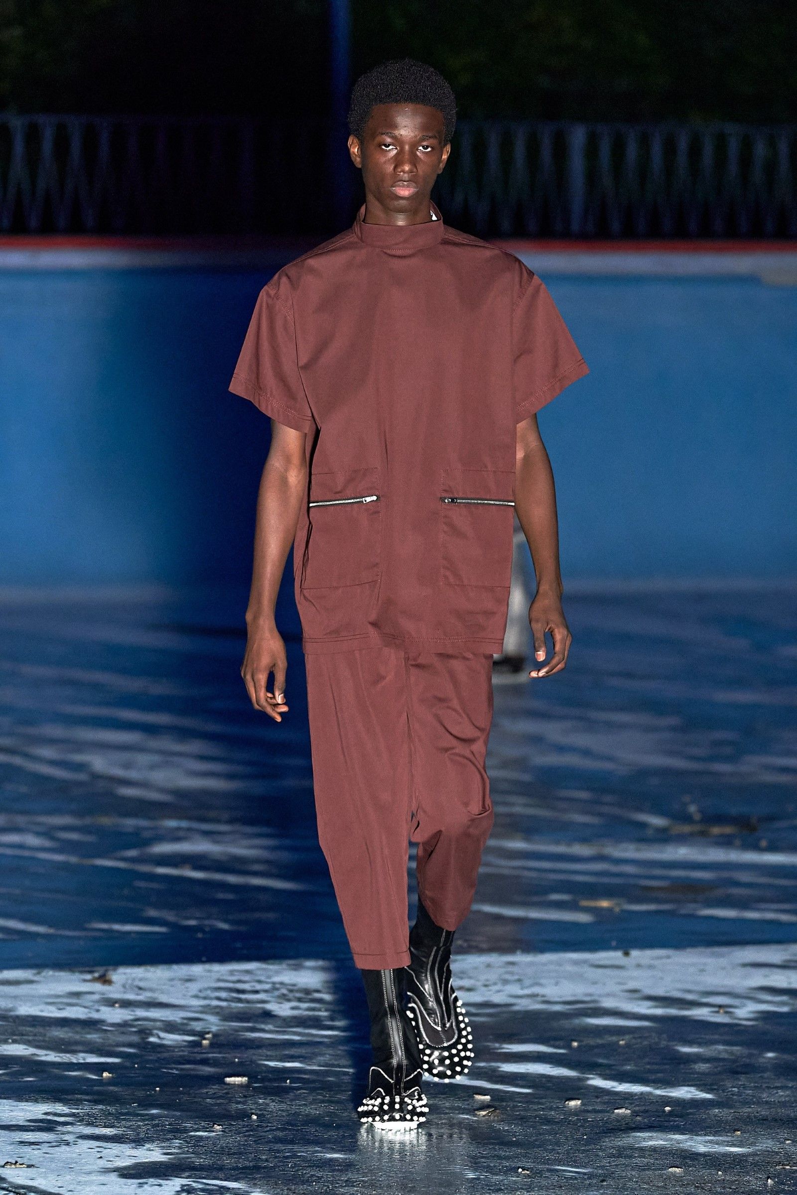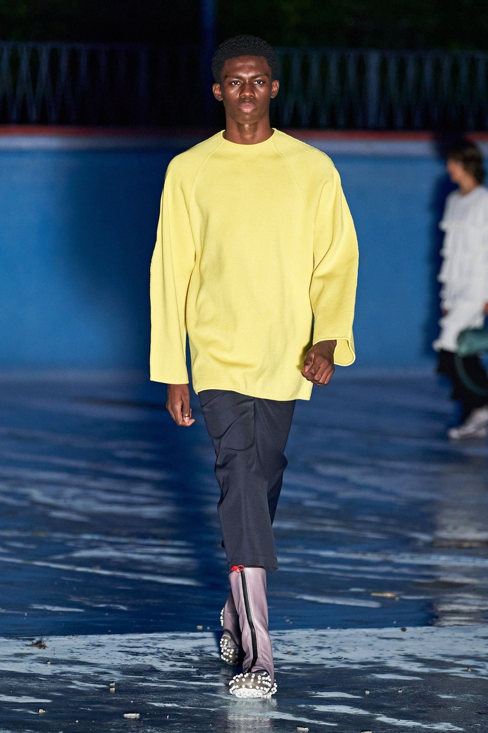 Se un solo concetto dovesse emergere dalla sfilata di ieri, sarebbe quello di linearità. A differenza delle volumetrie più elaborate viste nelle precedenti collezioni Spring-Summer, infatti, le silhouette di questa SS21 sono apparse meno rigonfie e architettoniche ma non per questo più semplici. A differenza delle torreggianti platform shoes e dalle chunky sneakers delle scorse stagioni, ad esempio, questa collezione ha presentato un nuovo tipo di footwear – una sorta di stivale zip-up sintetico con una suola chiodata. Lo stivale avrebbe lo stesso mood gorpcore-apocalittico dei React Boot disegnati da Jun Takahashi per Nike se non fosse per i colori e i materiali leggeri – che lo rendono invece piacevolmente stravagante, per non dire alieno, e rappresentano un lavoro di design molto più avanzato di quello che abbiamo visto finora dal brand.