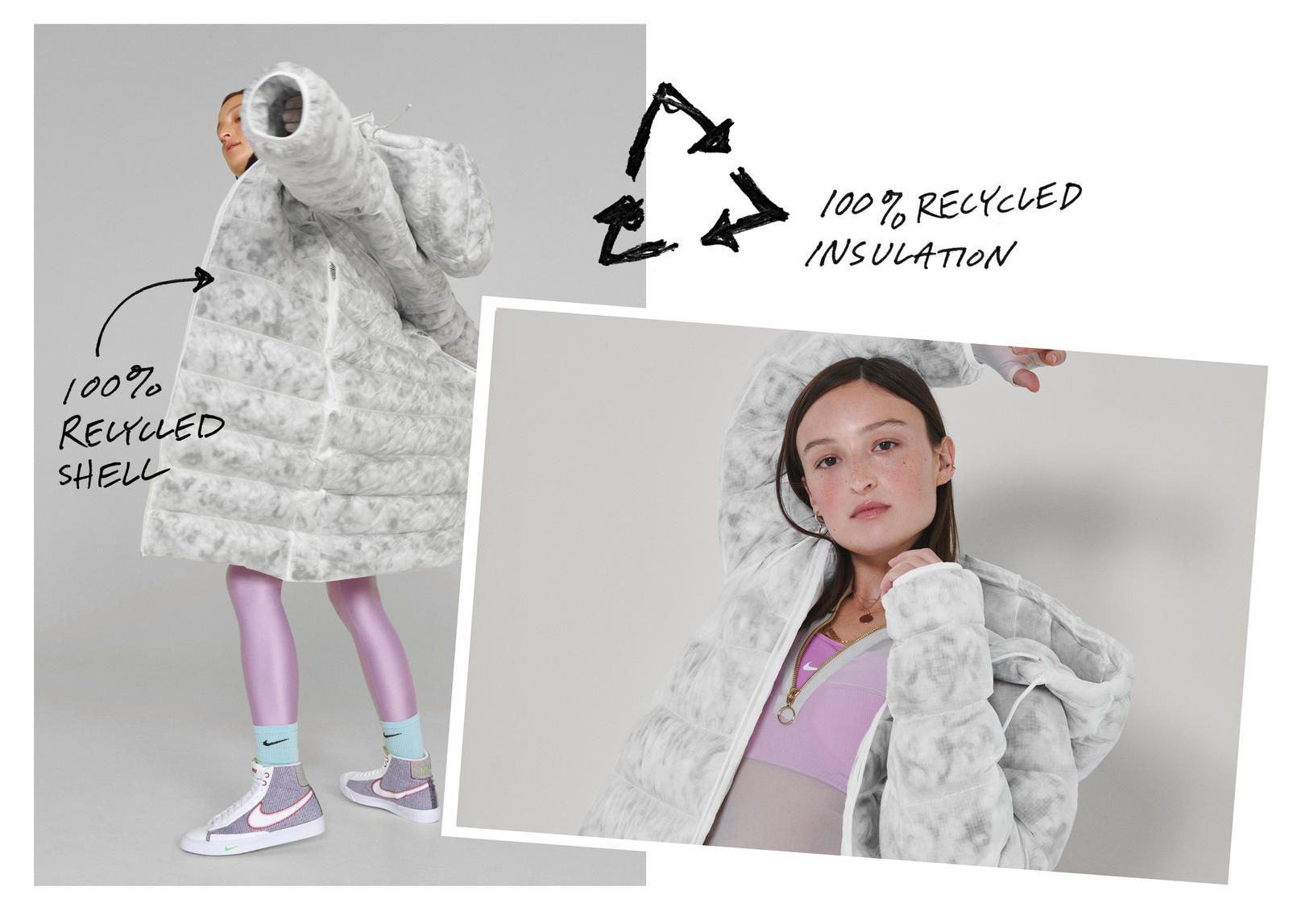 In autunno sarà poi il turno della Sportswear Marble Ecodown Jacket, la giacca Nike realizzata in poliestere riciclato il cui motivo richiama l'eleganza del marmo bianco. Basata sul concetto di circolarità, la giacca garantisce isolamento termico senza però rinunciare alla sostenibilità dei materiali.
