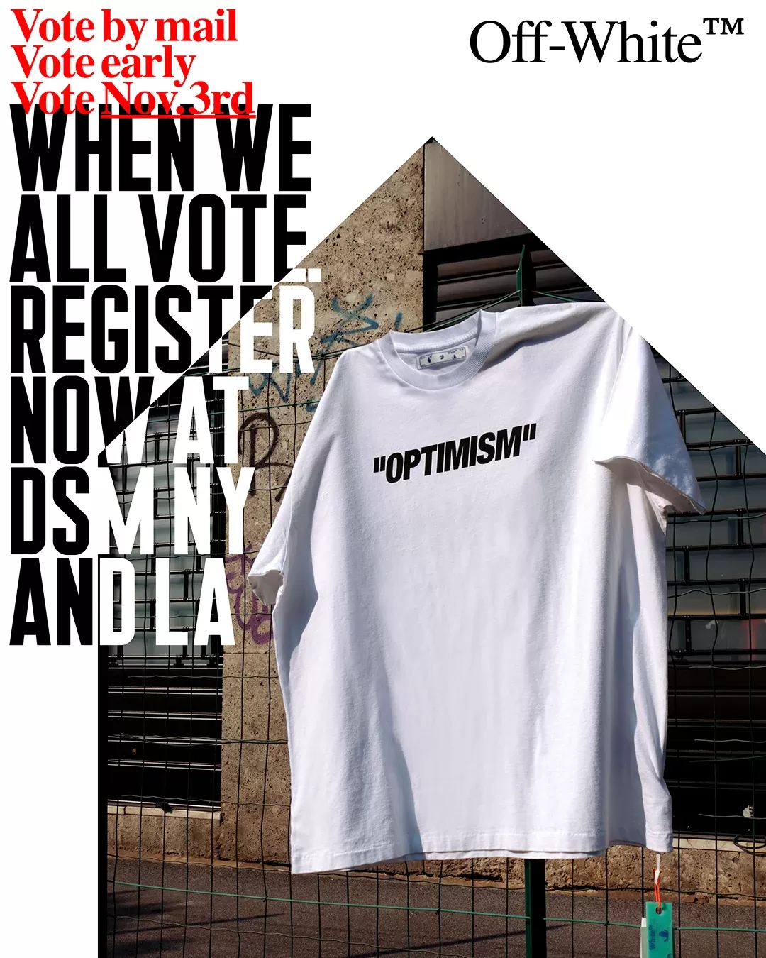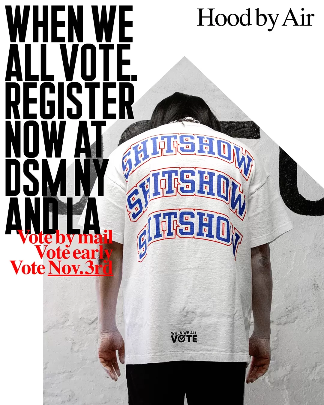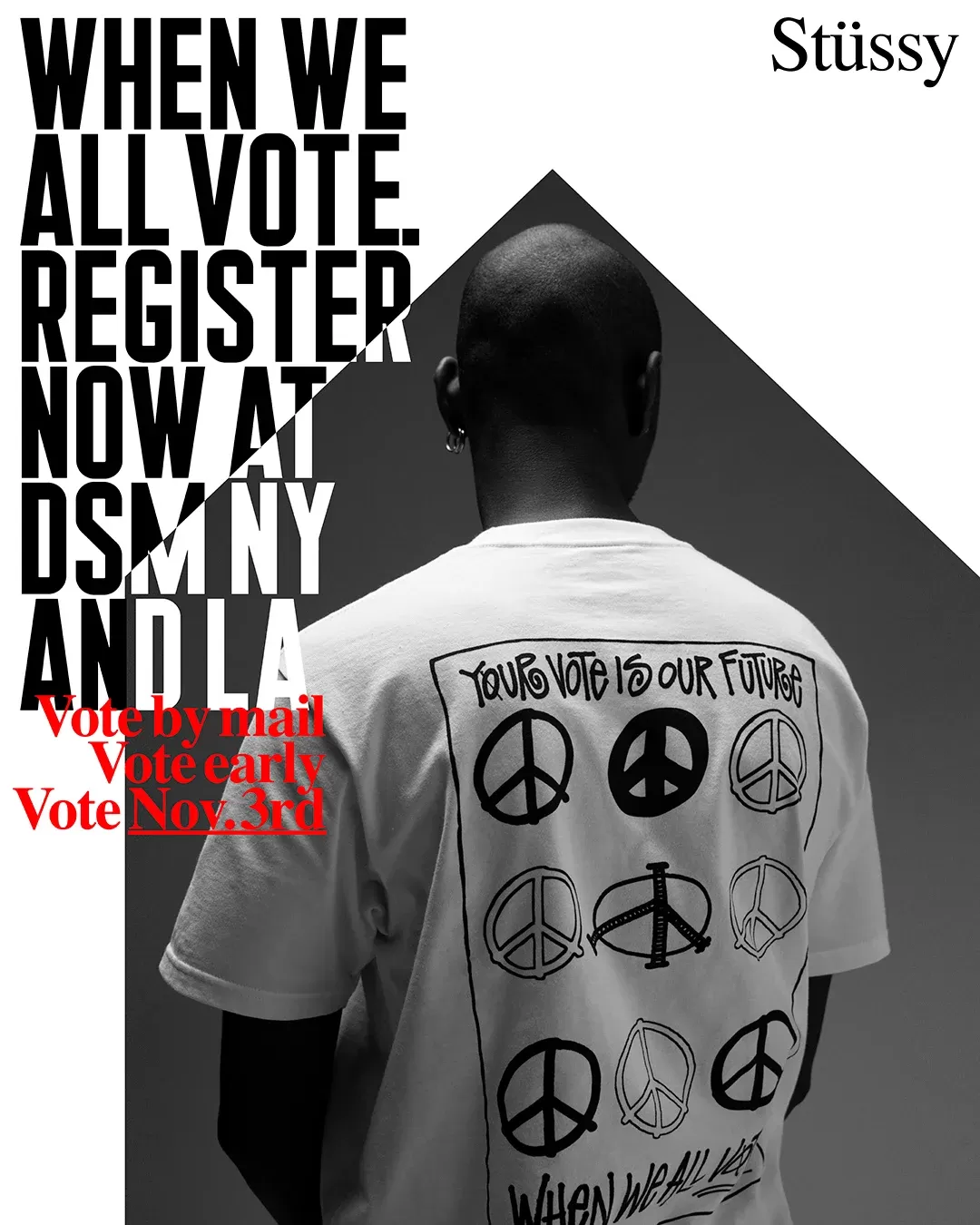 La voglia di dare piena consapevolezza del potere di voto al cittadino si è trasformata in un fenomeno che ha coinvolto tante realtà come Dover Street Market, Foot Locker, Micheal Kors, Kenneth Cole, Gap e Patagonia su tutti. Quest’ultimo ha sviluppato un tag sui propri denim che recita “Vote the asshole out” per rimarcare l’importanza di dover eleggere “climate leaders”. Necessità rimarcata anche dal creatore di No Vacancy Inn e Denim Tears, Tremaine Emory, con il suo continuo lavoro sulle ingiustizie sociali. Nel 2017 ad esempio, in seguito alla morte di sua madre, ha rilasciato magliette a beneficio di Every Mother Counts, un'organizzazione dedicata a fornire assistenza sanitaria alle madri di tutto il mondo.