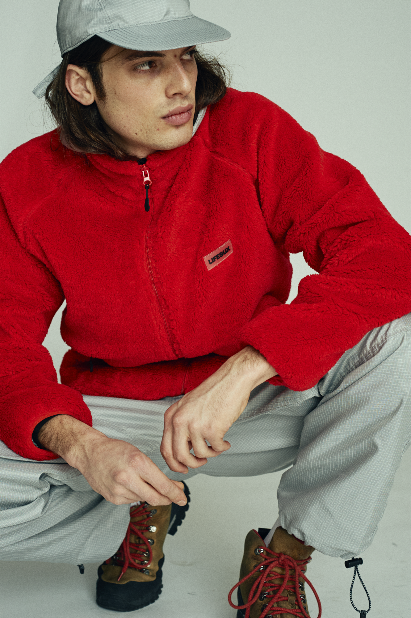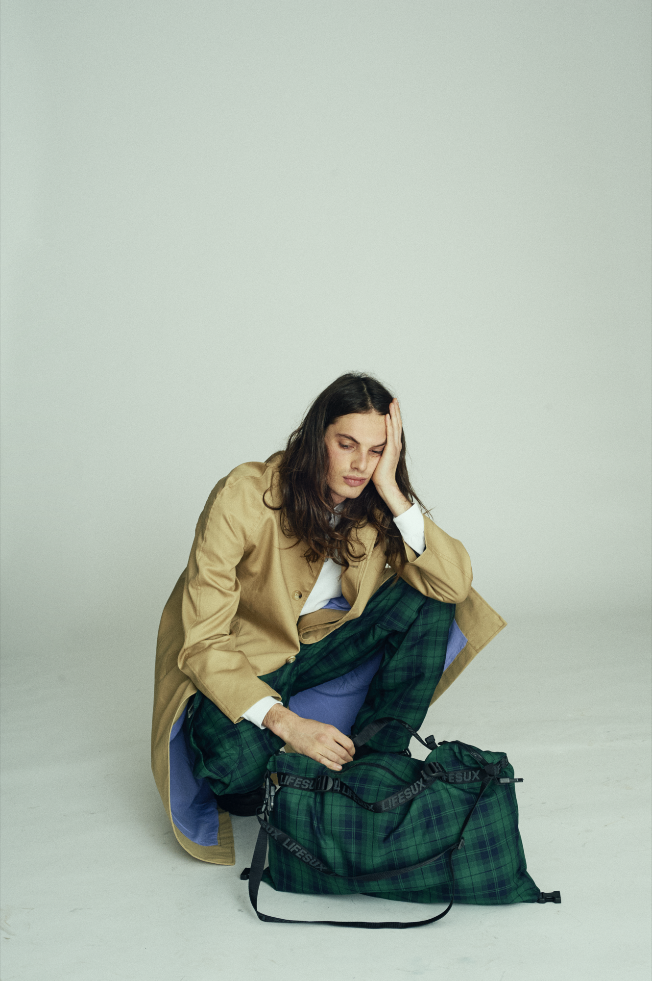 Per la prima volta, ad esempio, LIFESUX ha introdotto il denim, rendendolo più vicino al proprio gusto grazie ad un lavaggio bleach sui toni del viola. Tra i capi meglio riusciti spicca sicuramente l'outerwear, con una puffer jacket realizzata in sacco piuma Made in Italy, come tutta la collezione. Per la realizzazione del trench, invece, il brand ha collaborato con l'azienda Millerain. LIFESUX ha inoltre utilizzato materiali riciclati come la New Life fiber sui capi tartan, mentre i maglioni sono tutti in mohair.