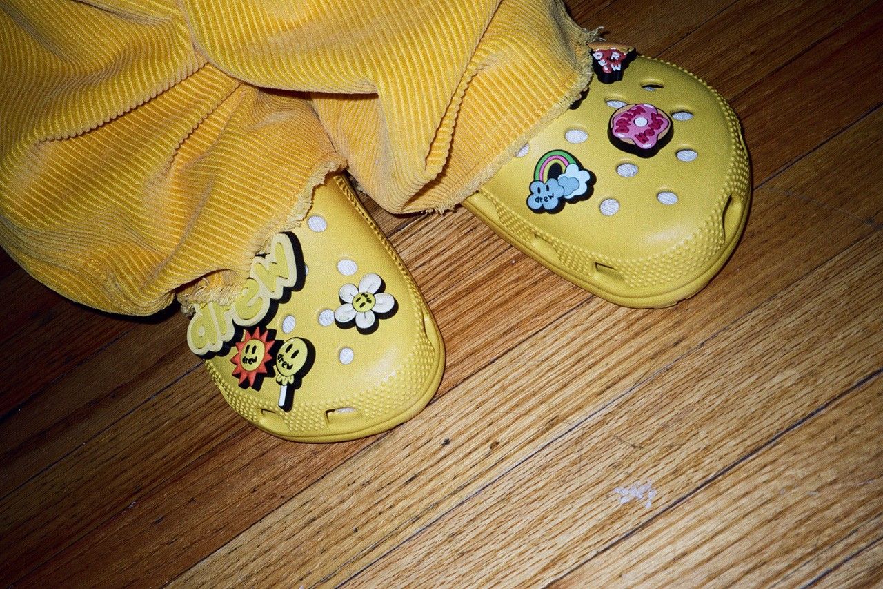 UPDATE 08/10/2010: Dopo il teaser della scorsa settimana, le immagini ufficiali della nuova collaborazione Justin Bieber x Crocs sono state presentate al pubblico. Ispirate ai colori della label fondata dal cantante, Drew House, il nuovo modello di Crocs presenta una colorway giallo zafferano ed è decorata da applique che, oltre al logo di Drew House, rappresentano un arcobaleno, un sole e dei fiori.