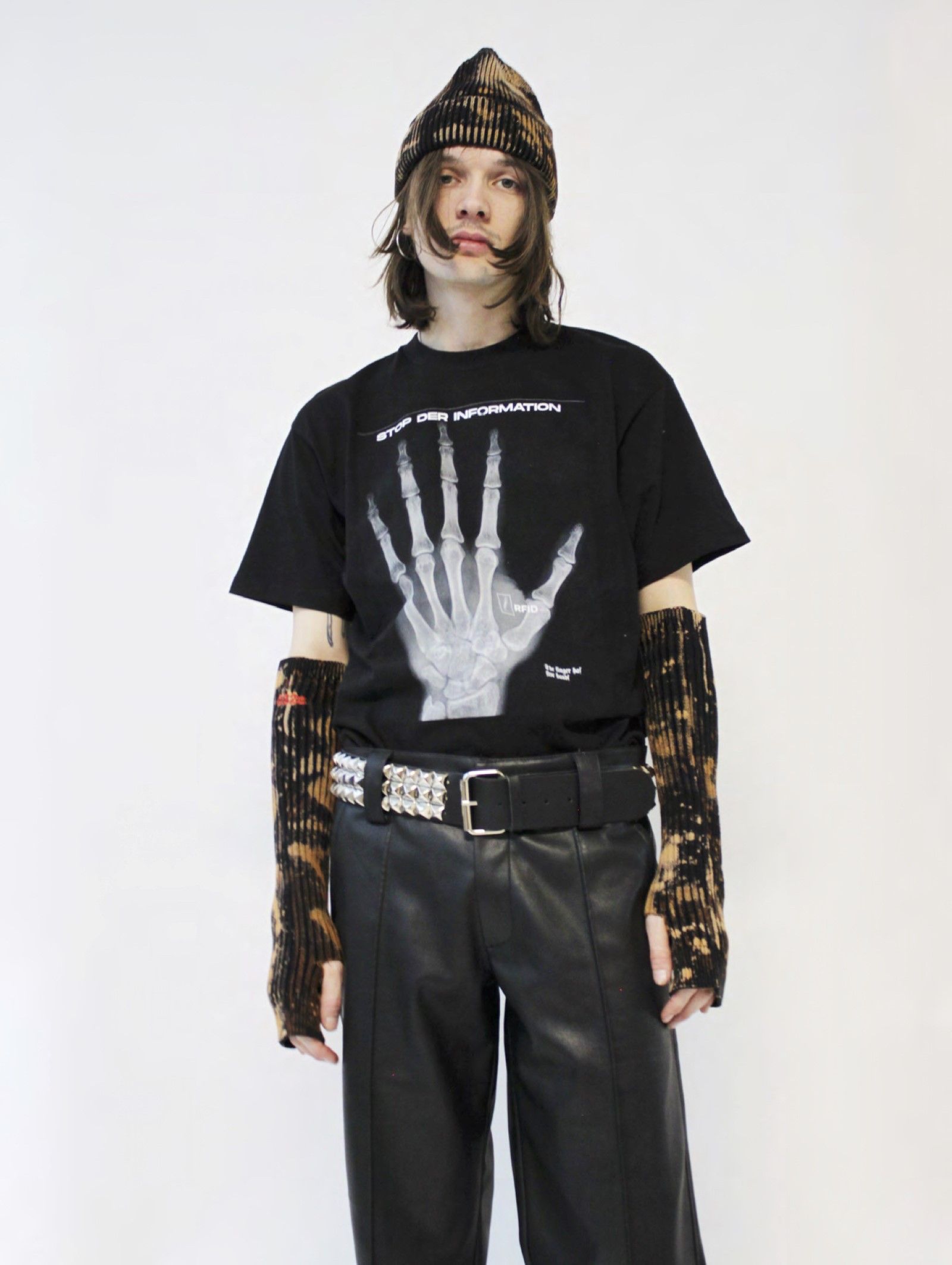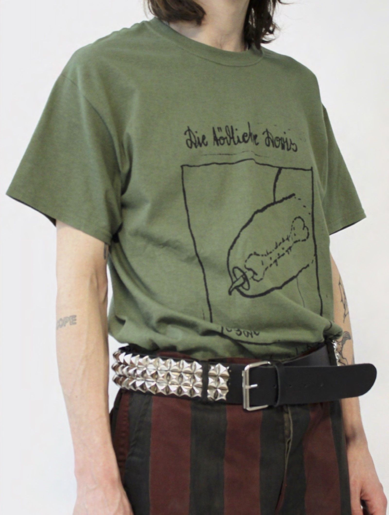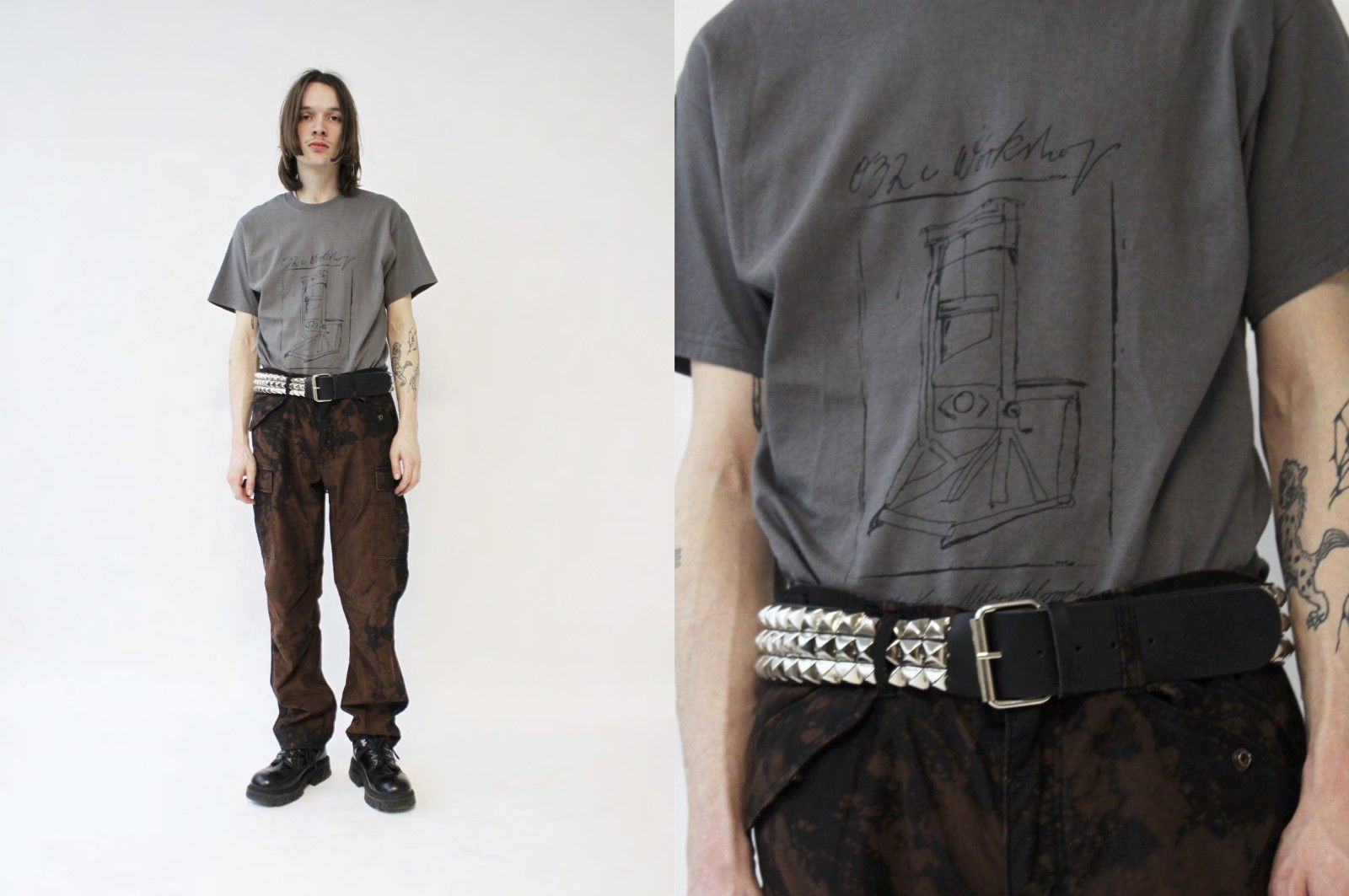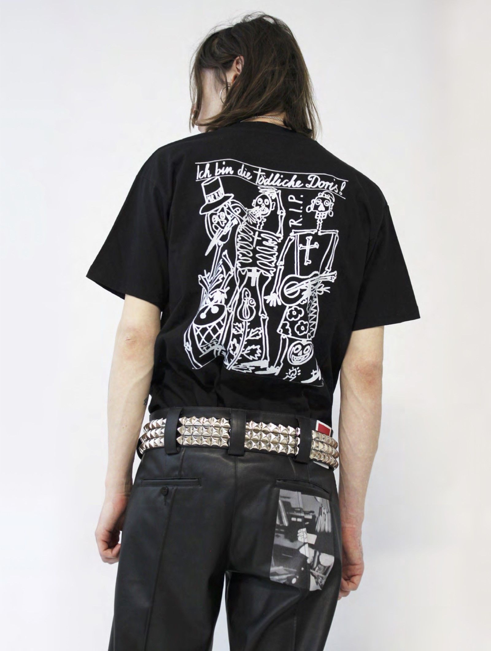 Per disegnare la collezione, la creative director di 032c, Maria Koch, ha collaborato con Wolfgang Müller, il fondatore del collettivo. Il risultato è una collezione dalla forte anima punk i cui capi riportano immagini, testi e motivi degli archivi di Die Tödliche Doris, riprodotti e ricombinati con nuovi materiali. Al di là dei capi più apertamente grafici, sono notevoli le felpe ricamate di teschi, i pantaloni sia in tie-dye che in simil-pelle con una fotografia stampata sulla tasca posteriore e la pesante cintura incrostata di metallo che appare su quasi tutti i look – forse il richiamo più vicino all’estetica aggressiva della Berlino underground di quegli anni.