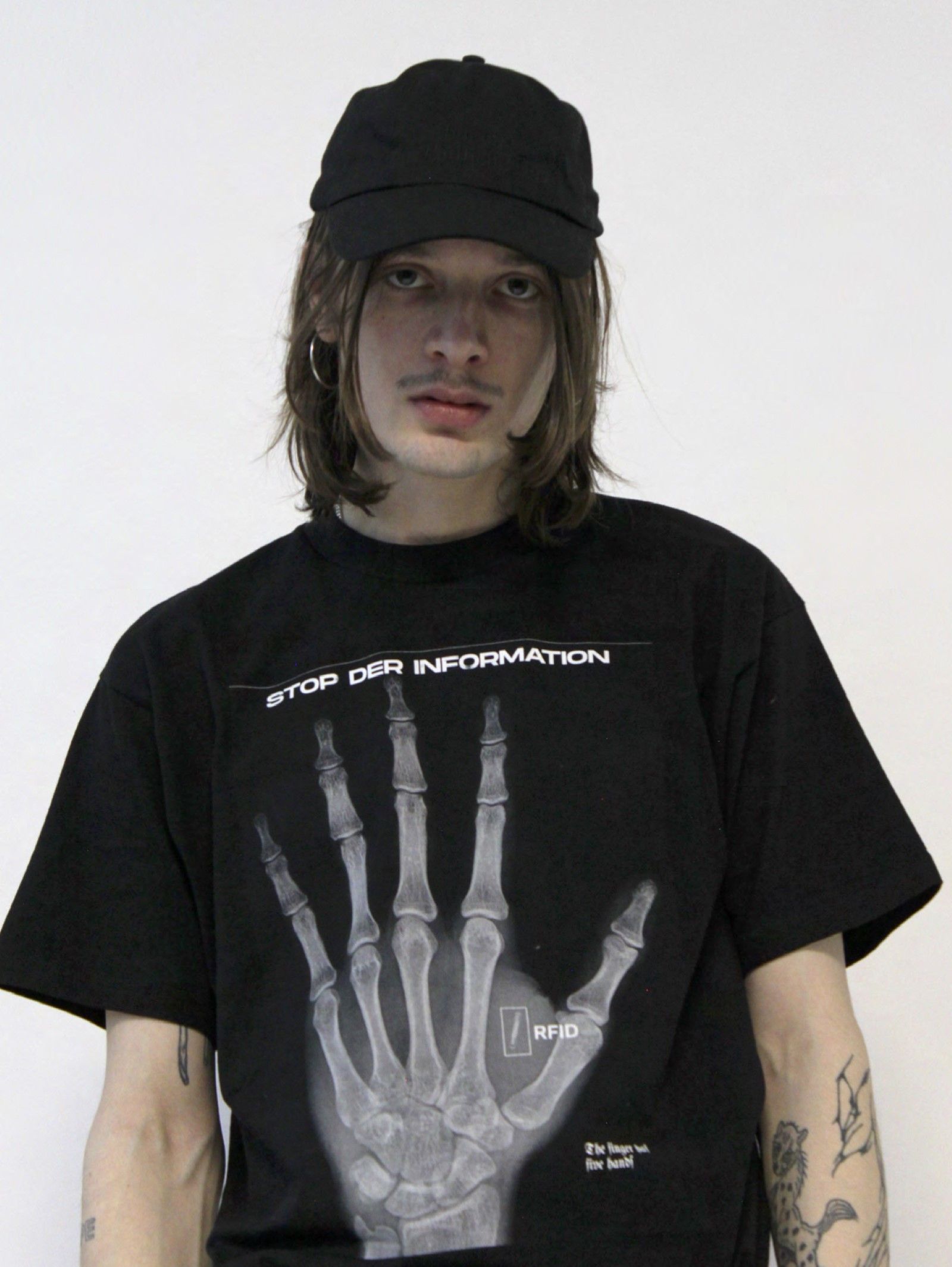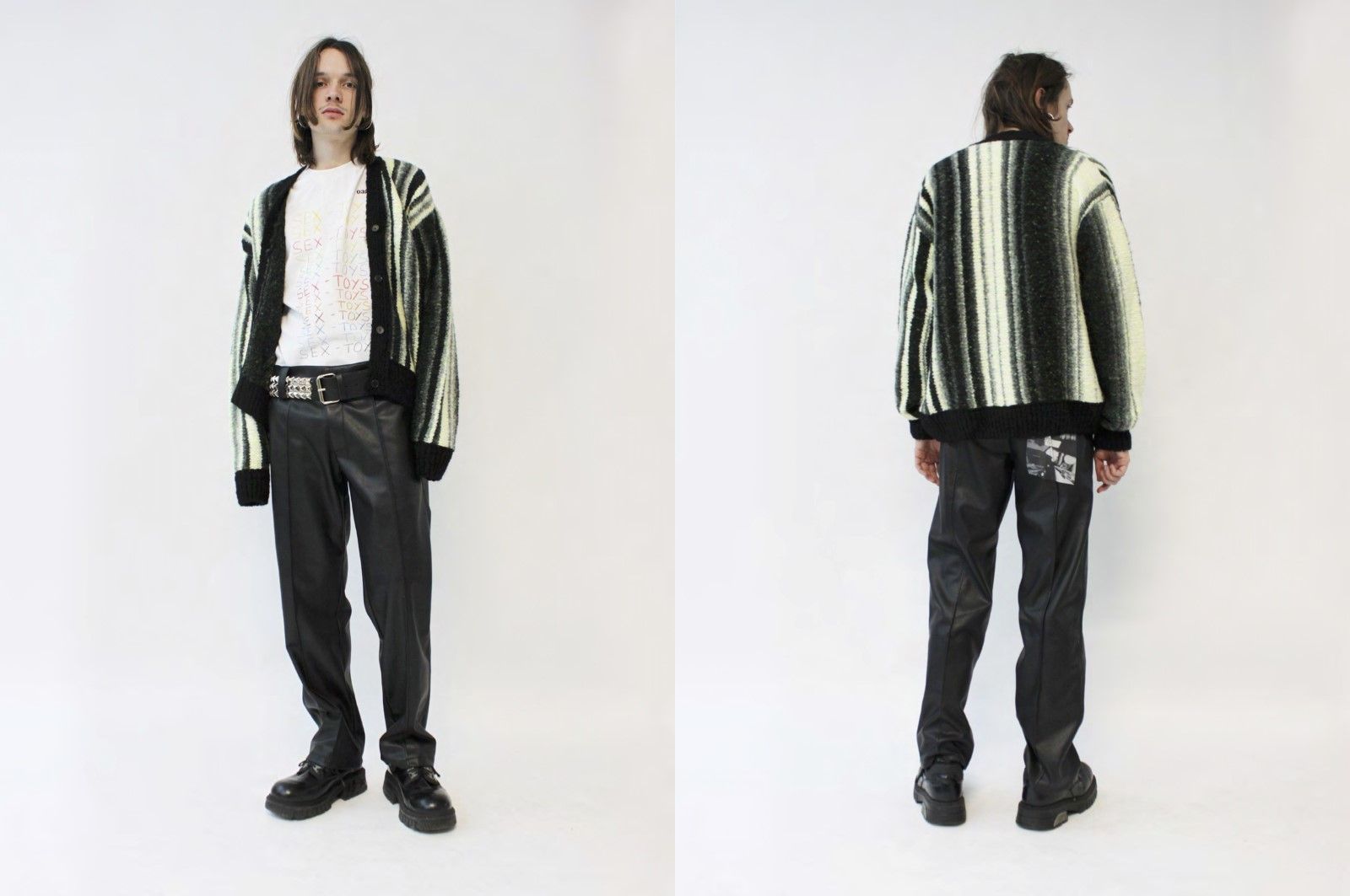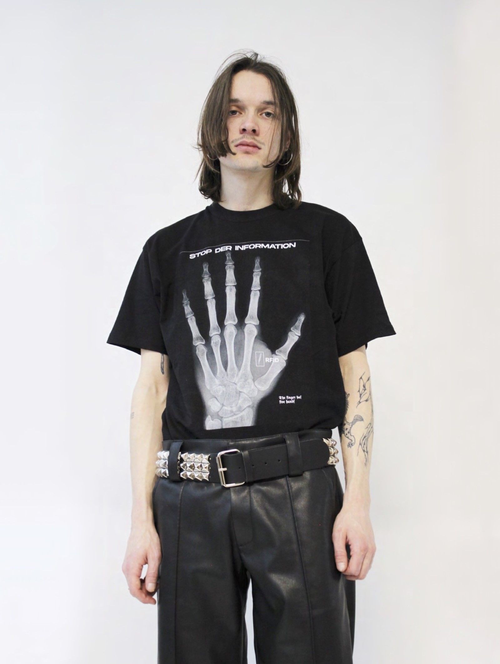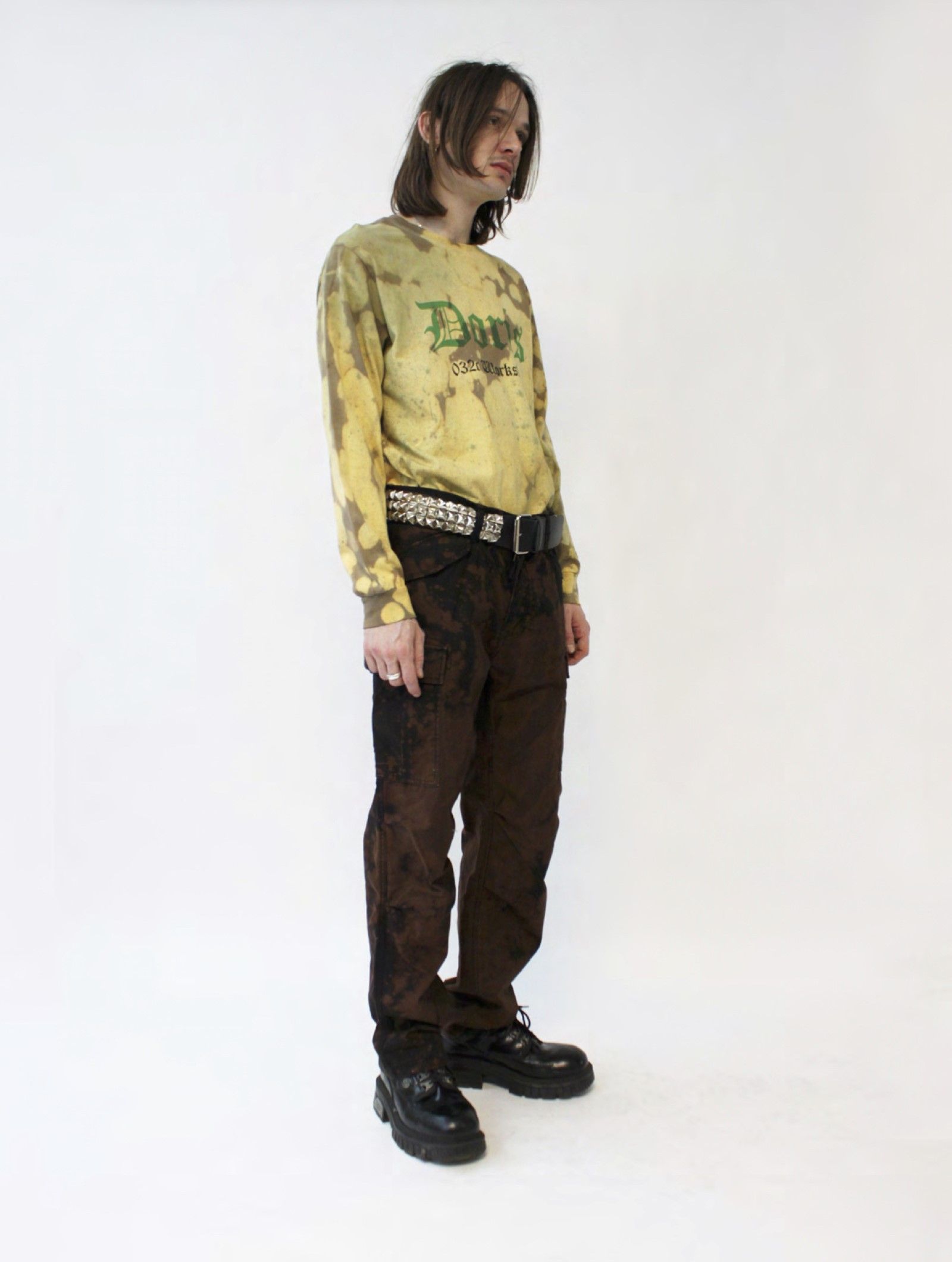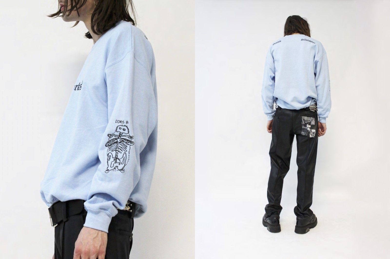 Per disegnare la collezione, la creative director di 032c, Maria Koch, ha collaborato con Wolfgang Müller, il fondatore del collettivo. Il risultato è una collezione dalla forte anima punk i cui capi riportano immagini, testi e motivi degli archivi di Die Tödliche Doris, riprodotti e ricombinati con nuovi materiali. Al di là dei capi più apertamente grafici, sono notevoli le felpe ricamate di teschi, i pantaloni sia in tie-dye che in simil-pelle con una fotografia stampata sulla tasca posteriore e la pesante cintura incrostata di metallo che appare su quasi tutti i look – forse il richiamo più vicino all’estetica aggressiva della Berlino underground di quegli anni.