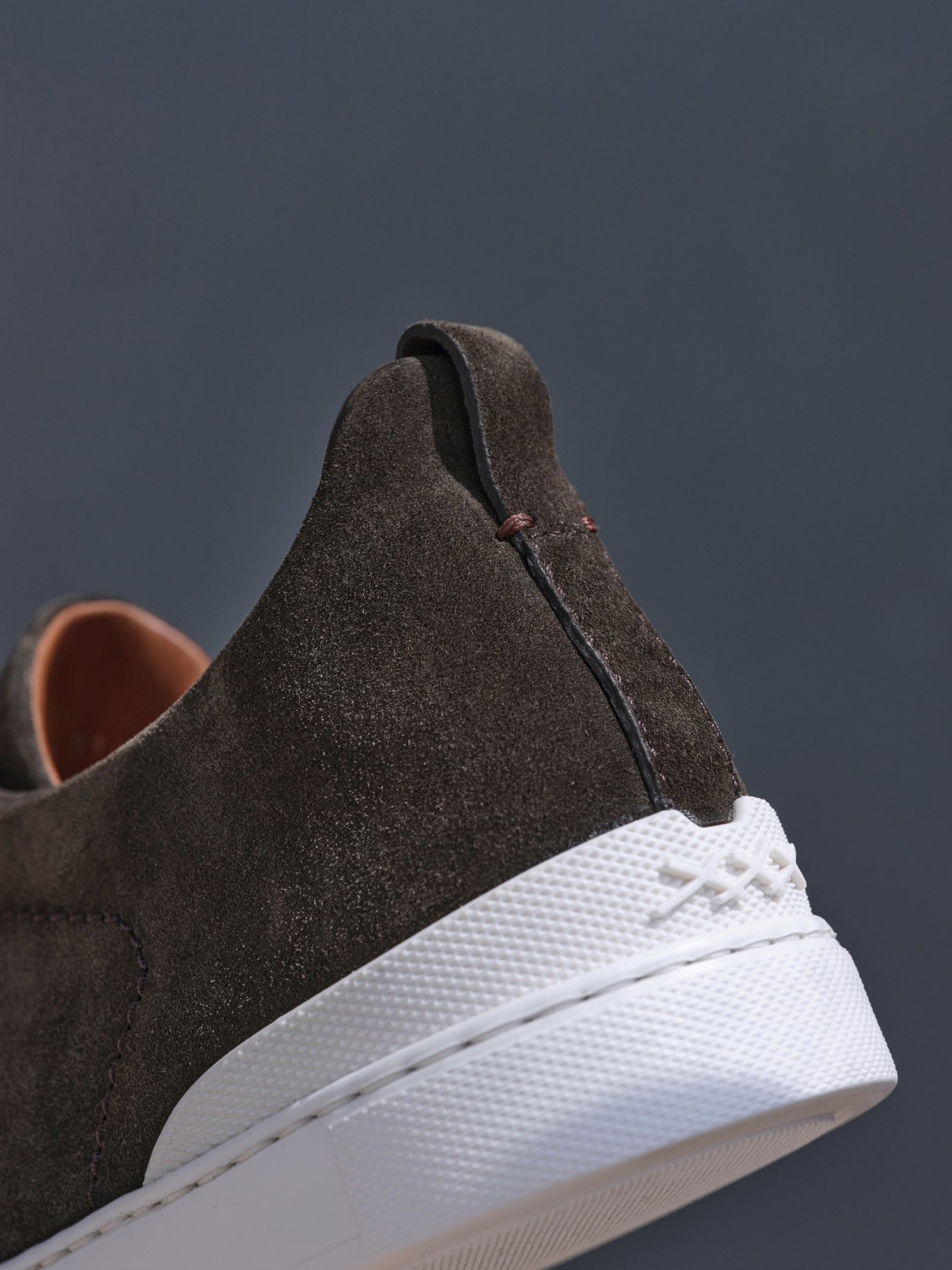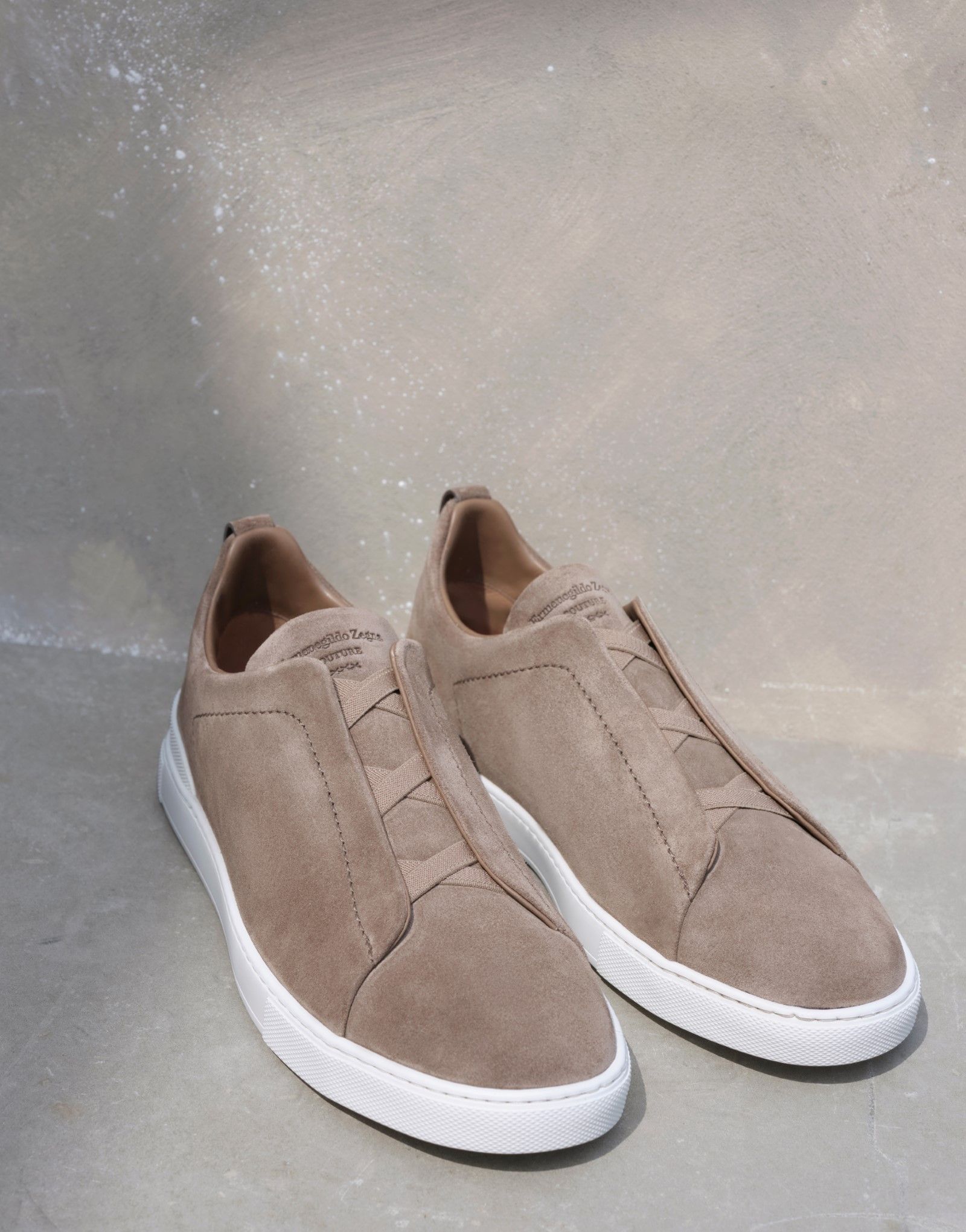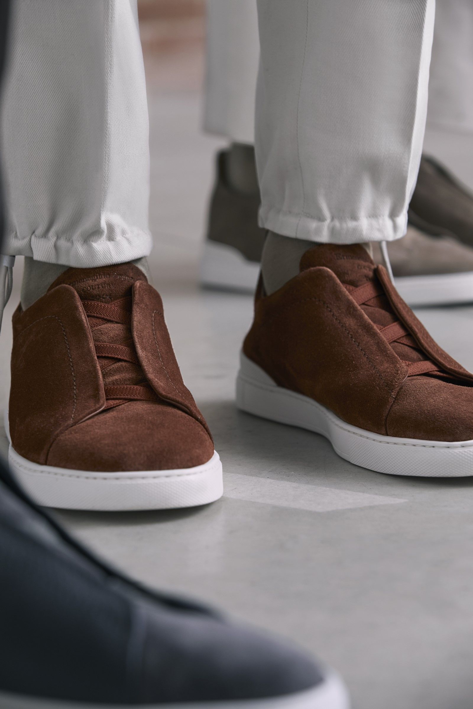 Per l’ultima collezione di Ermenegildo Zegna, la silhouette della Triple Stitch è stata riprogettata con una nuova costruzione più flessibile e una suola in gomma ultraleggera. Quelli che sembrano lacci sono invece elastici, e infatti la scarpa può essere indossata con la comodità di una slip-on sebbene sia chiusa. Per questa stagione, inoltre, la sneaker verrà presentata in una nuova palette di colori autunnali.