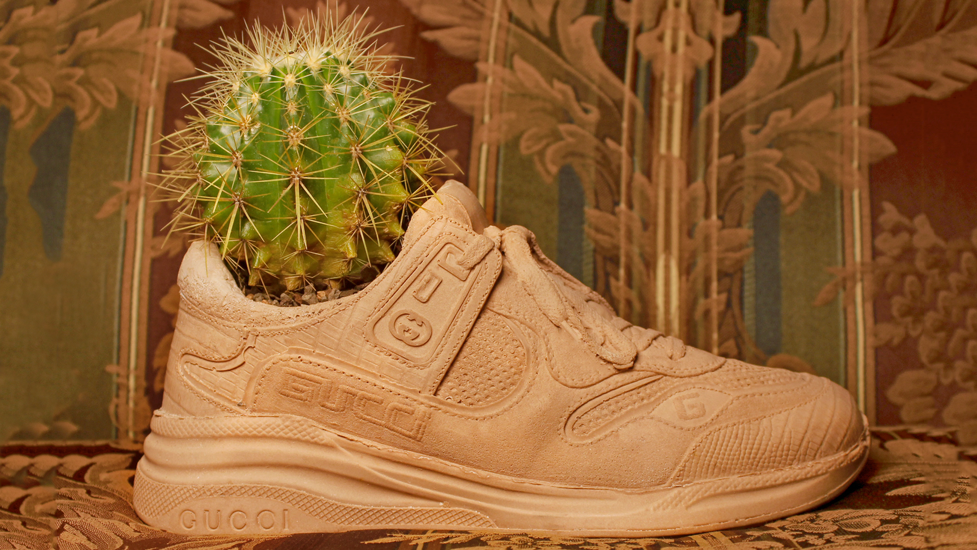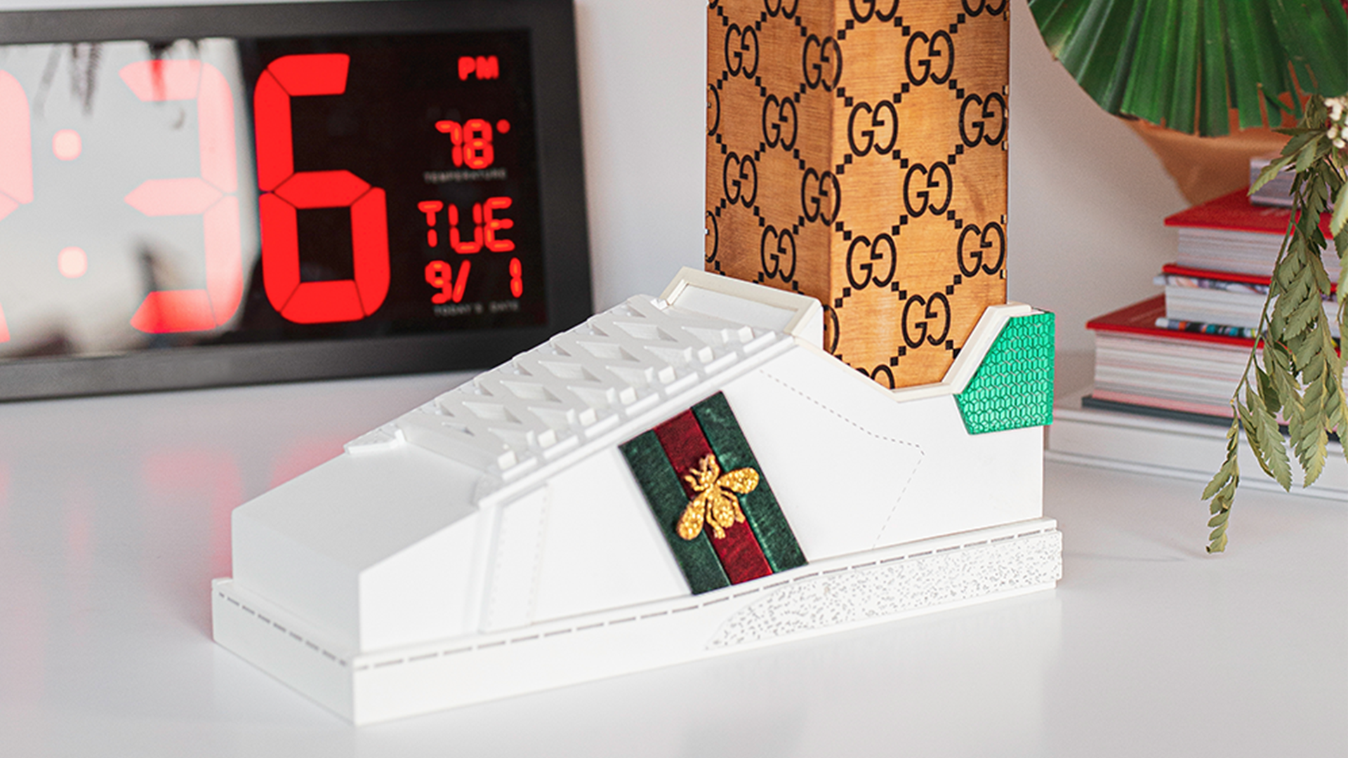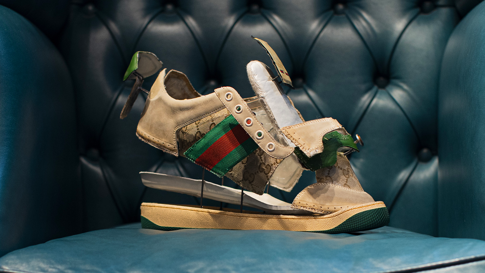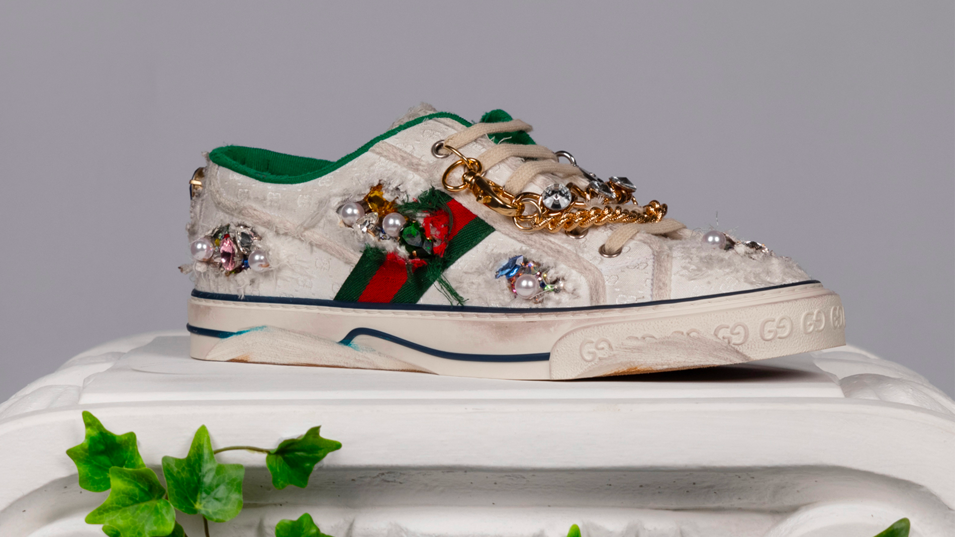Per l’occasione, inoltre, Gucci ha contattato il suo network di creativi e artisti che hanno creato una propria personale versione delle più celebri silhouette del brand, declinandola in base alla propria disciplina artistica. Così il plant design studio di New York Bodega Rose ha creato un vaso a forma di Ultrapace R, l’artista Christopher Chan ha trasformato la Ace in una delle sue sculture squadrate e il designer Mattias Gollins ha tempestato il modello Tennis 1977 di perle e gemme. Ma la lista continua e include nomi come l’artista tessile Delphine Denereaz, l’illustratore Ghica Popa, la sneaker artist Helen Kirkum e molti altri.