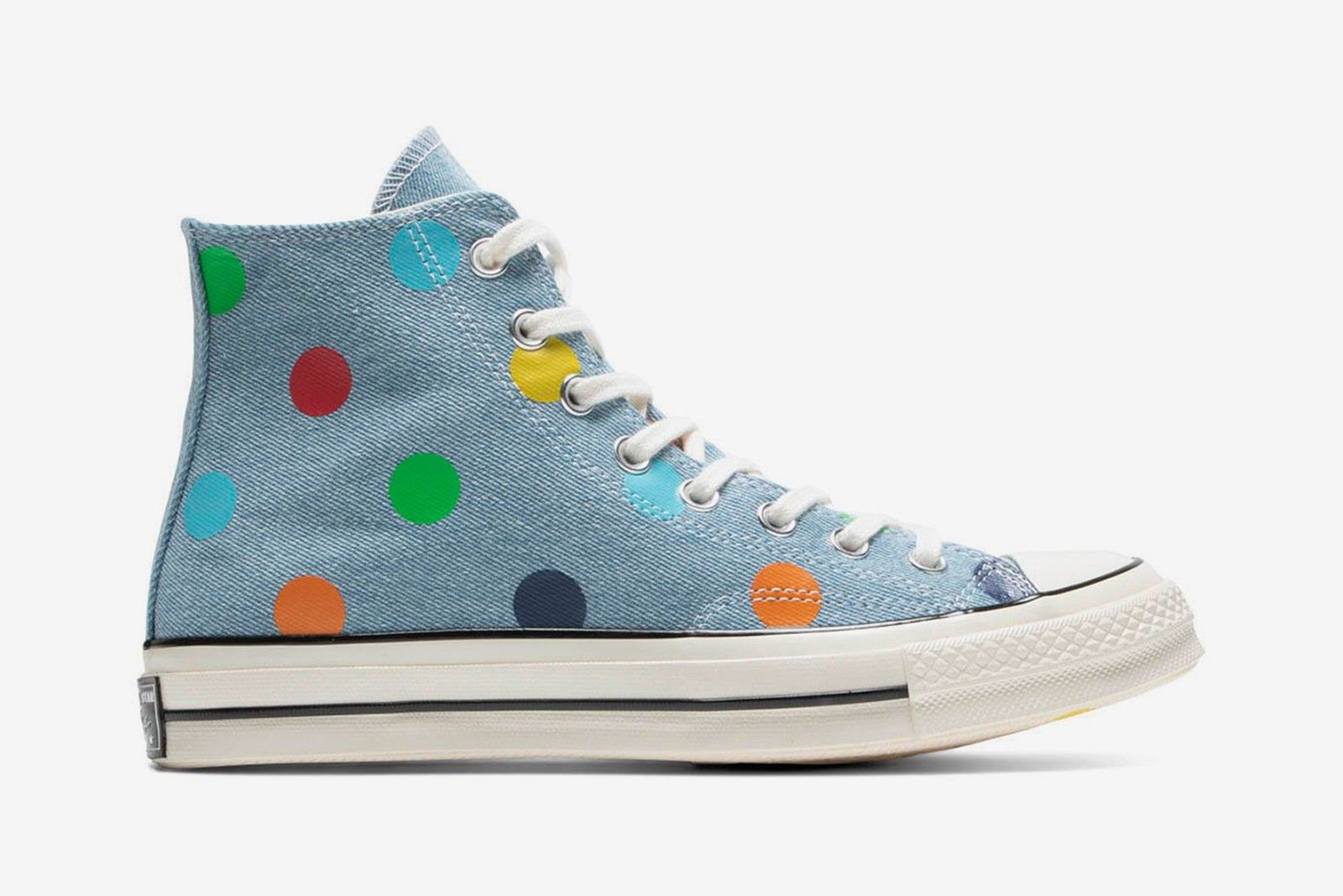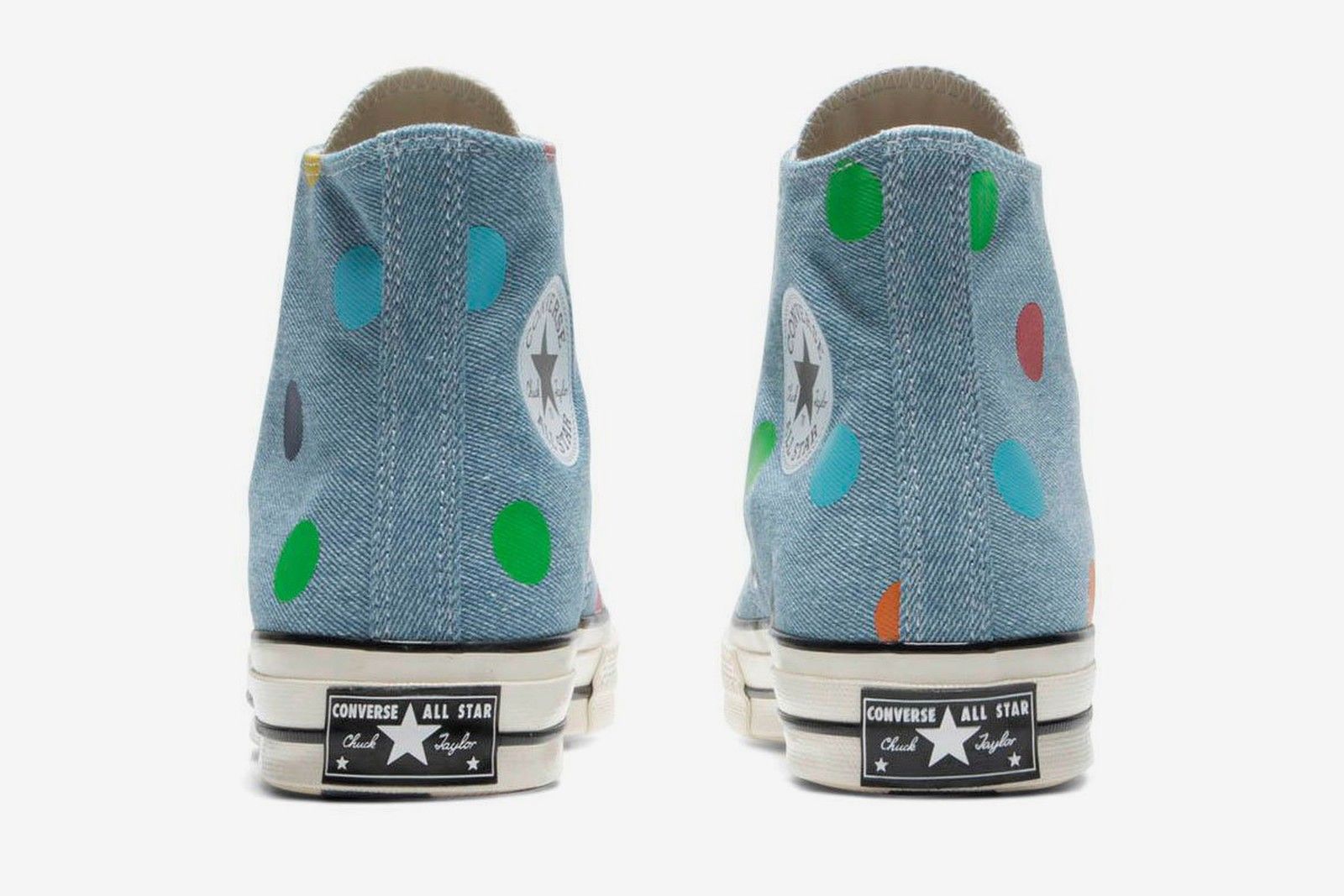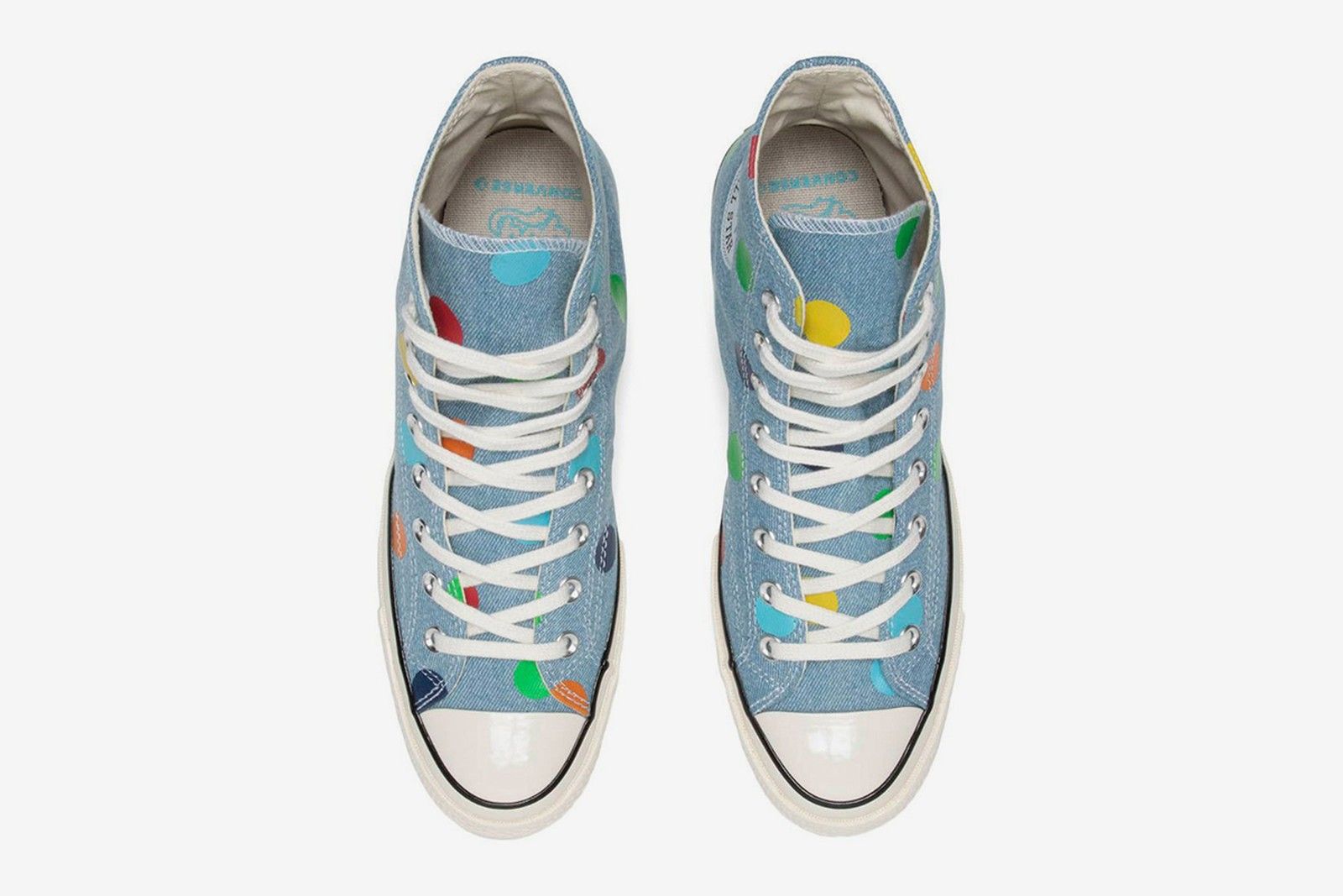 La tomaia delle sneaker è composta di tessuto denim mentre i pois arancioni, gialli, verdi, rossi e azzurri non solo ricoprono quest’ultima ma si estendono fino alla suola.