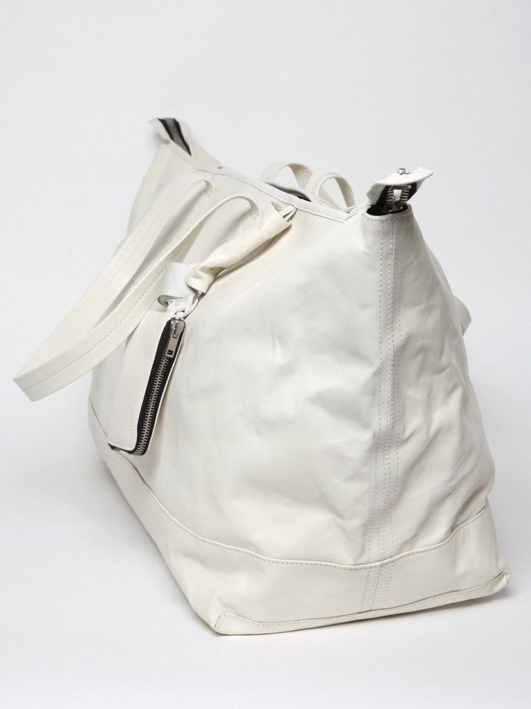 So exasperatedly basic to almost look anonymous, this weekend bag made in Rick Owens immediately turns into an unmissable must-have. Leather and cream, with metal details.