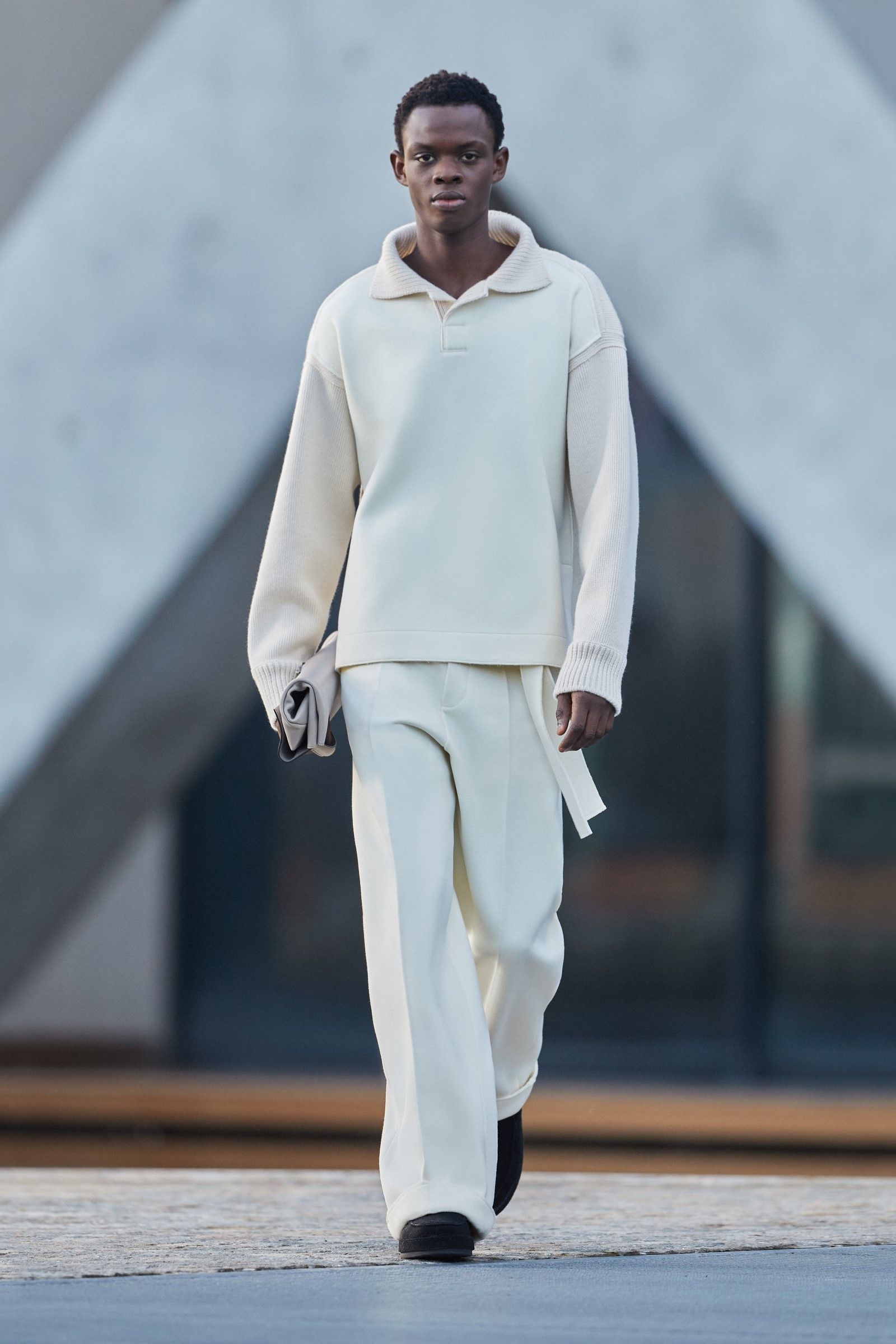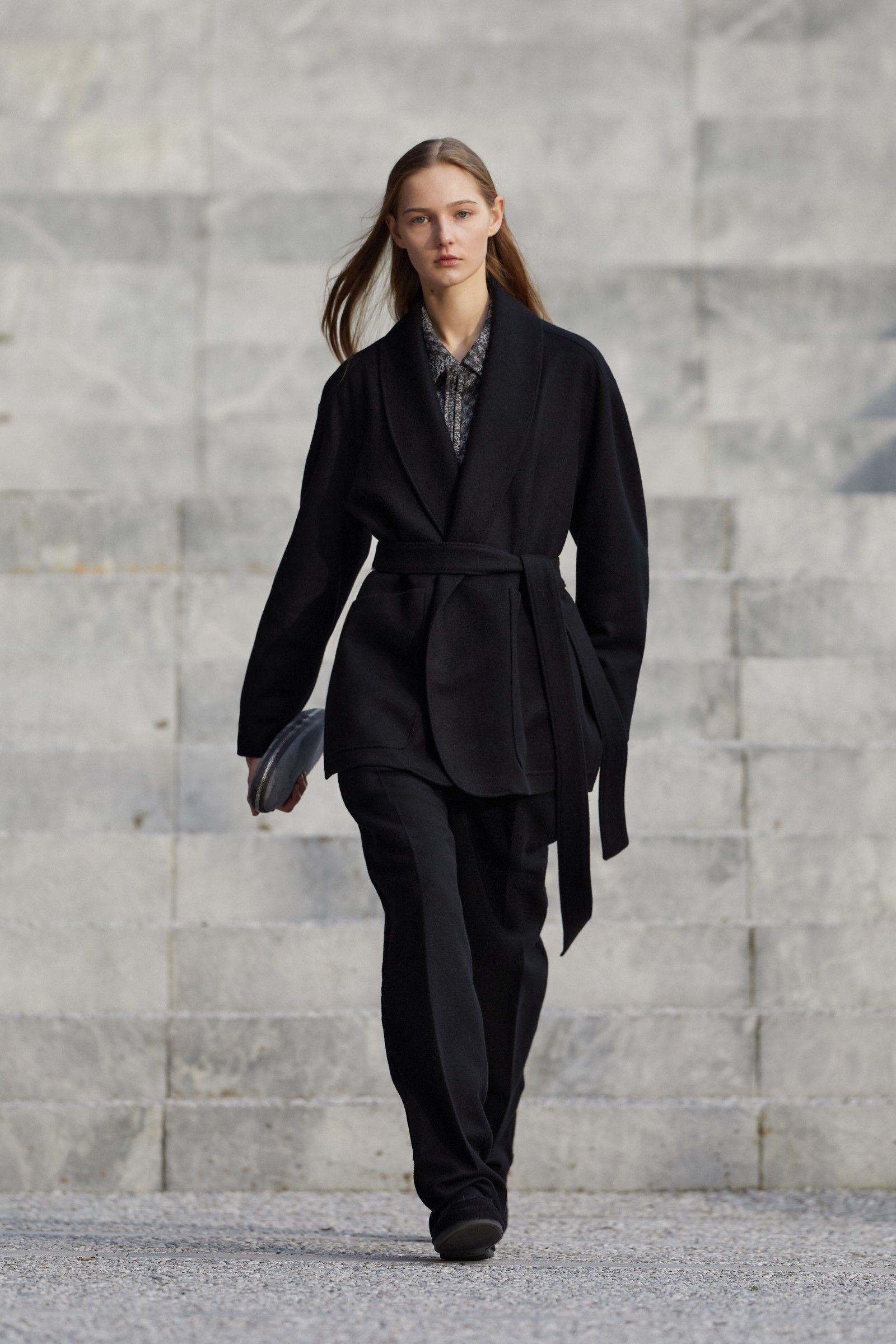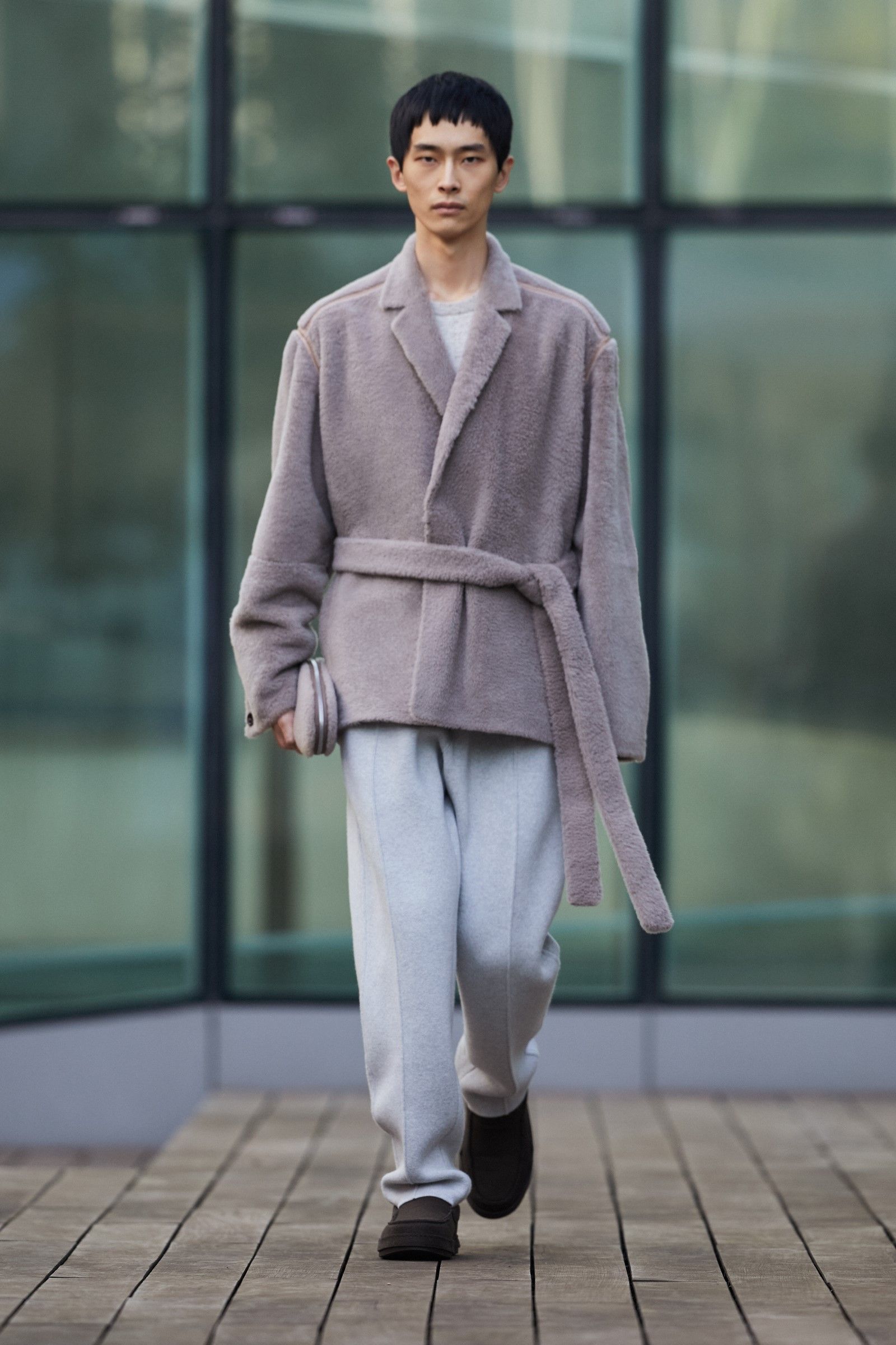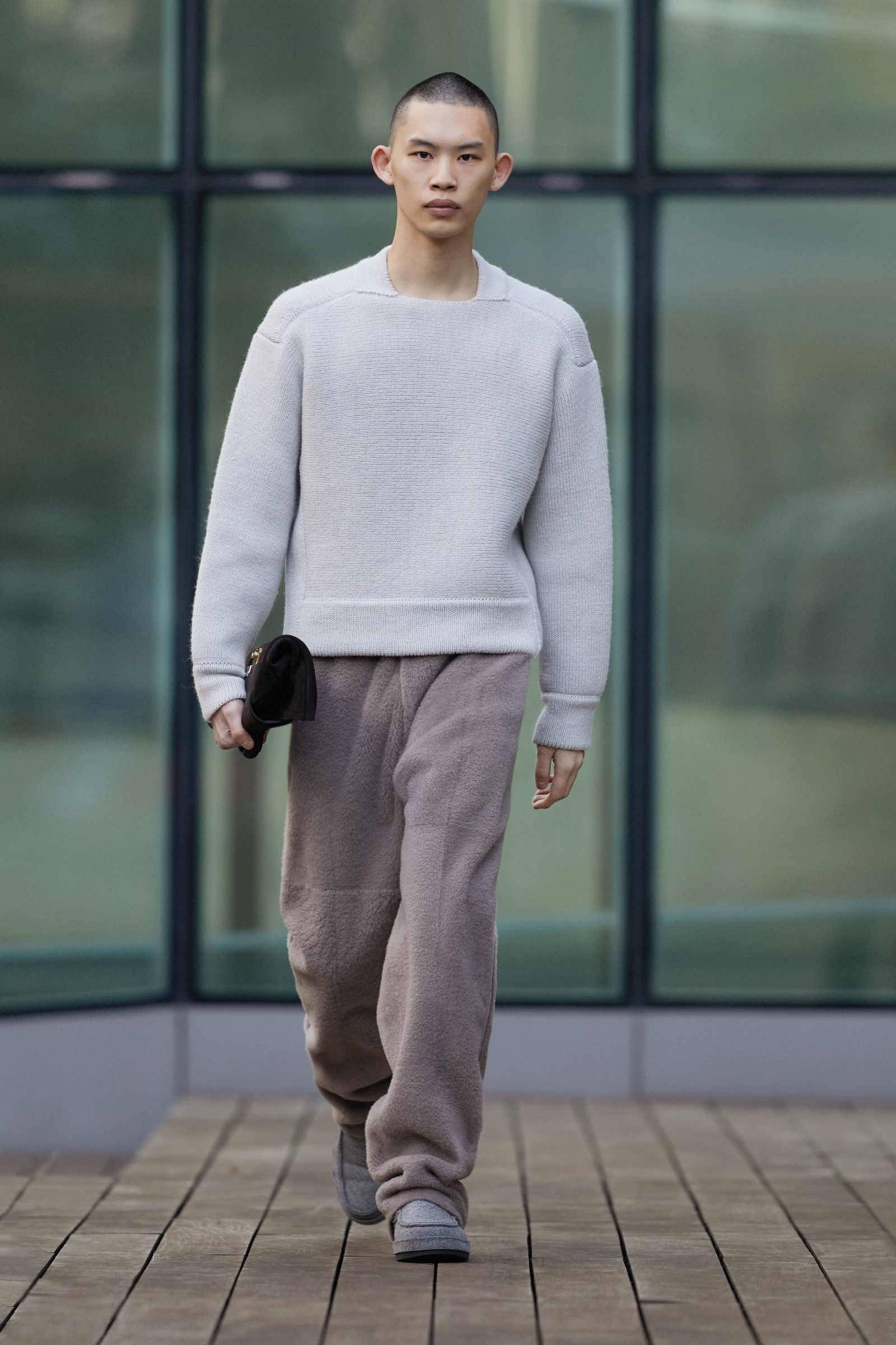 La collezione, dunque, segue un nuovo e più fluido ritmo che ha al suo centro i materiali: nello specifico una nuova generazione di tessuti in jersey che rende le forme dei capi morbide, avvolgenti e adattabili. Pensando i suoi design come espressivi della fusione moderna di interno ed esterno, il lusso del loungewear e quello dell’atelier diventano una cosa sola: collari a scialle e vestaglie pesanti come cappotti, il track-pant diventa un prodotto prezioso e raffinato e persino le pantofole fatte a mano riscrivono i vecchi confini della formalità. Il campo da gioco di questa riscrittura sono le forme, i pesi e i materiali. I cappotti di lavoro in cashmere sostituiscono l’outerwear sportivo, le tute ibride sono in doppio cashmere e si avvicinano ai completi, la maglieria sostituisce le classiche camicie e i pesanti maglioni in cashmere e maglia diventano capispalla. Anche le valigette, simbolo più celebre del mondo del business, vengono decostruite.