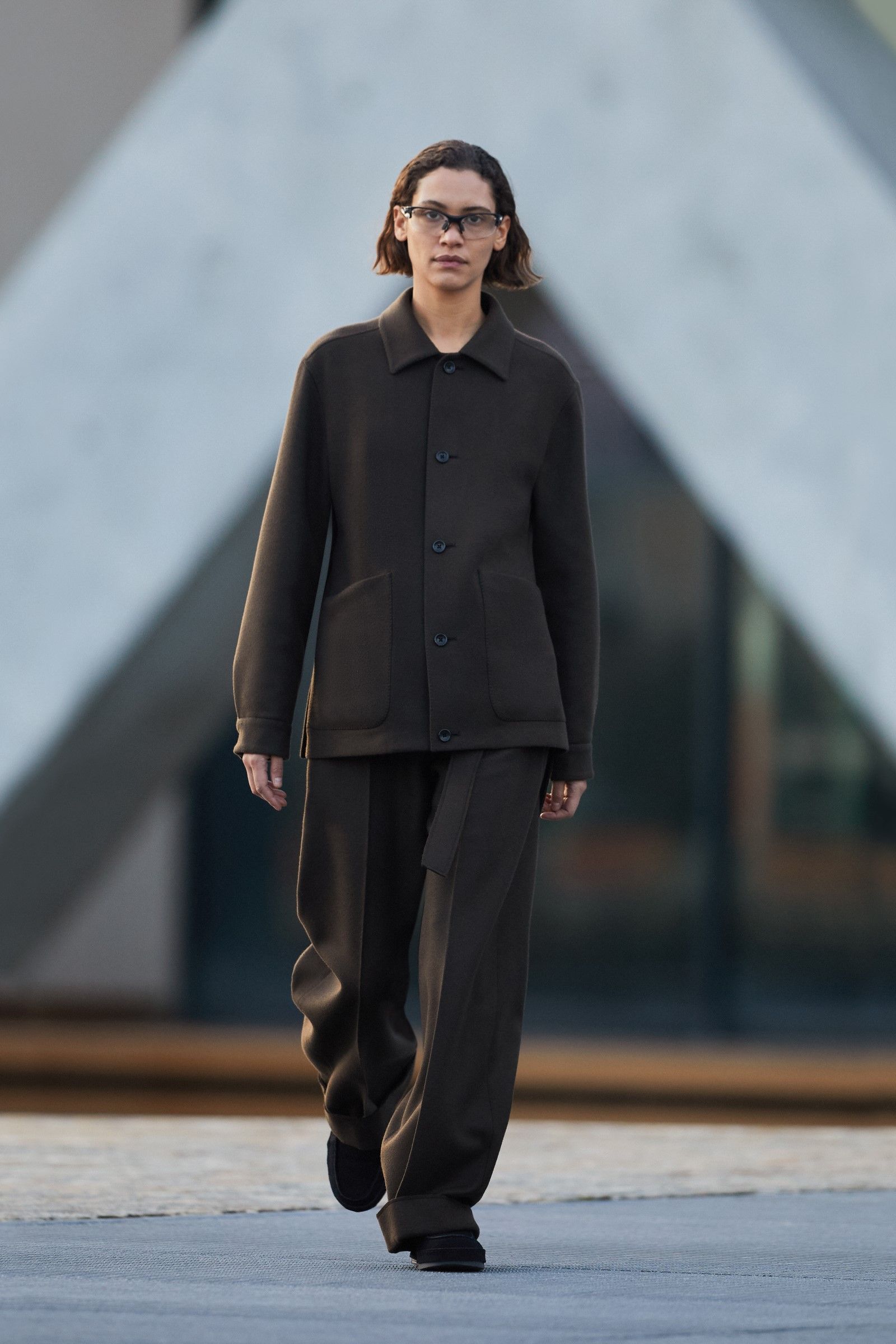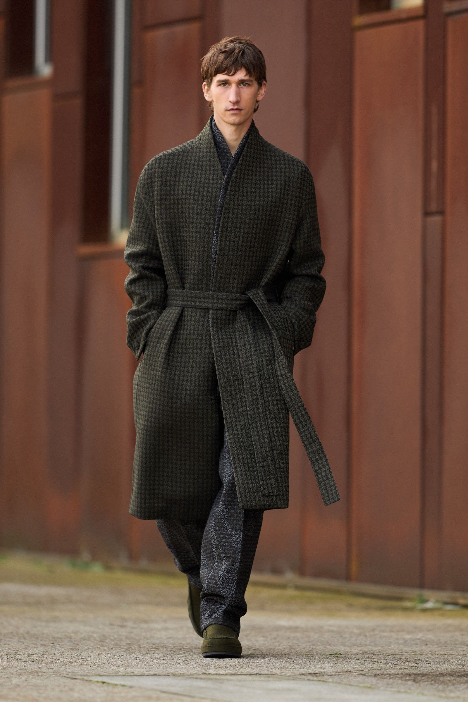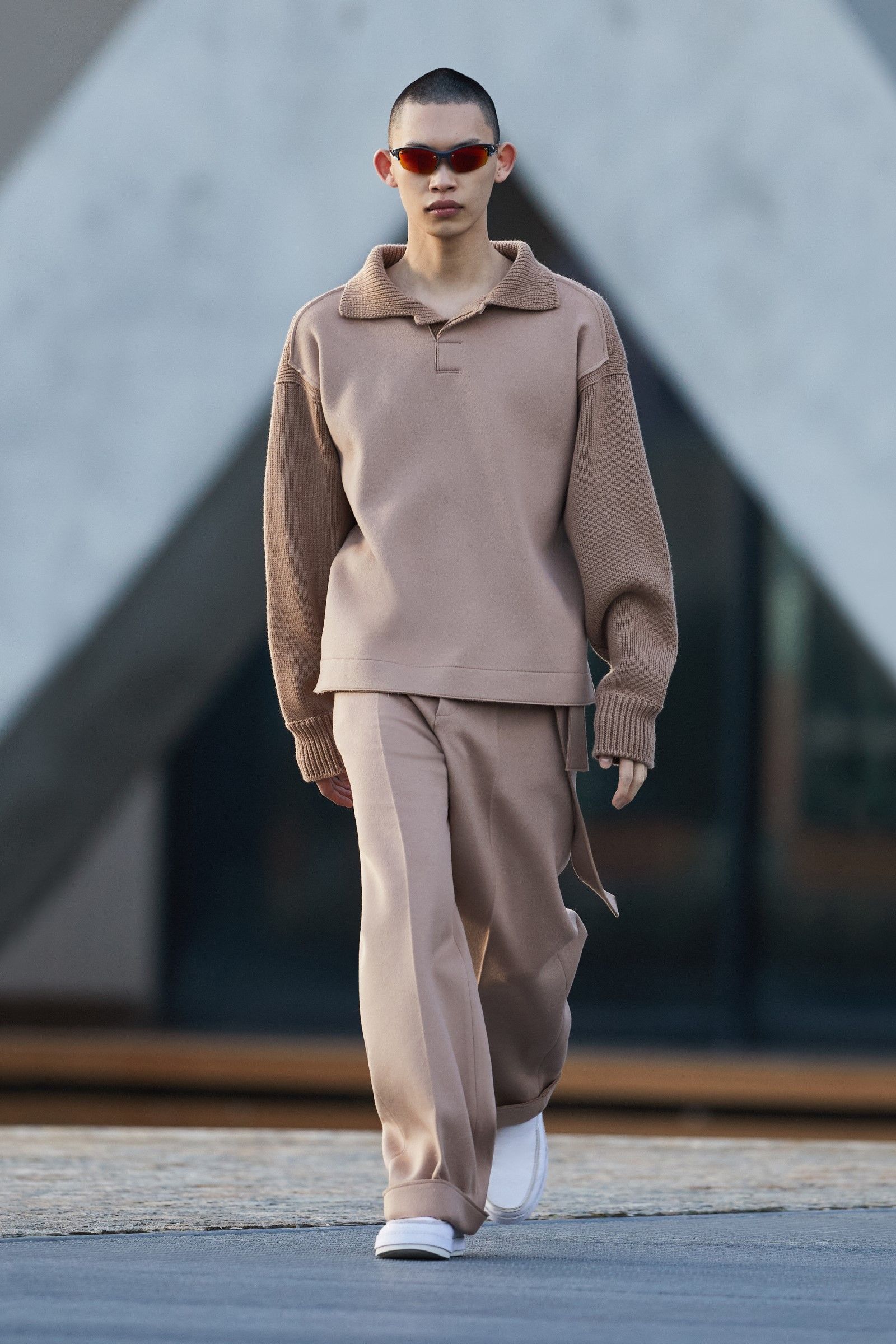 La collezione, dunque, segue un nuovo e più fluido ritmo che ha al suo centro i materiali: nello specifico una nuova generazione di tessuti in jersey che rende le forme dei capi morbide, avvolgenti e adattabili. Pensando i suoi design come espressivi della fusione moderna di interno ed esterno, il lusso del loungewear e quello dell’atelier diventano una cosa sola: collari a scialle e vestaglie pesanti come cappotti, il track-pant diventa un prodotto prezioso e raffinato e persino le pantofole fatte a mano riscrivono i vecchi confini della formalità. Il campo da gioco di questa riscrittura sono le forme, i pesi e i materiali. I cappotti di lavoro in cashmere sostituiscono l’outerwear sportivo, le tute ibride sono in doppio cashmere e si avvicinano ai completi, la maglieria sostituisce le classiche camicie e i pesanti maglioni in cashmere e maglia diventano capispalla. Anche le valigette, simbolo più celebre del mondo del business, vengono decostruite.