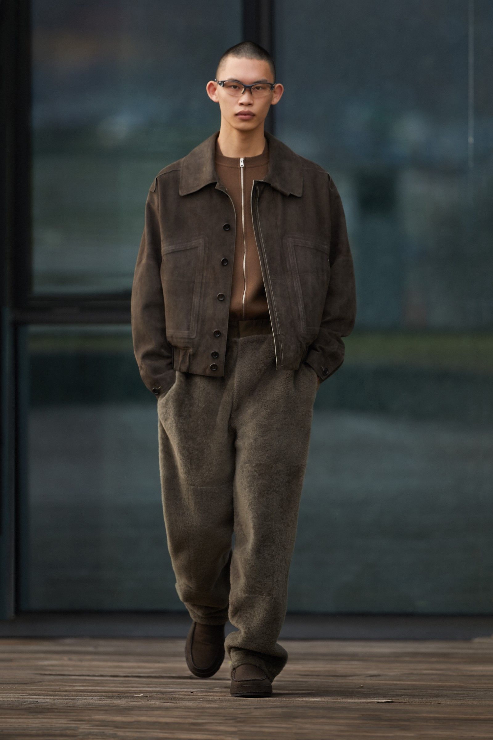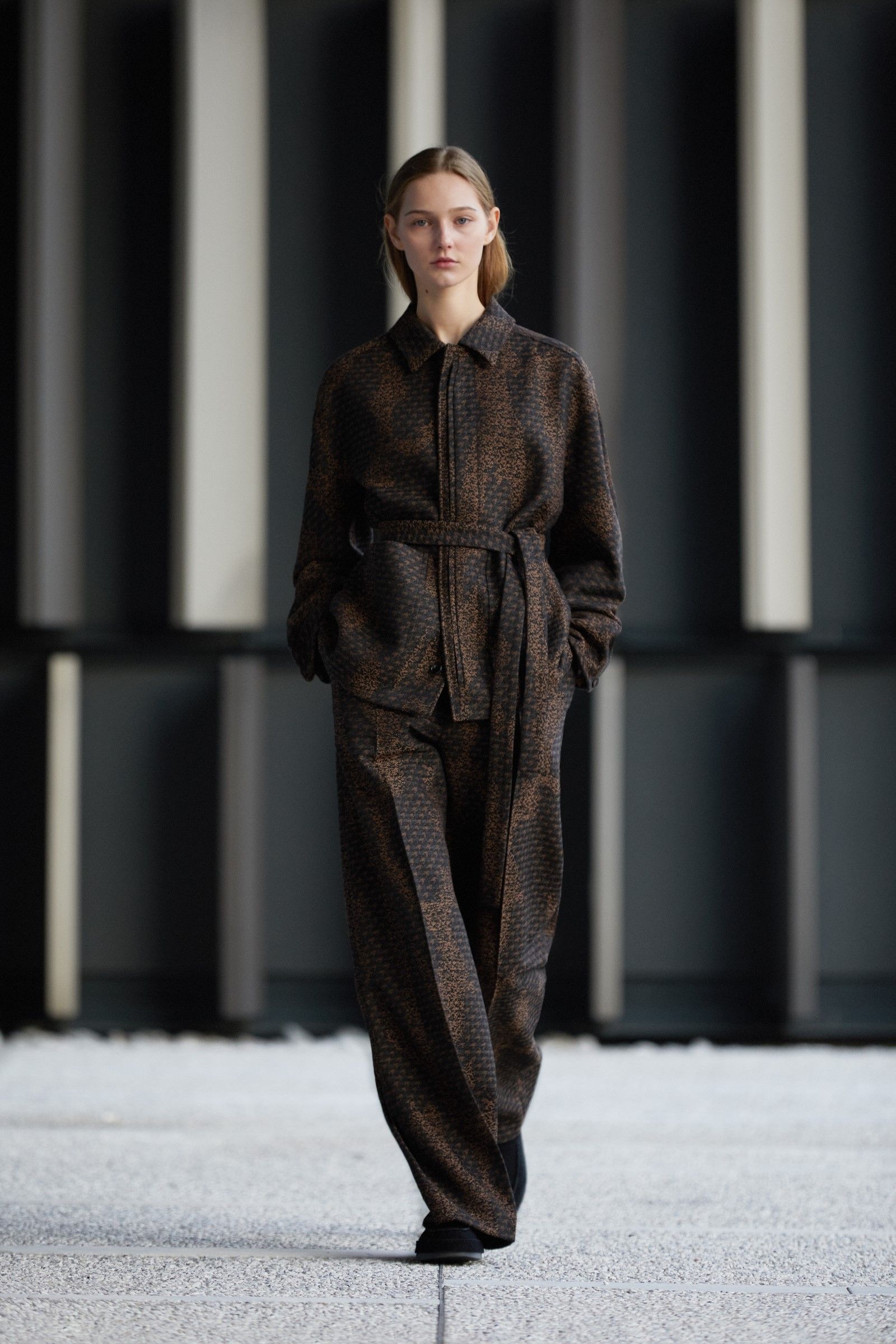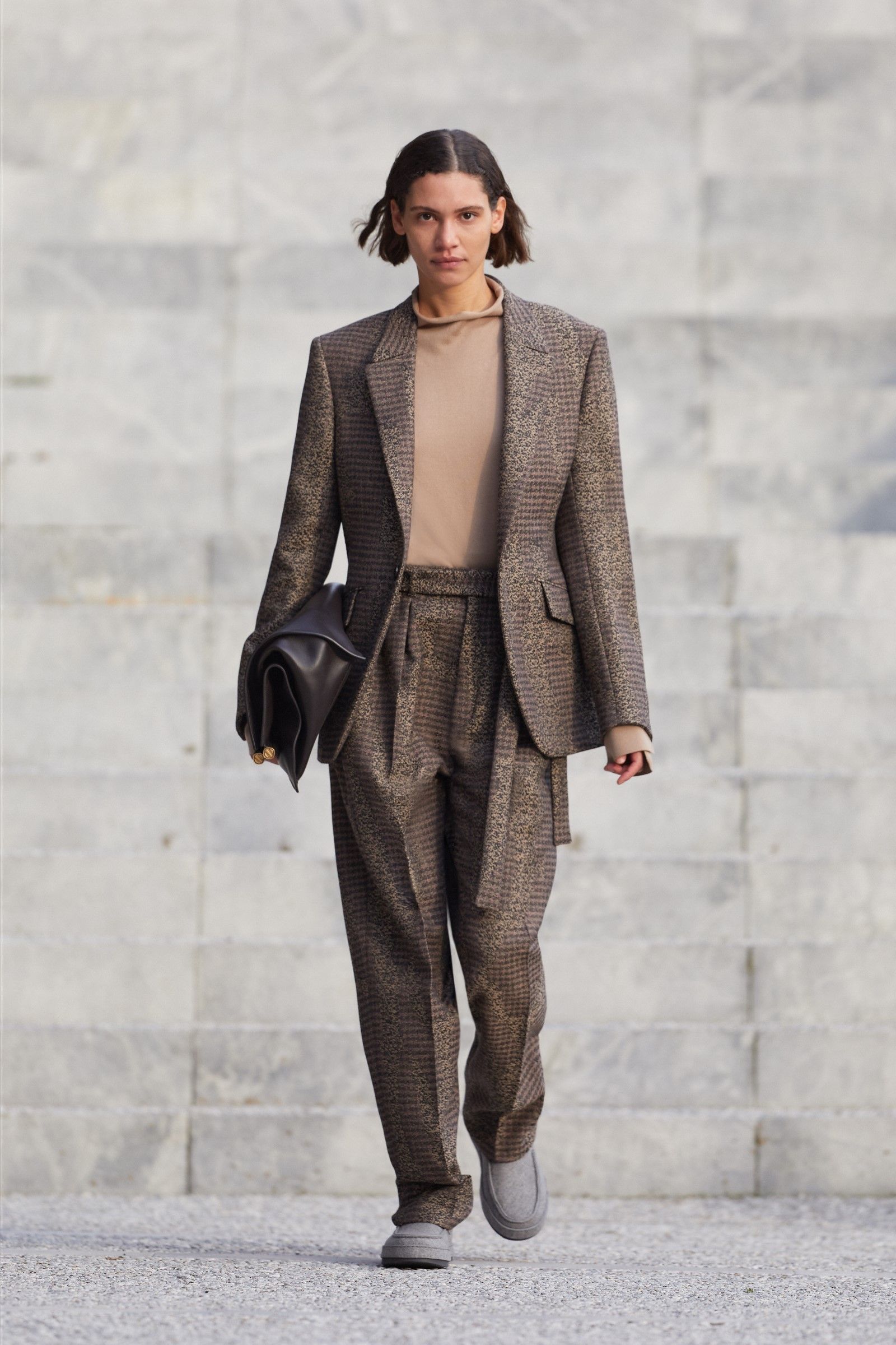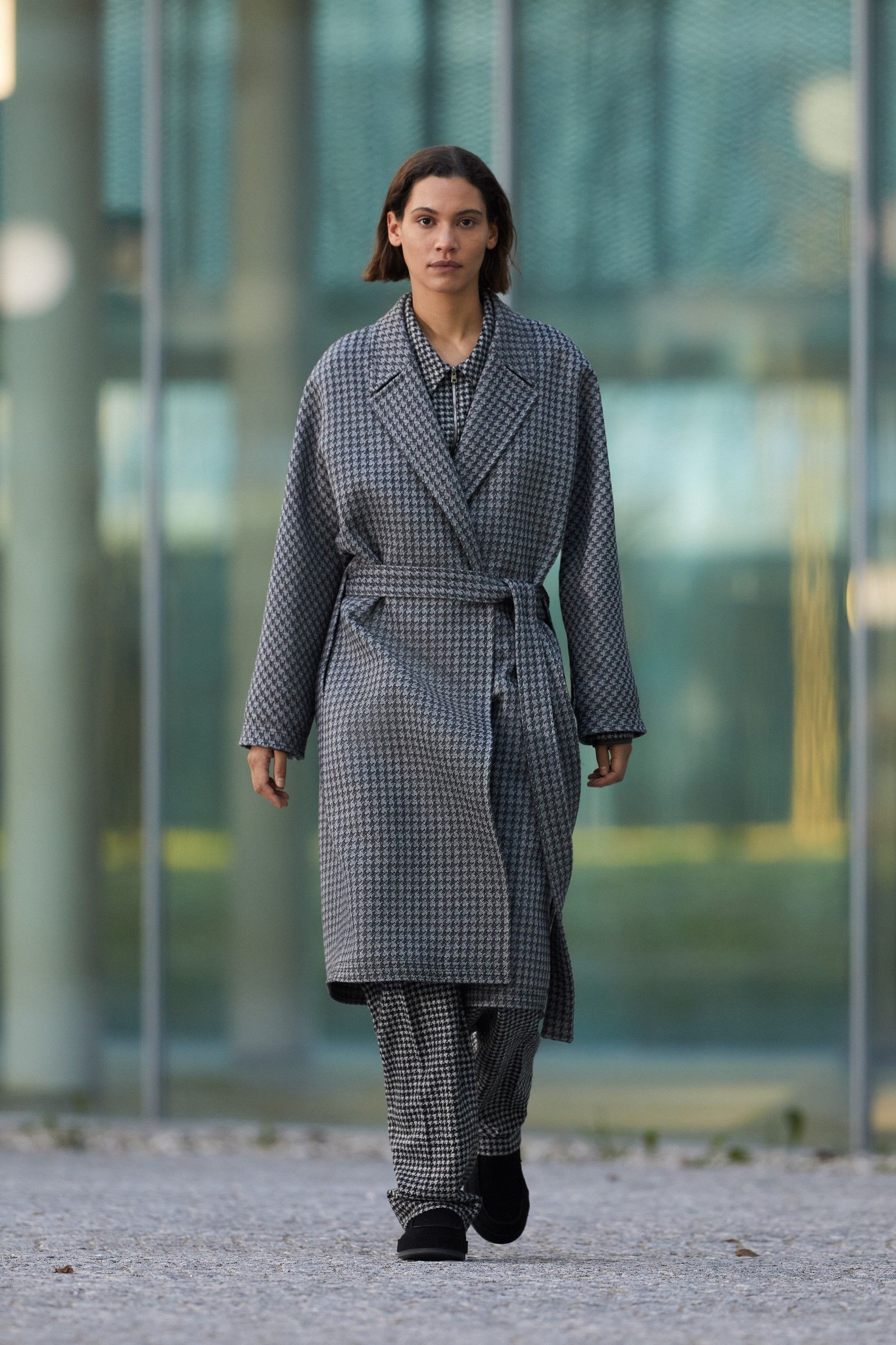 La collezione, dunque, segue un nuovo e più fluido ritmo che ha al suo centro i materiali: nello specifico una nuova generazione di tessuti in jersey che rende le forme dei capi morbide, avvolgenti e adattabili. Pensando i suoi design come espressivi della fusione moderna di interno ed esterno, il lusso del loungewear e quello dell’atelier diventano una cosa sola: collari a scialle e vestaglie pesanti come cappotti, il track-pant diventa un prodotto prezioso e raffinato e persino le pantofole fatte a mano riscrivono i vecchi confini della formalità. Il campo da gioco di questa riscrittura sono le forme, i pesi e i materiali. I cappotti di lavoro in cashmere sostituiscono l’outerwear sportivo, le tute ibride sono in doppio cashmere e si avvicinano ai completi, la maglieria sostituisce le classiche camicie e i pesanti maglioni in cashmere e maglia diventano capispalla. Anche le valigette, simbolo più celebre del mondo del business, vengono decostruite.