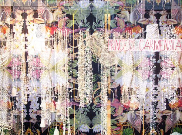 Dolce mestizia colorata, gioielli oversize, totalizzanti e ornamentali: amazzoni di Bollywood, e da mille e una notte. Raffinate e magnetiche, androgine e romantiche. Esotismo wallpaper, per riempire le pareti dei nostri sogni, e delle nostre ispirazioni. Colore acceso dall'oscurità della notte, e fantasie impresse in un motivo che sinuosamente si evolve e si specchia. Vestiti couture, dettagli minuziosi.