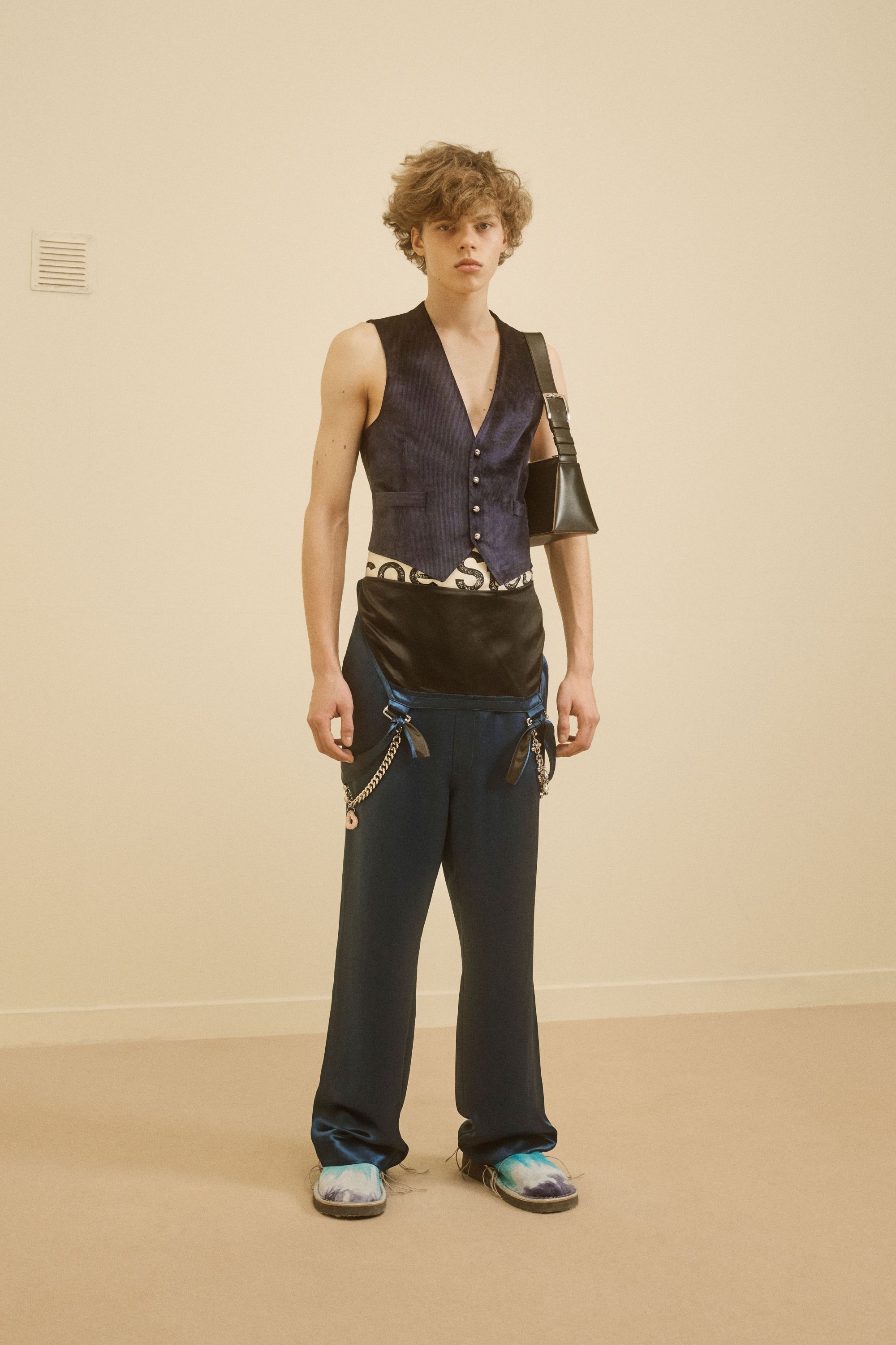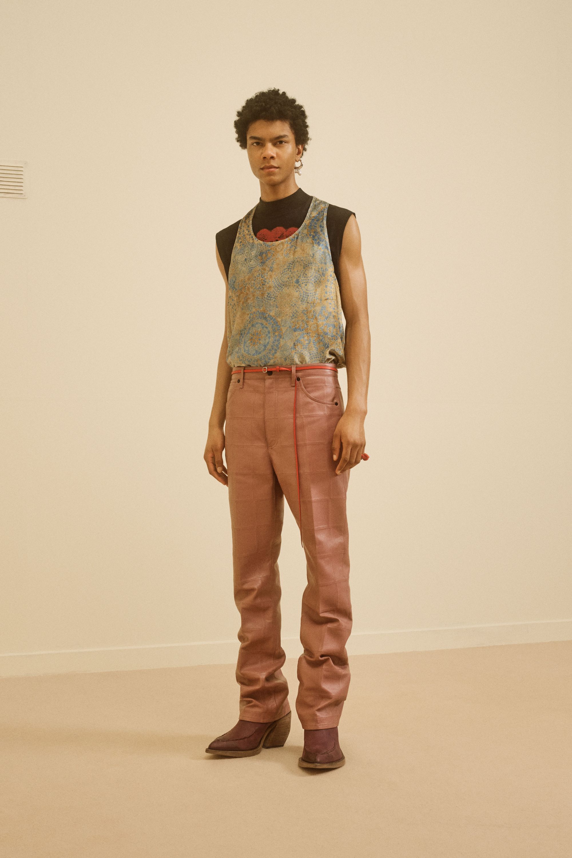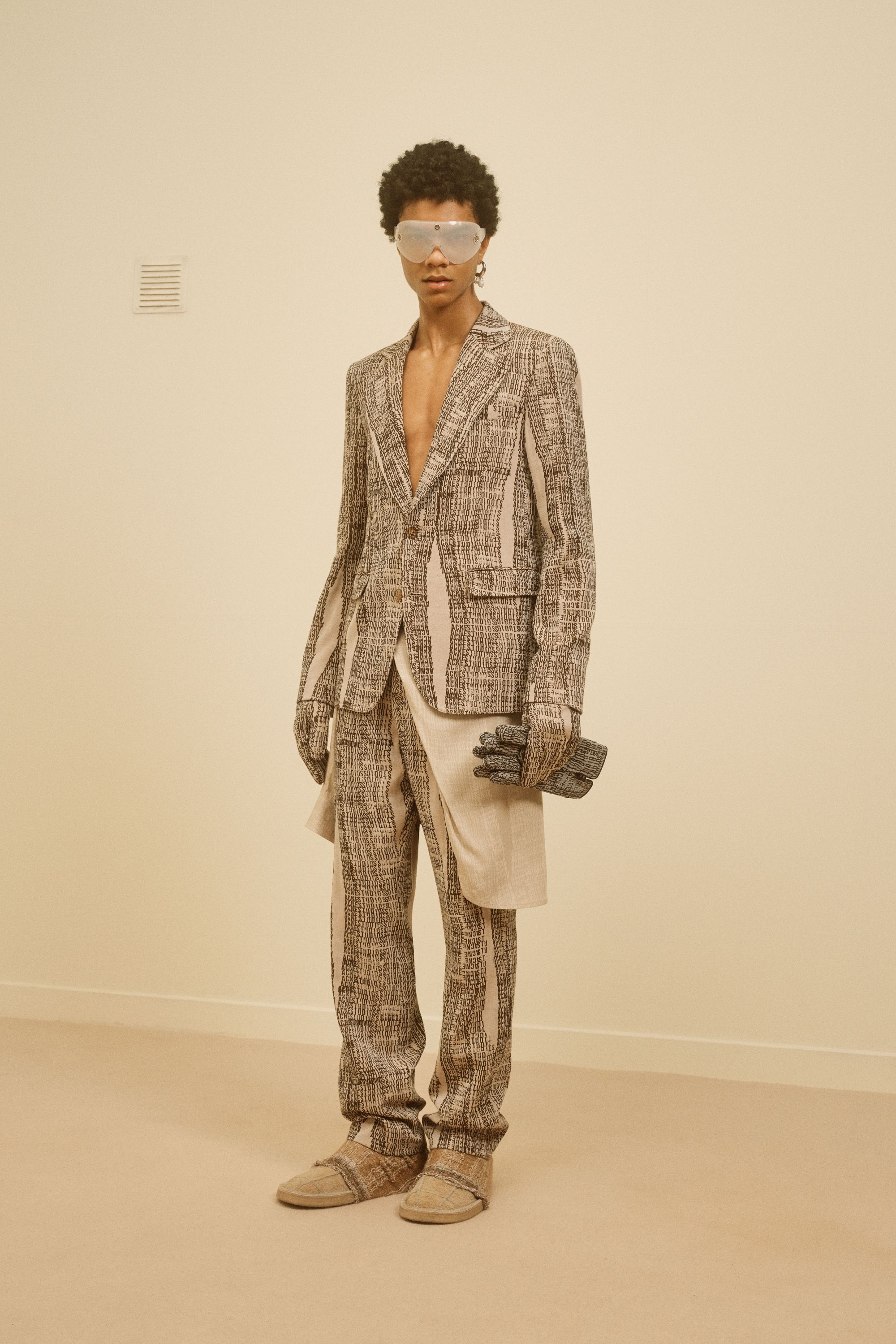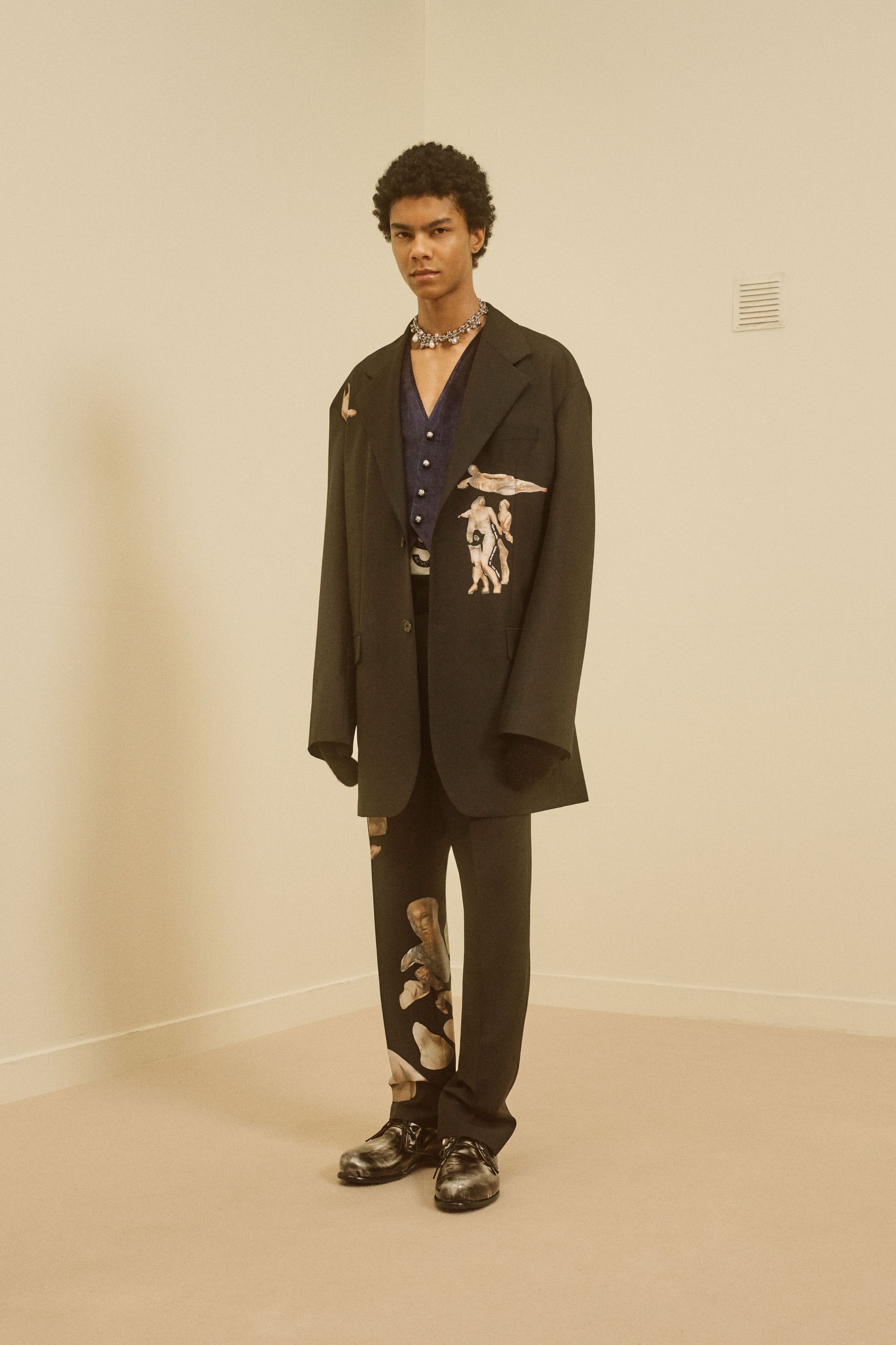 Alcuni abiti mantengono l'immaginario simbolo del brand, come una giacca doppio petto decorata da bottoni madreperla, mentre altri trasformano la formalità classica, come nel caso del tessuto tagliato in un materiale ripstop e stampato con un patchwork di denim. I materiali sartoriali diventano la base per capi casual, mentre su alcuni pezzi il collaboratore della Maison Robbie Barrat ha realizzato delle stampe che rielaborano l'immaginario classico.