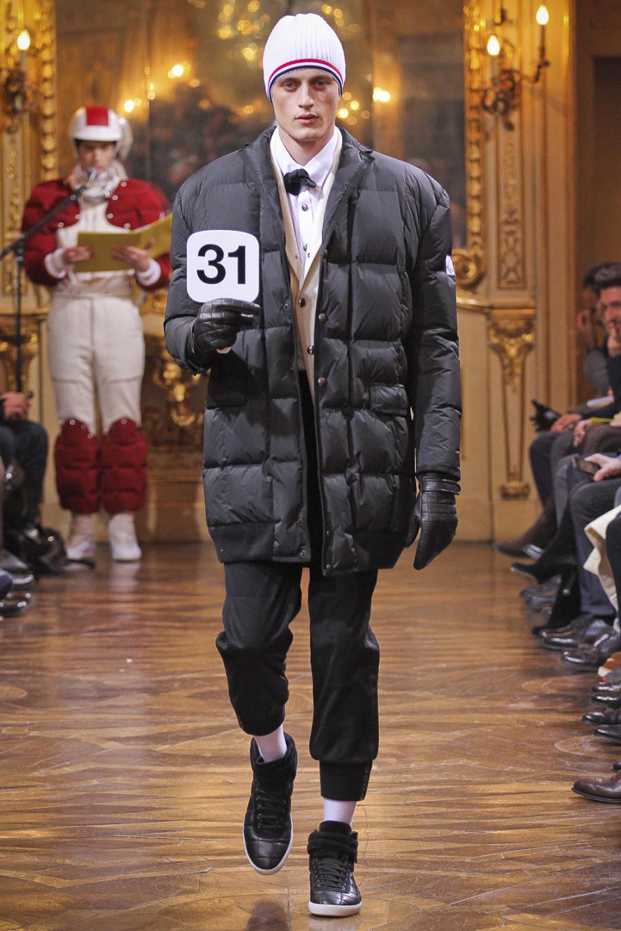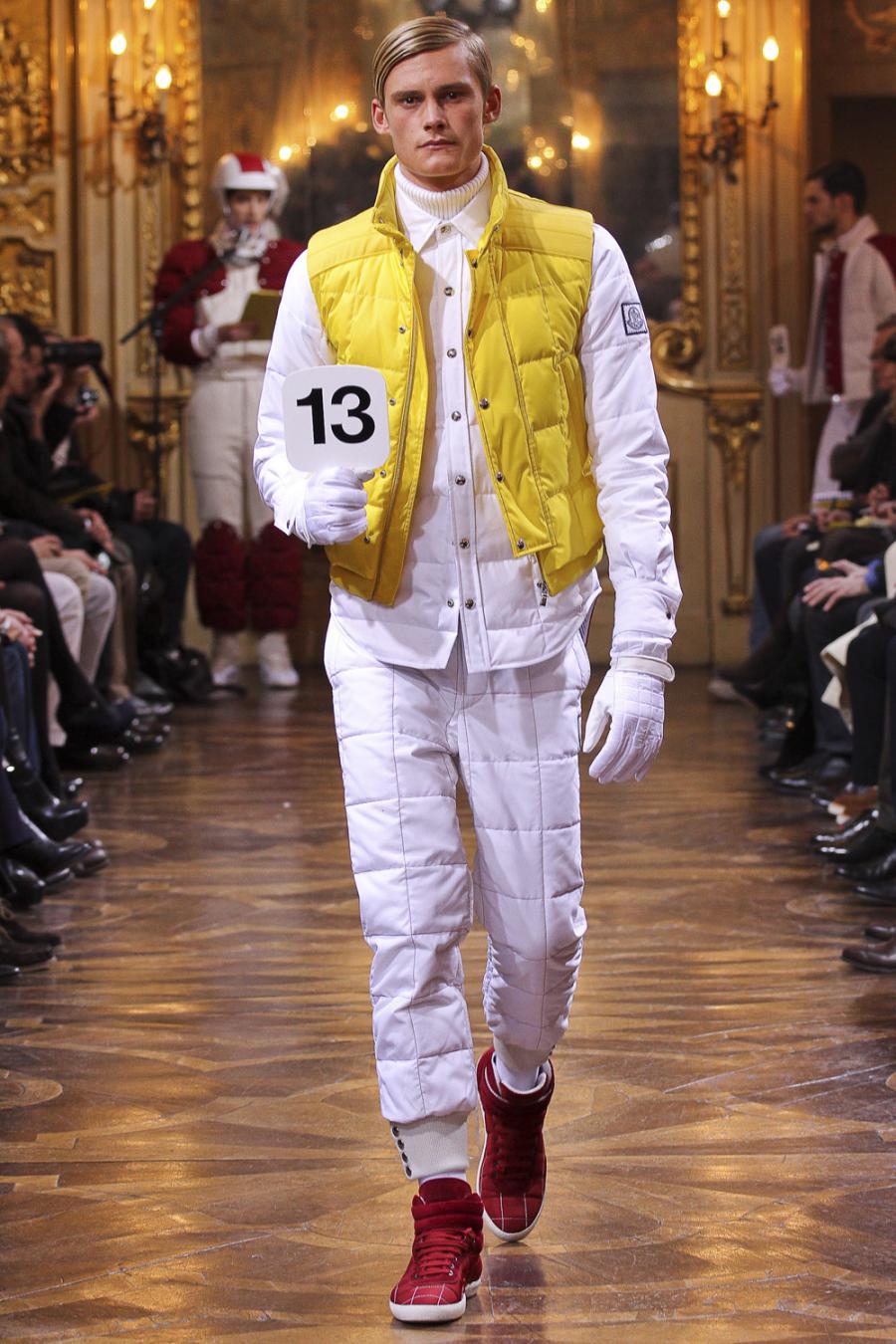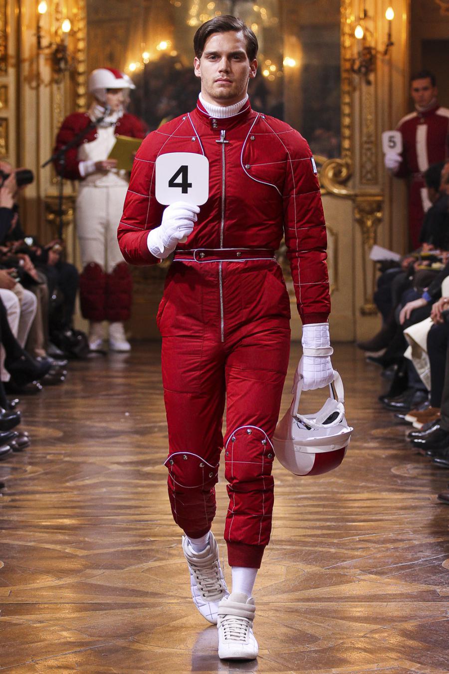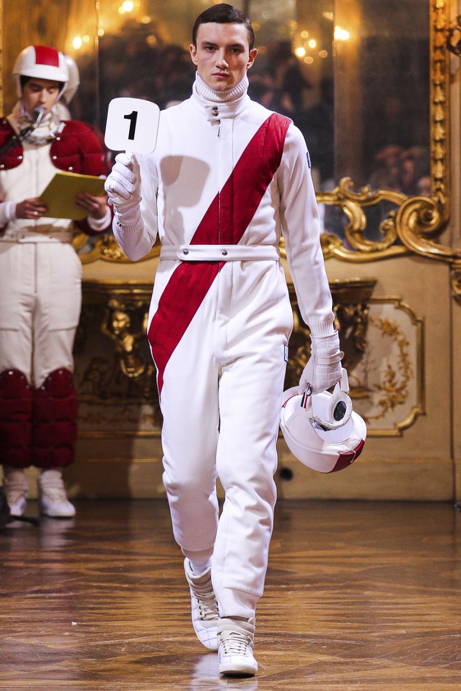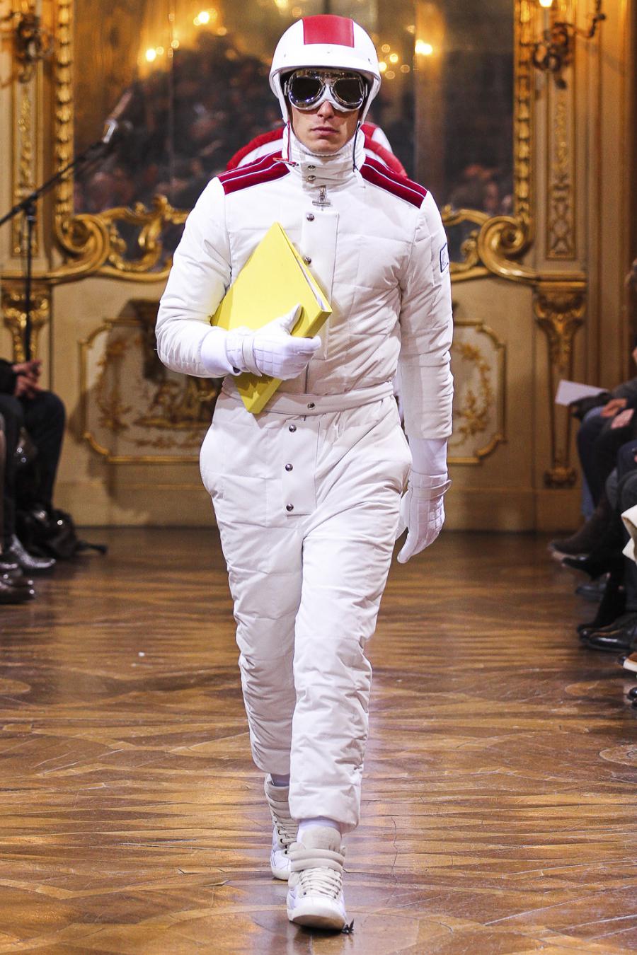 Moncler Gamme Bleu reflects the synergy of Moncler’s expertise in active sportswear and outerwear with the hand-made tailoring sensibility of Thom Browne. For Fall/Winter 2012, the concept centers around Formula One car racing. Race car gear inspired jumpsuits, jackets with quilting, trousers with elasticated rib cuffs and down filled quilted flared trousers are some of the new silhouettes. Classic tailored pieces: suits, sport coats, Chesterfield coat, trench, capes, cardigan, shirts, trousers, and shorts all with different levels for quilting. A full-collection, divided in four inspiration groups including outerwear, trousers, shorts, jackets, shirts, sweaters and accessories: red/white group, red/white/yellow group, navy and grey group, and a black tie, formal group. Fabrics and detailing: cashmere suiting, combed wool flannels, pinstripe wool flannel, wool flannel in plaid, Calvary wool twill as well as quintessential Moncler technical fabrics such as cordura and nylon ripstop. Accessories: racing shoes, racing helmets and gloves.
