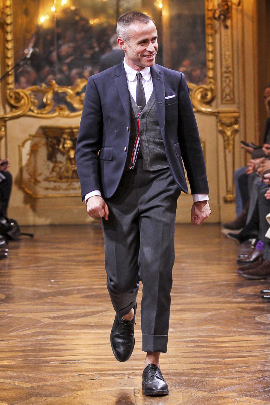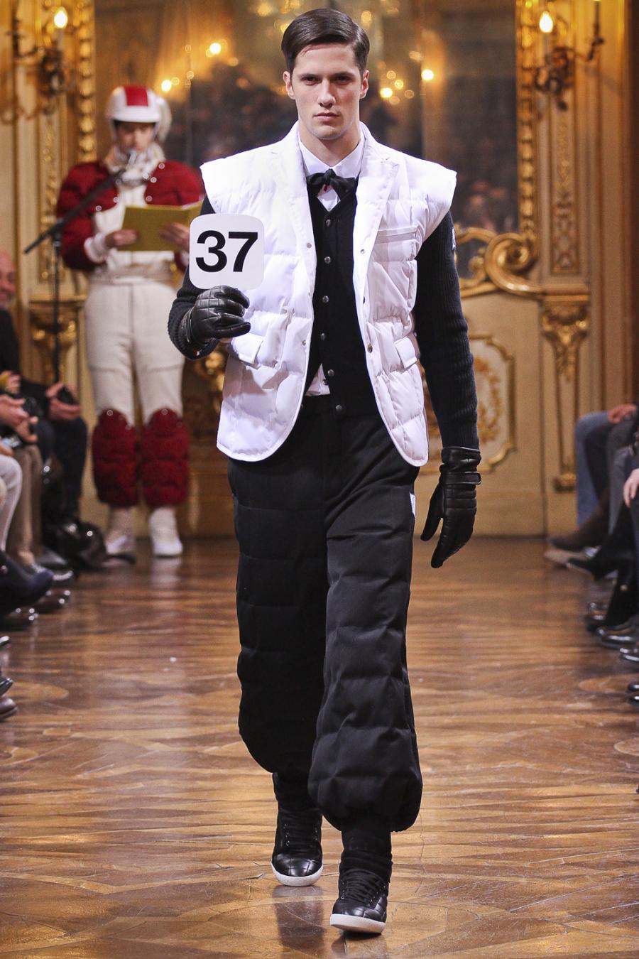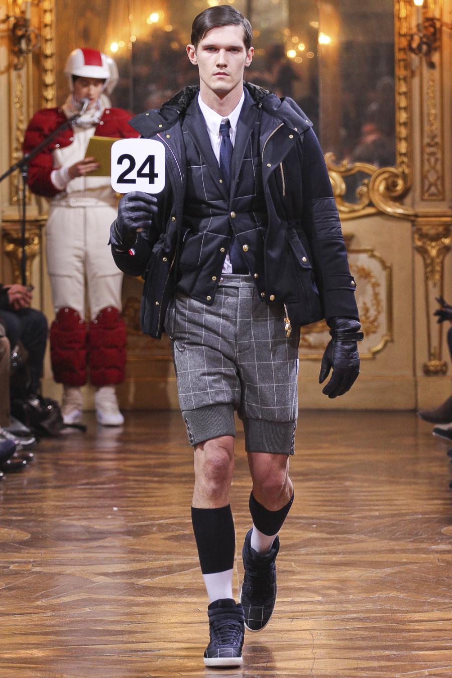 Moncler Gamme Bleu rispecchia le sinergie tra l’expertise Moncler nell’active sportswear e outerwear e la sensibilità sartoriale del capo fatto a mano che contraddistingue Thom Browne. Per l’Autunno/Inverno 2012, il concept è incentrato sul mondo della Formula Uno. Tra le nuove proposte, tutte ispirate all’abbigliamento dei piloti, troviamo le tute, le giacche trapuntate, i pantaloni col bordo a costine elasticizzato e quelli a zampa trapuntati e imbottiti di piumino. A questi si aggiungono i classici sartoriali: completi, giacche sportive, cappotti Chesterfield, trench, mantelle, cardigan, camicie, pantaloni e shorts – tutti con gradi diversi di imbottitura. Una collezione completa, suddivisa in quattro gruppi distinti a seconda della fonte di ispirazione e comprendenti capispalla, pantaloni, shorts, giacche, camicie, pullover e accessori: rosso/bianco, rosso/bianco/giallo, blu e grigio, formale – black tie. Tessuti e finiture: tessuti in cashmere, flanelle in lana pettinata, flanella in lana a motivo gessato, Flanella in lana scozzese, calvary twill di lana e, ovviamente, i materiali tecnici che hanno fatto la storia di Moncler, come cordura e ripstop nylon. Accessori: scarpe, caschi e guanti da corsa.