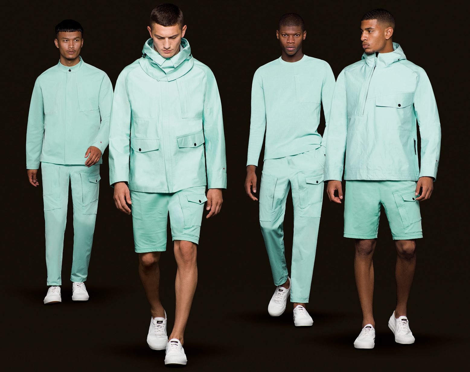 Fra i filati più particolari che sono stati utilizzati c’è il Seaqual® Yarn, un filato di poliestere riciclato post-consumo al 100% di alta qualità, contenente circa il 10% di plastica marina riciclata da Seaqual Initiative (da rifiuti marini in plastica), il restante 90% è PET post-consumo proveniente da fonti terrestri. Il resto dei capi è composto da cotone e nylon accoppiati a una membrana traspirante interna che rende gli item impermeabili e anti-vento.