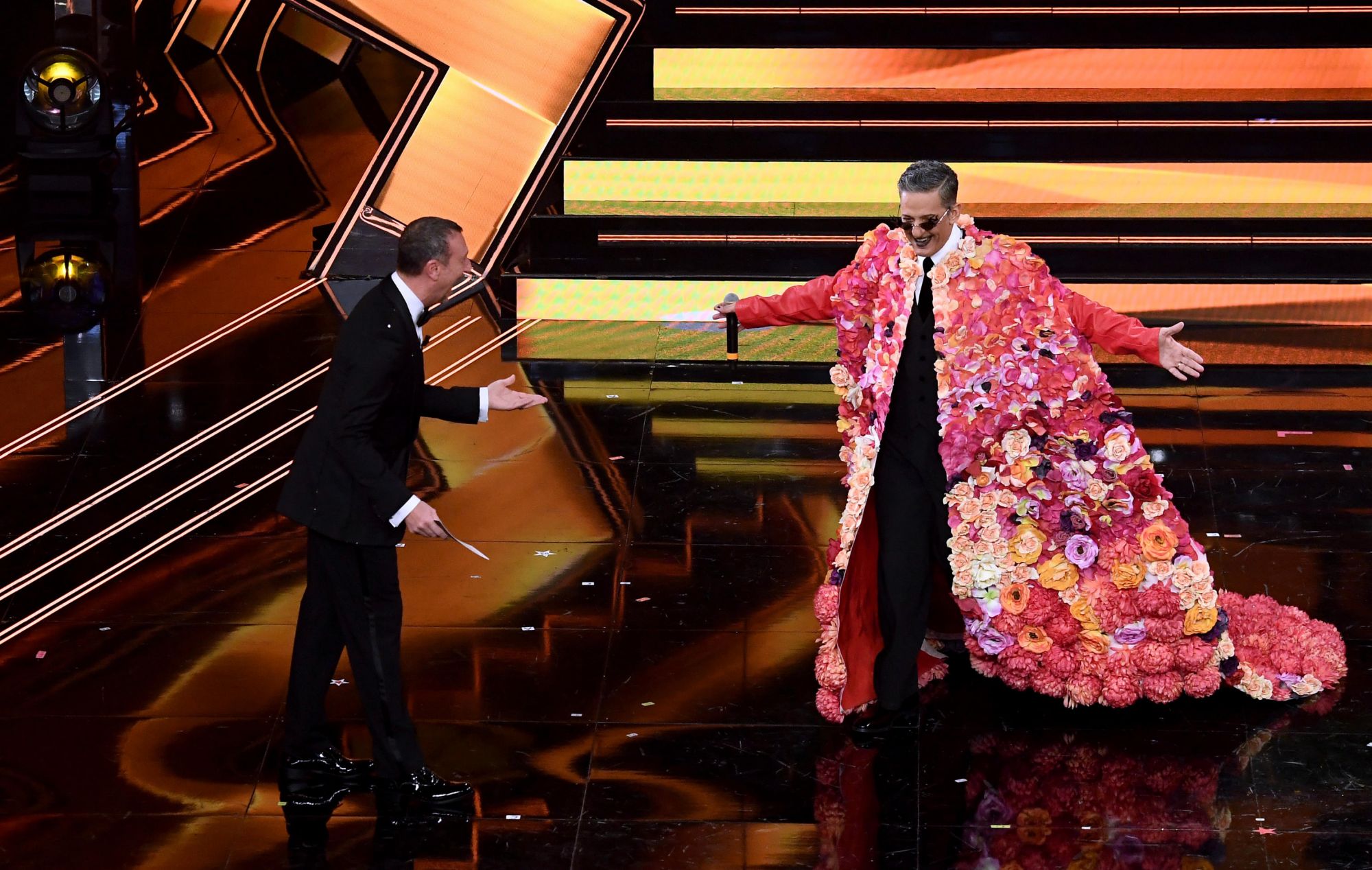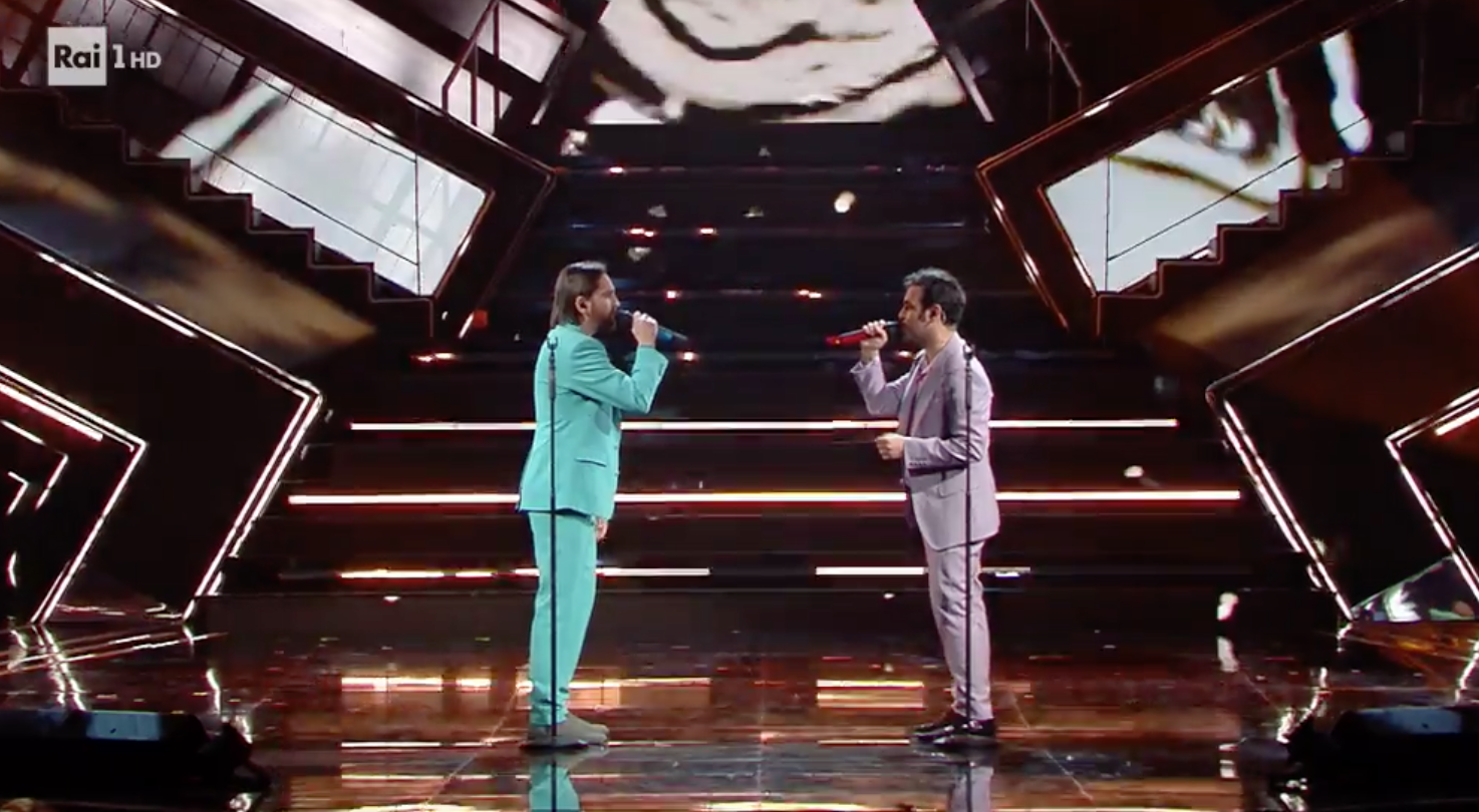 Ogni appassionato di cinema avrà avuto un flashback dell'horror Midsommar di Ari Aster nel vedere Fiorello ricoperto da una campana di fiori, ma il suo look retrò (ispirato a Totò?) in full Giorgio Armani ha centrato il punto.